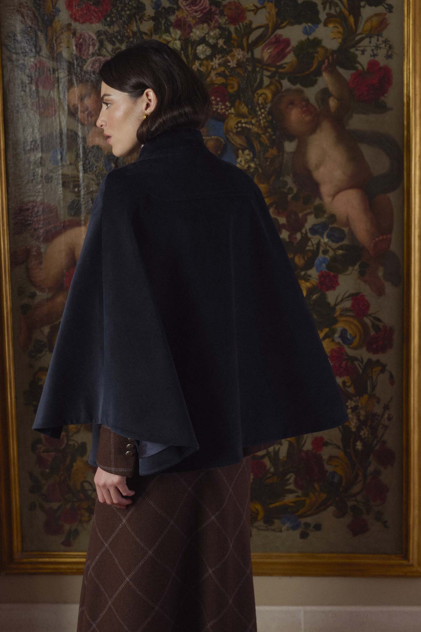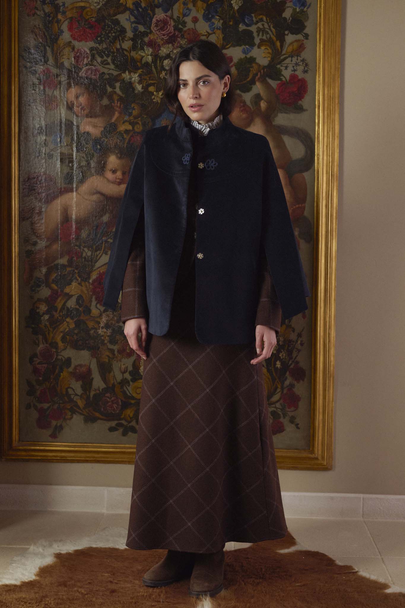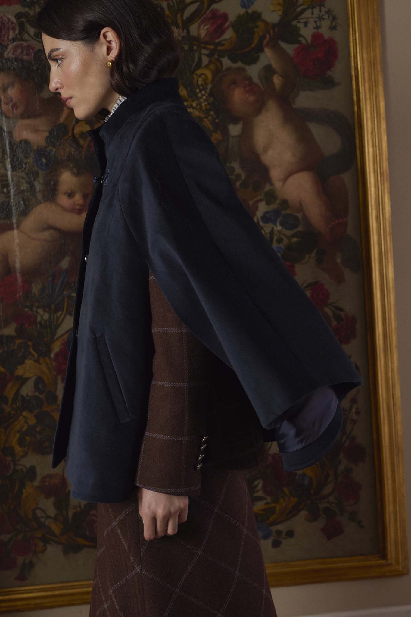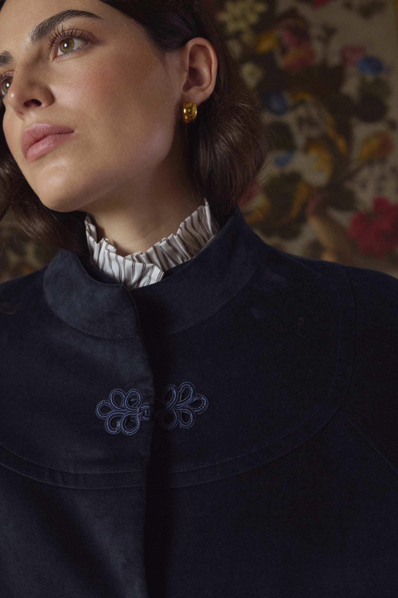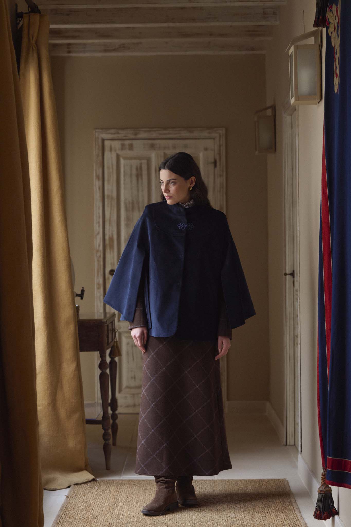 Capa en terciopelo azul, de silueta amplia con cuello alto, cierre frontal con alamar decorativo en la parte superior. Con forro interior completo. Su confección artesana en España se percibe en cada detalle y en la calidad de una prenda a la par clásica que original.