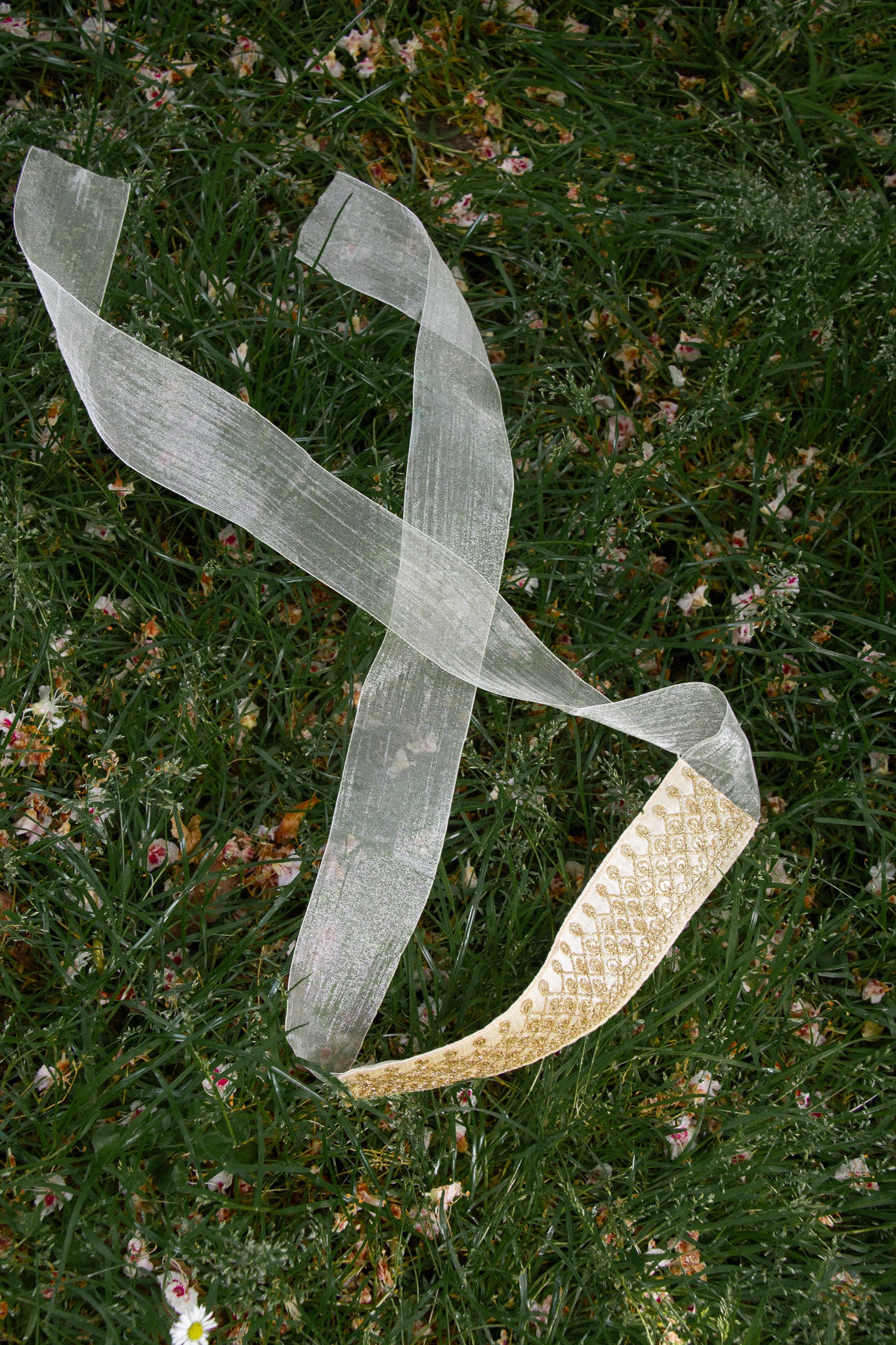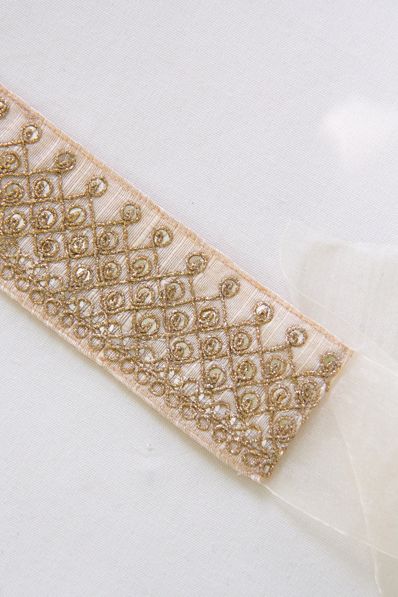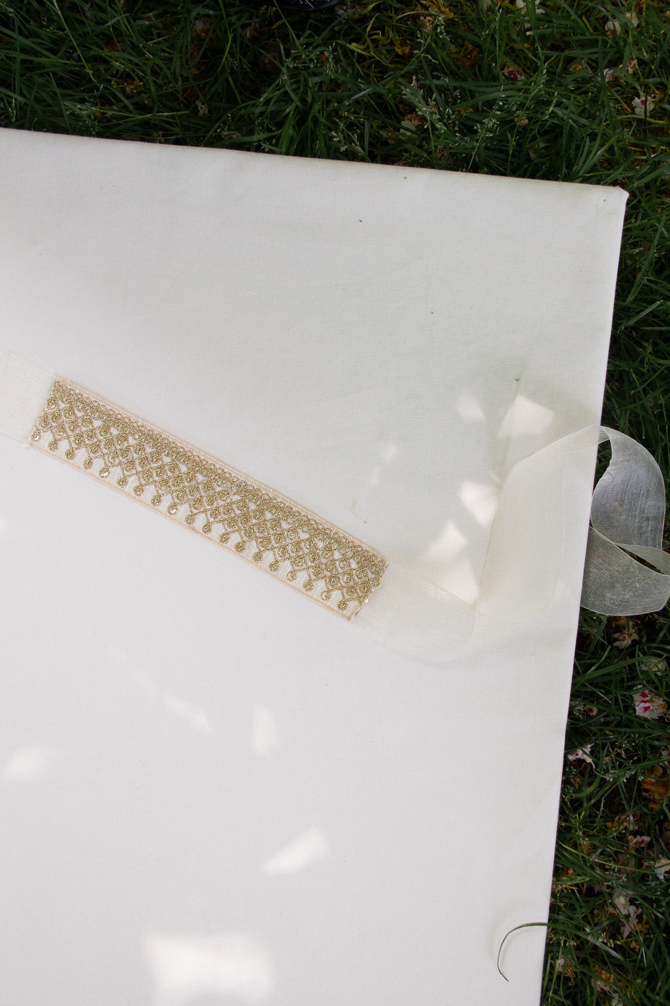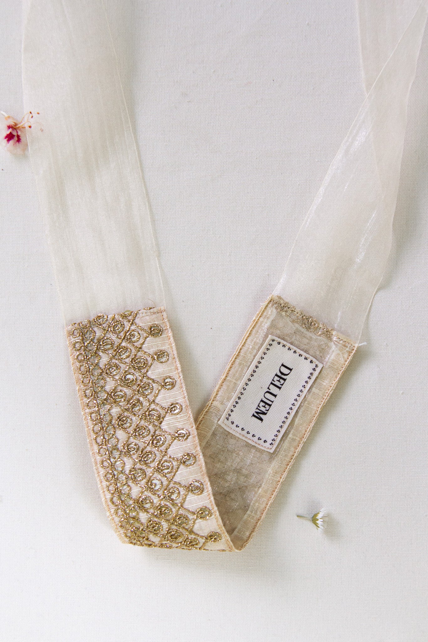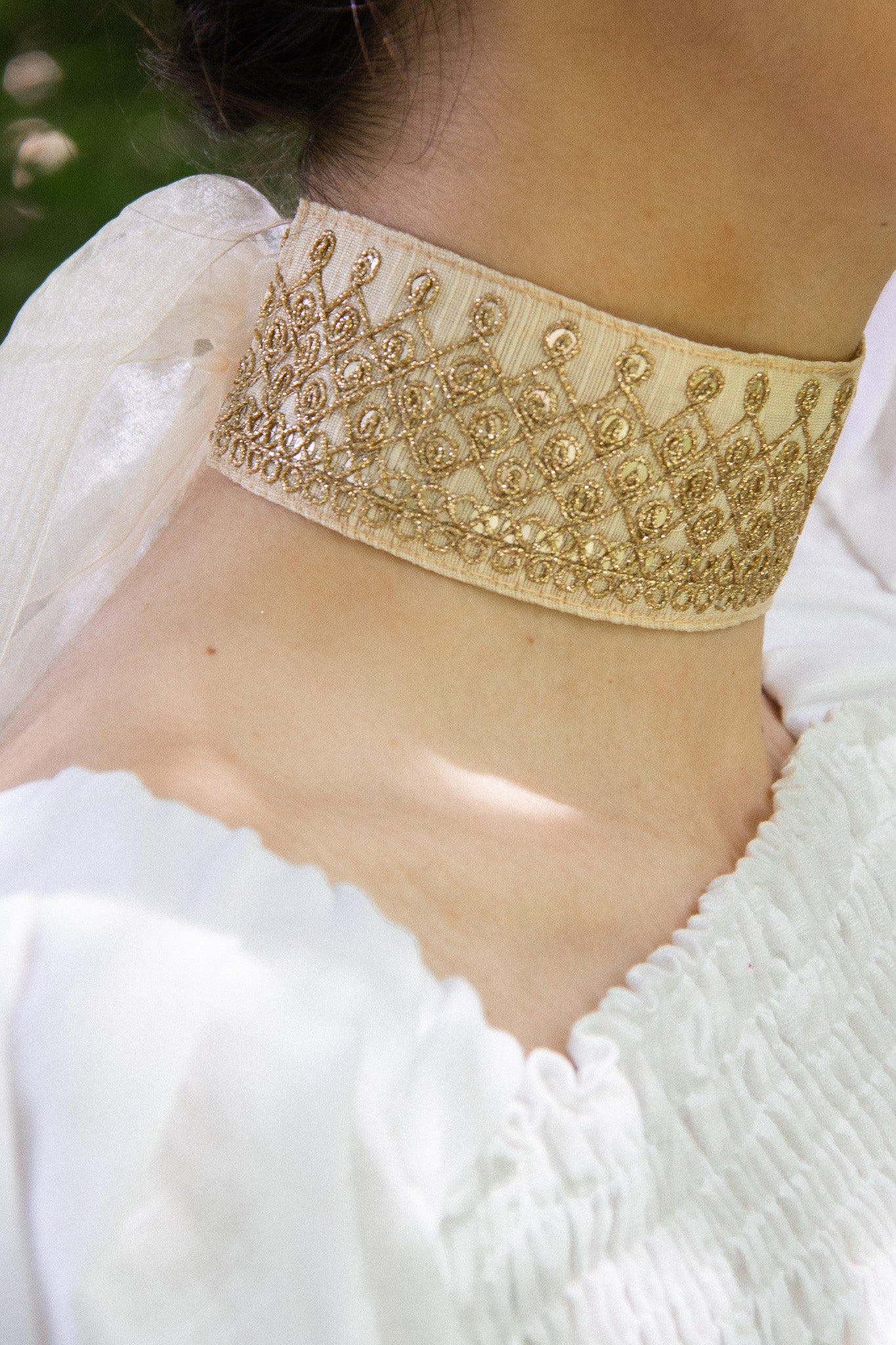 Choker bordado en oro y cinta de organza cruda. El toque perfecto para llevar tus looks de invitada, fiesta y evento a otro nivel, o para elevar cualquier look casual.