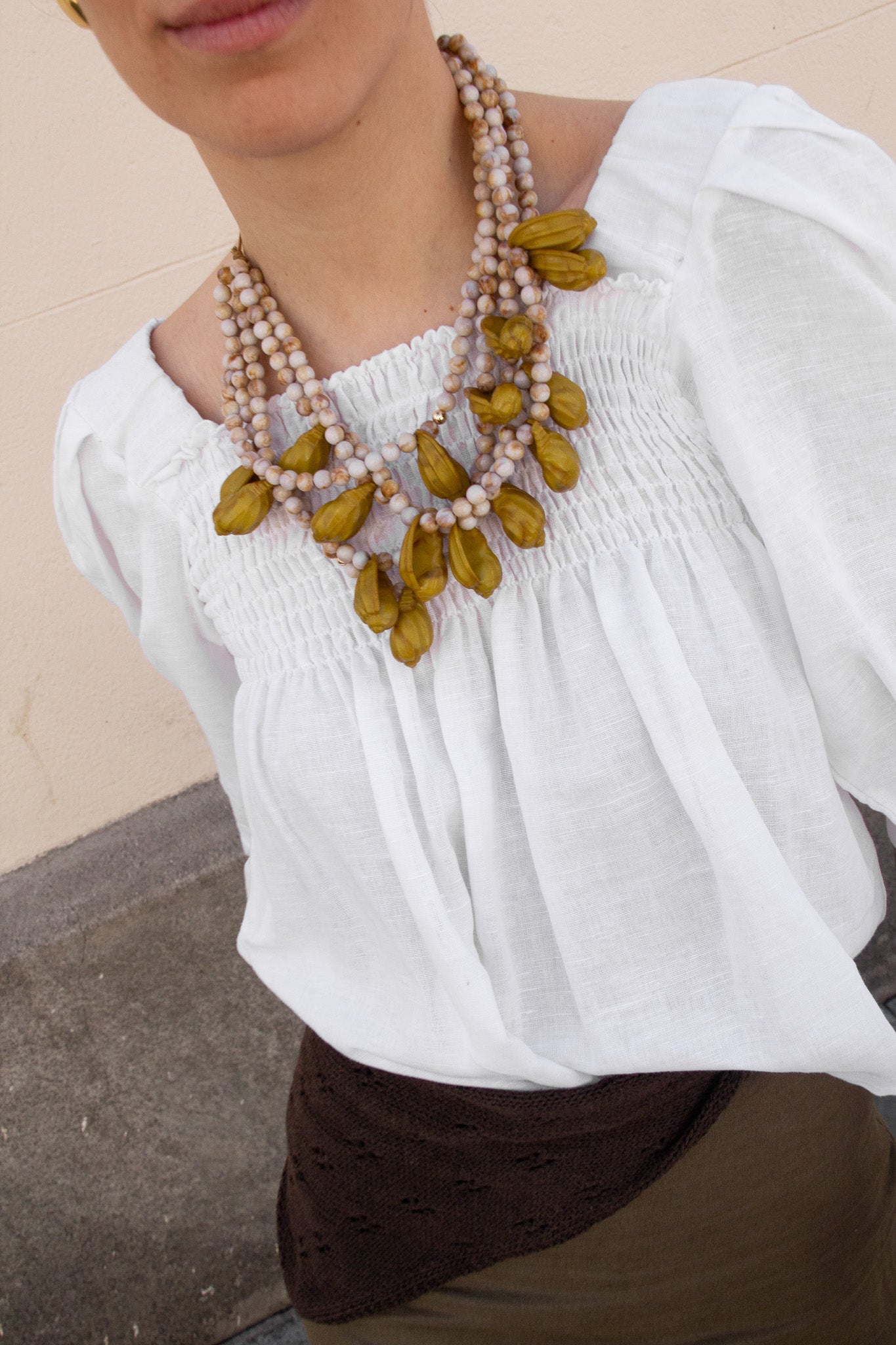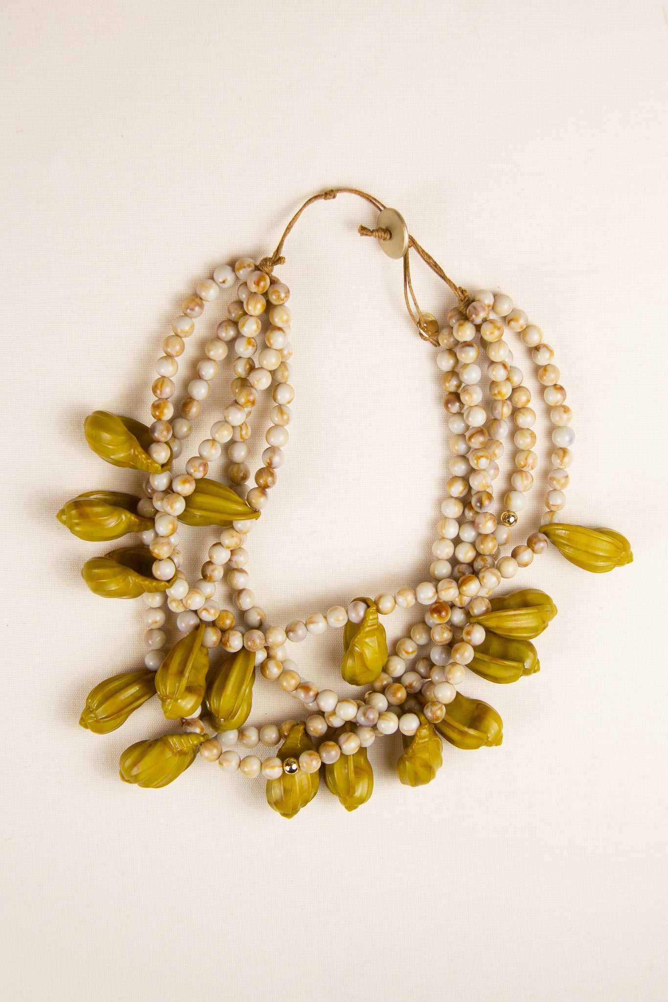 Collar tipo gargantilla de cuentas en tonos marrones y caracolas color naranja. El complemento perfecto para dar un toque de color y diversión a todos tus looks.