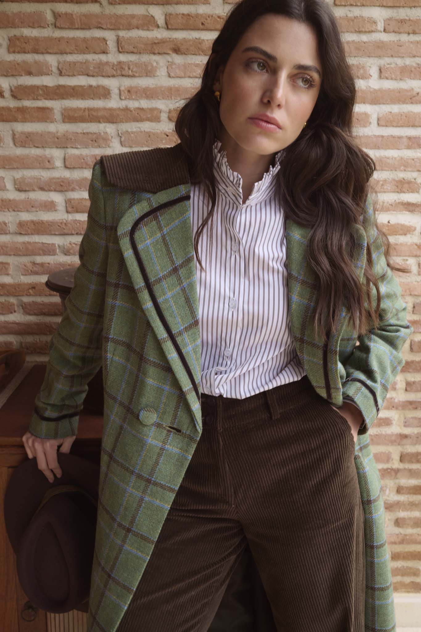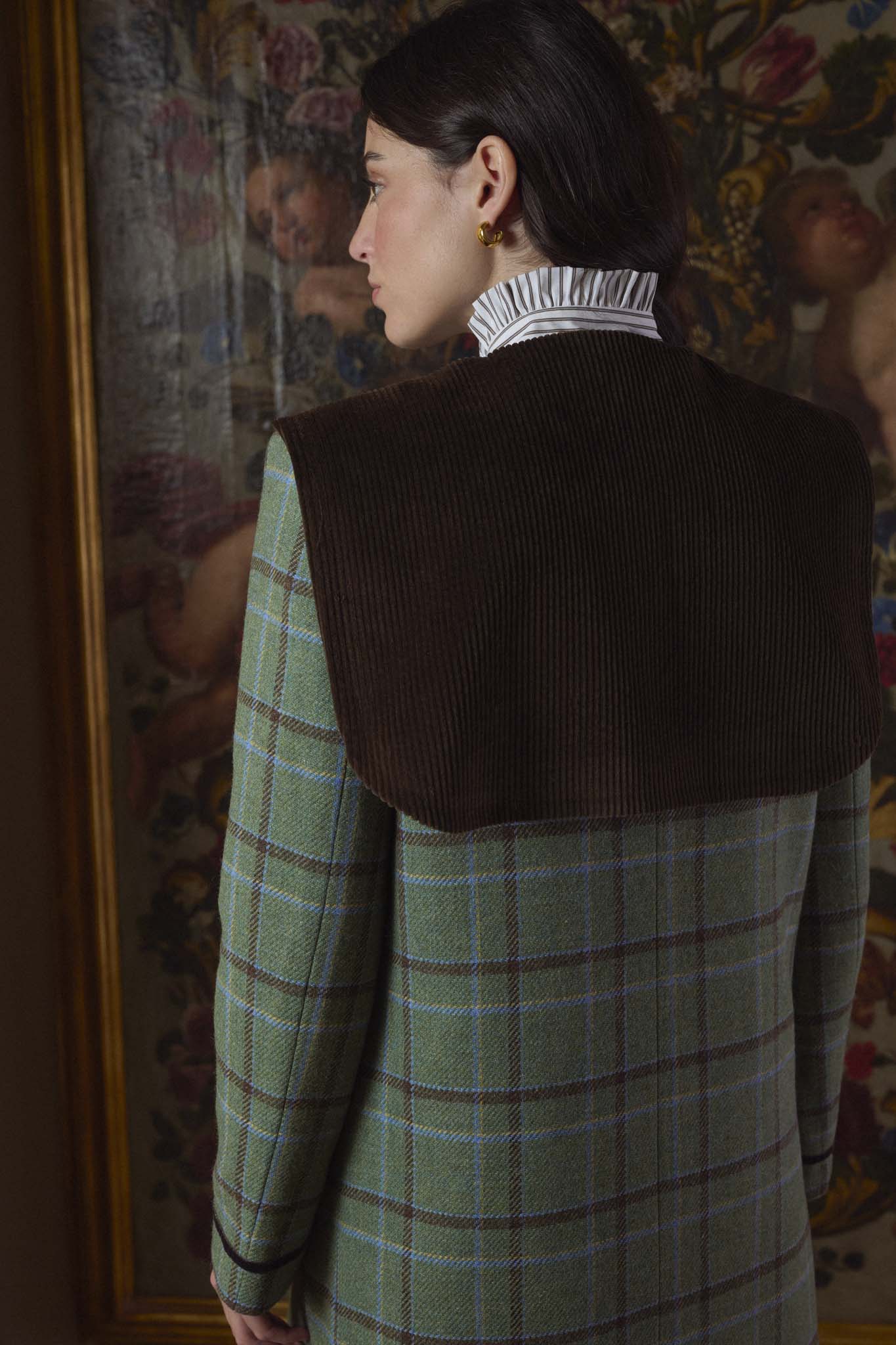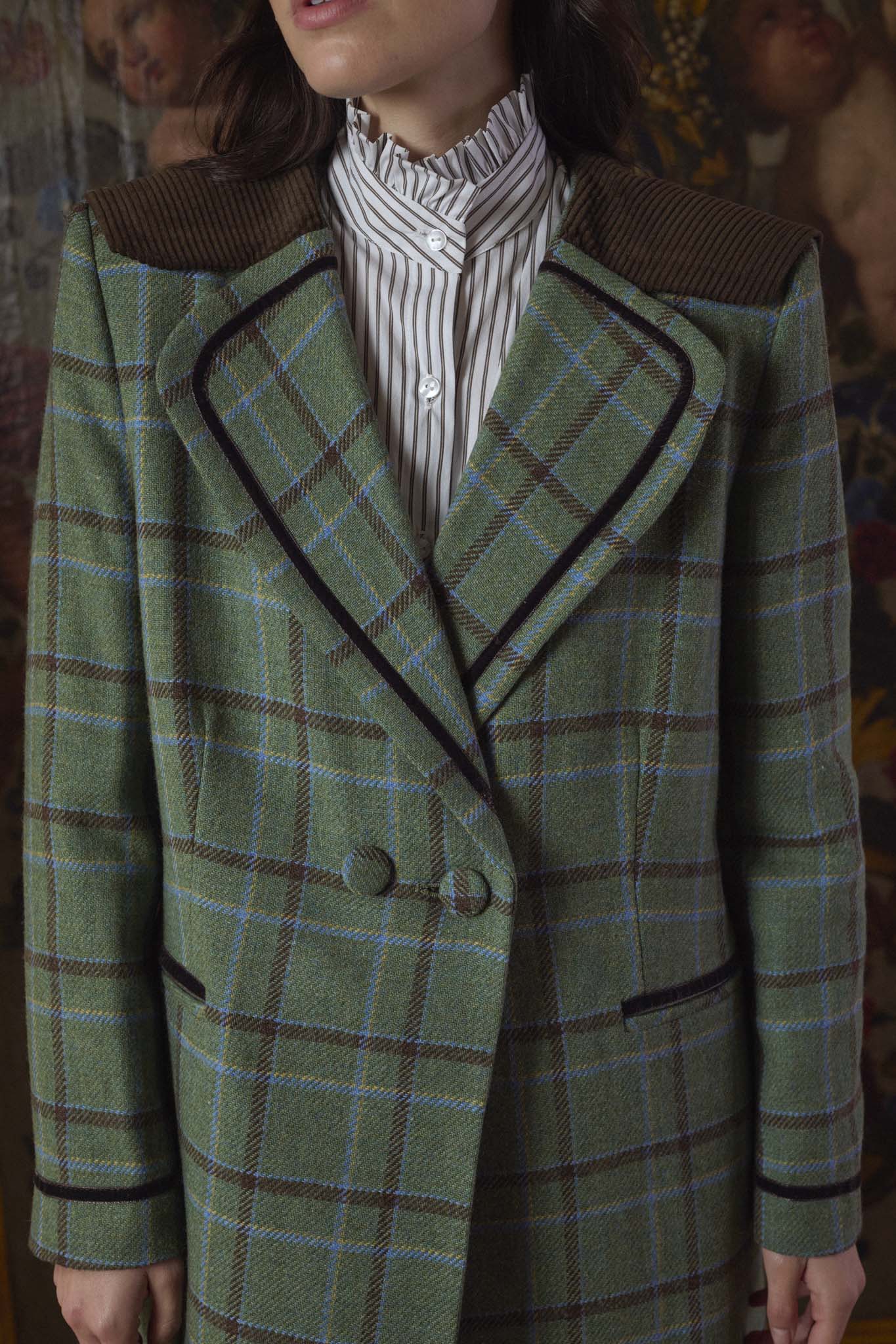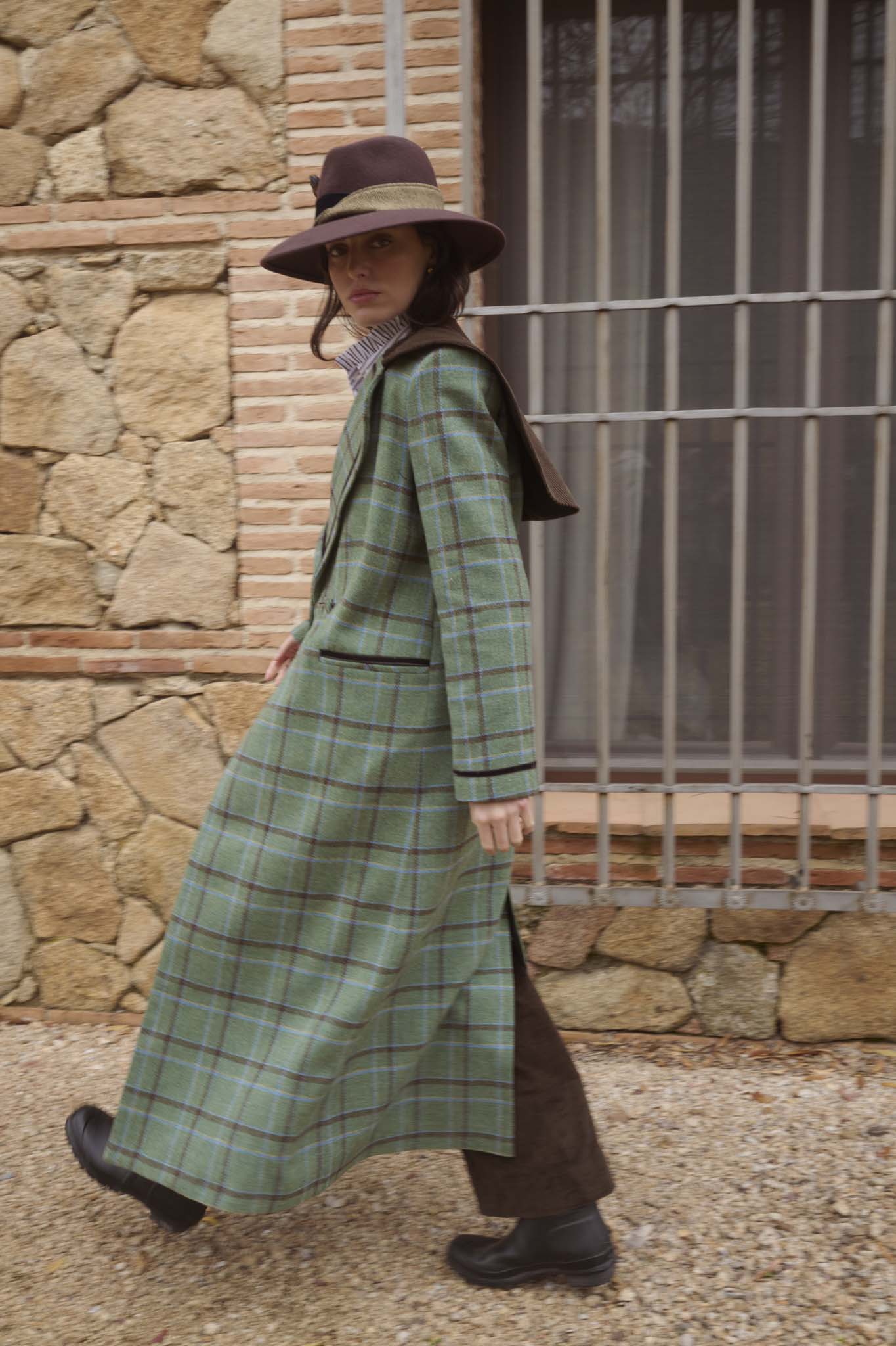 Abrigo confeccionado en nuestros talleres de Madrid, de corte recto, entallado, con solapa clásica redondeada y capelina de pana en la espalda. Cierre mediante doble botonadura en el delantero y un botón interior adicional. Bolsillos de ojal a ambos lados con detalle de terciopelo. En tejido exterior de lana 100%, tejida en Salamanca, con forro completo interior. Vivos en terciopelo en puños, bolsillos y solapas. Una prenda hecha en España de gran calidad desde los materiales hasta la confección, cuidando cada detalle, y convirtiéndose en un fondo de armario para toda la vida.