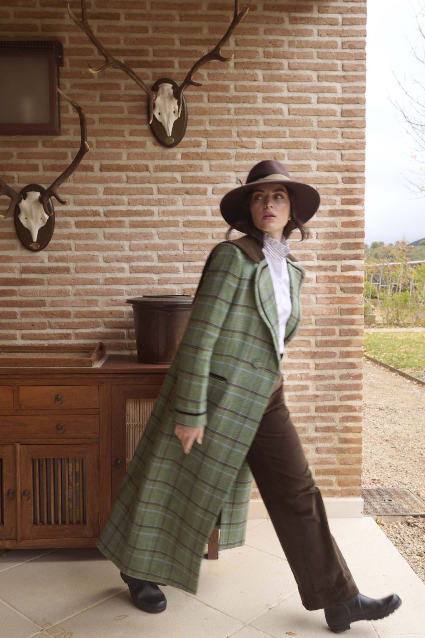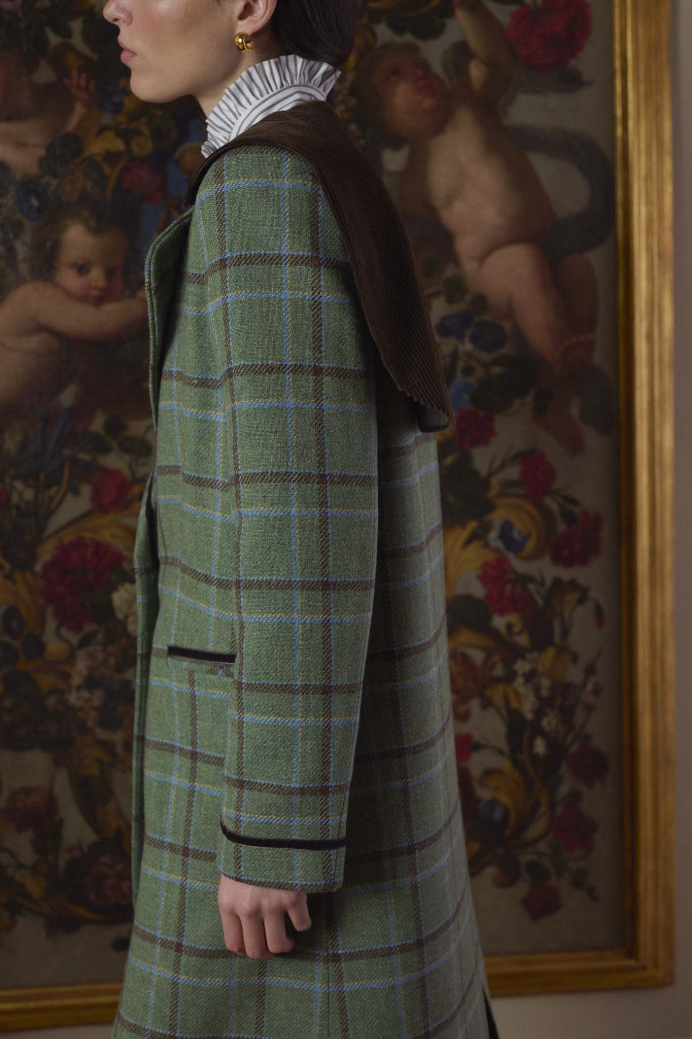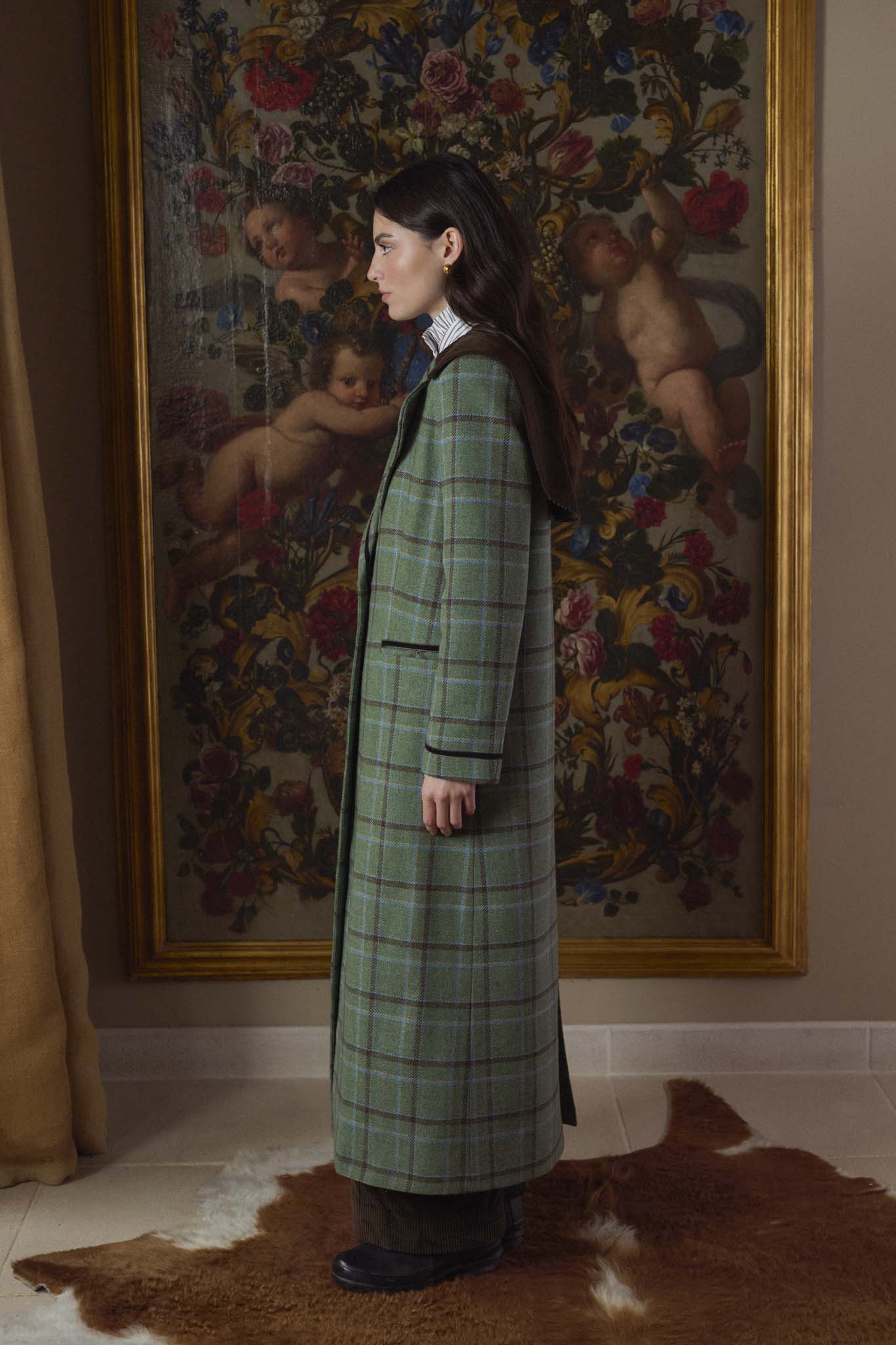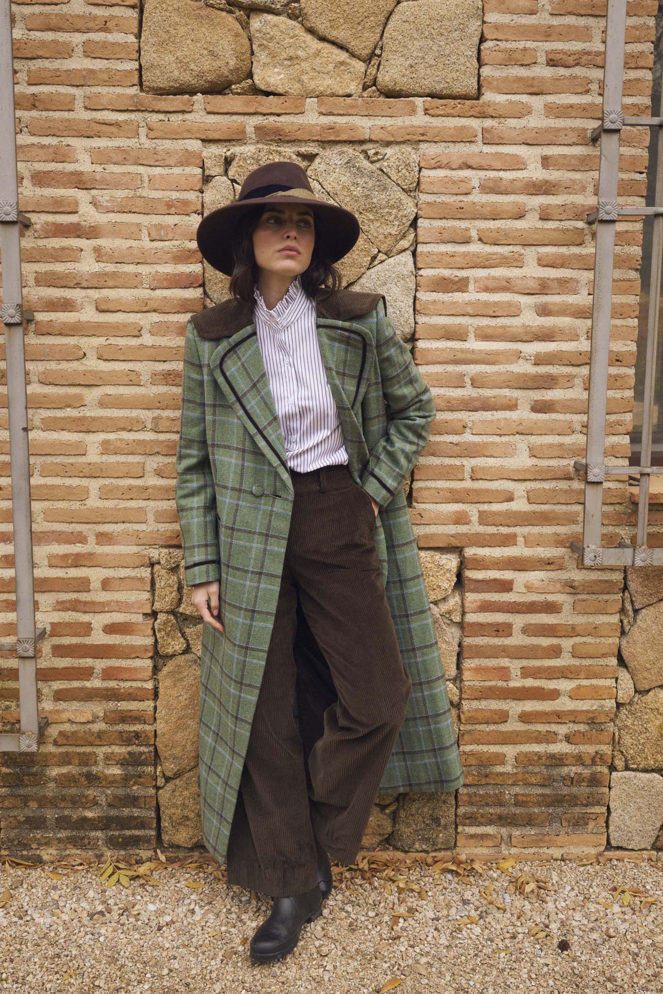 Abrigo confeccionado en nuestros talleres de Madrid, de corte recto, entallado, con solapa clásica redondeada y capelina de pana en la espalda. Cierre mediante doble botonadura en el delantero y un botón interior adicional. Bolsillos de ojal a ambos lados con detalle de terciopelo. En tejido exterior de lana 100%, tejida en Salamanca, con forro completo interior. Vivos en terciopelo en puños, bolsillos y solapas. Una prenda hecha en España de gran calidad desde los materiales hasta la confección, cuidando cada detalle, y convirtiéndose en un fondo de armario para toda la vida.