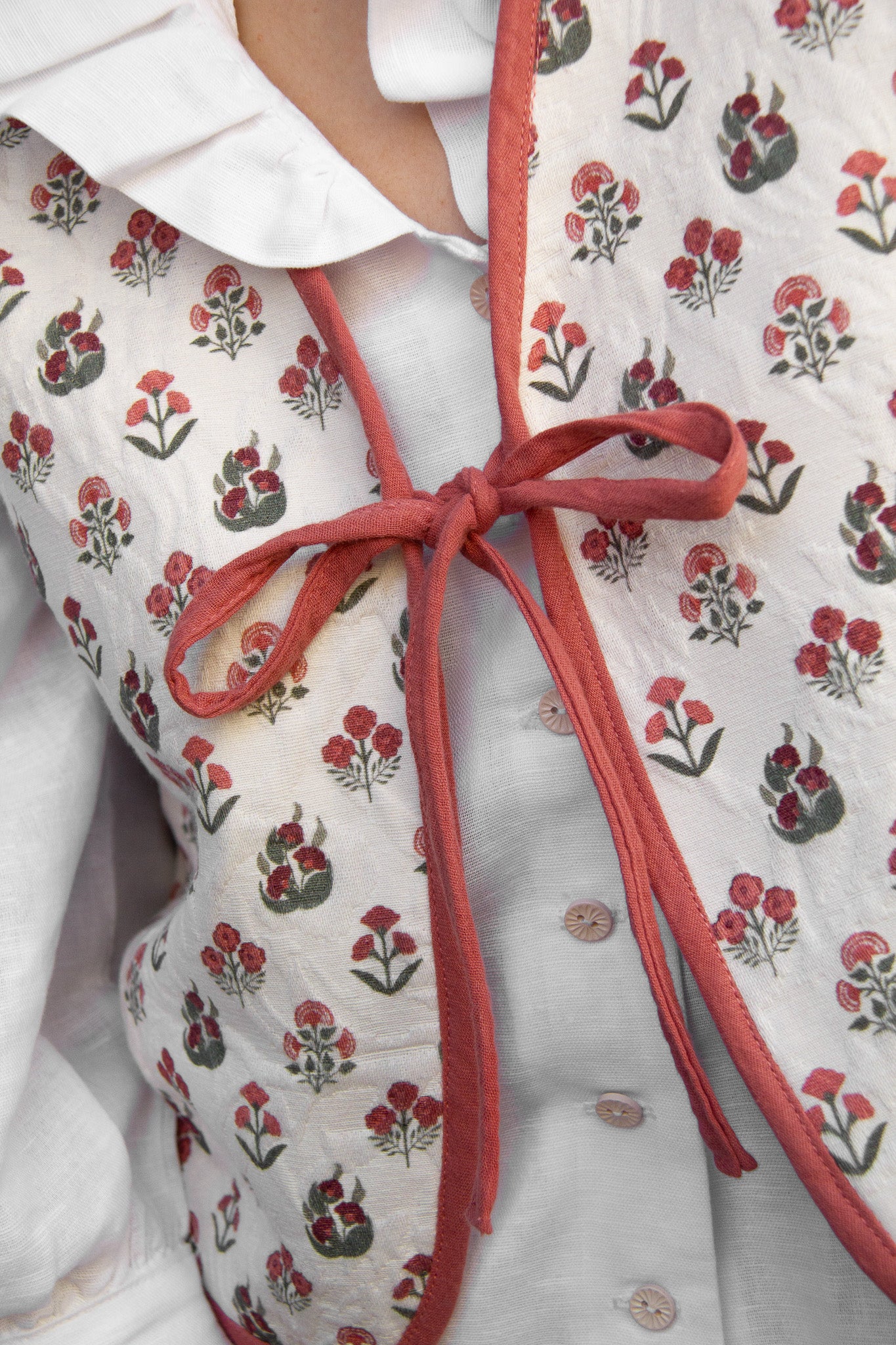 Chaleco reversible con lazada. De corte sencillo, puede llevarse tanto en su versión lisa como en el estampado de flores, perfecto para esta primavera.