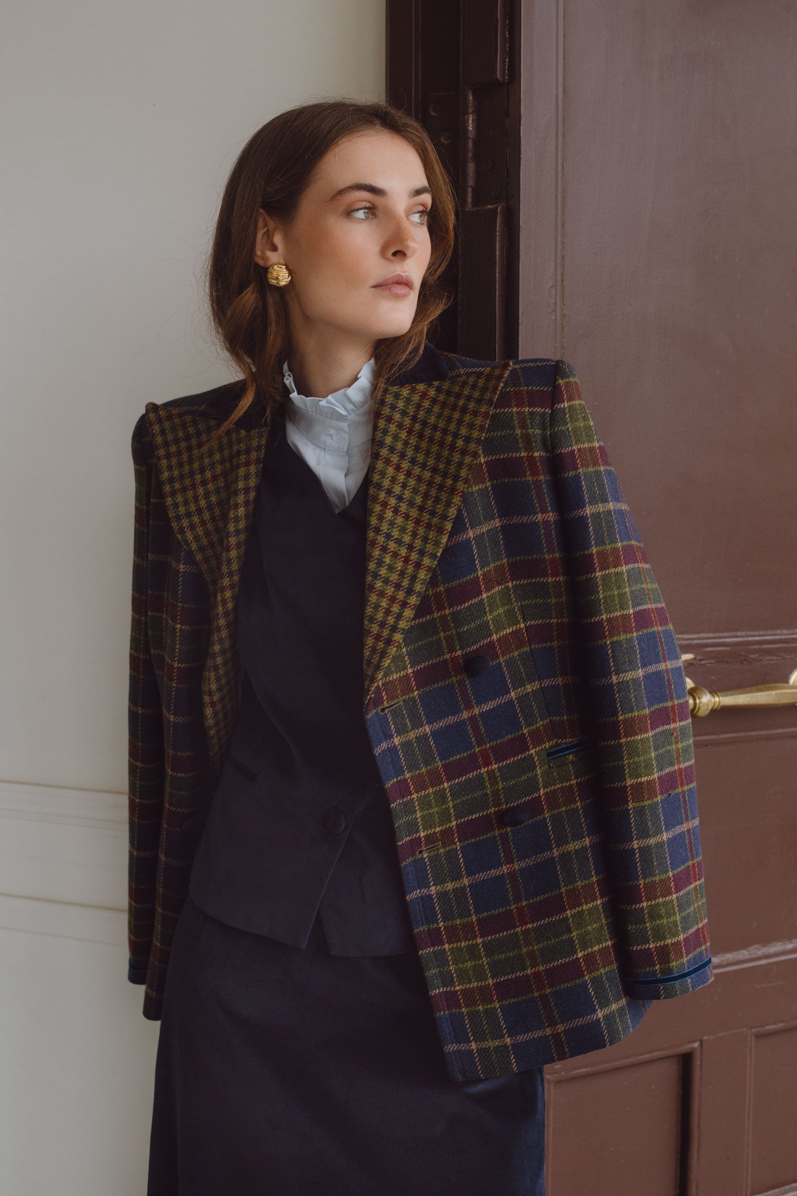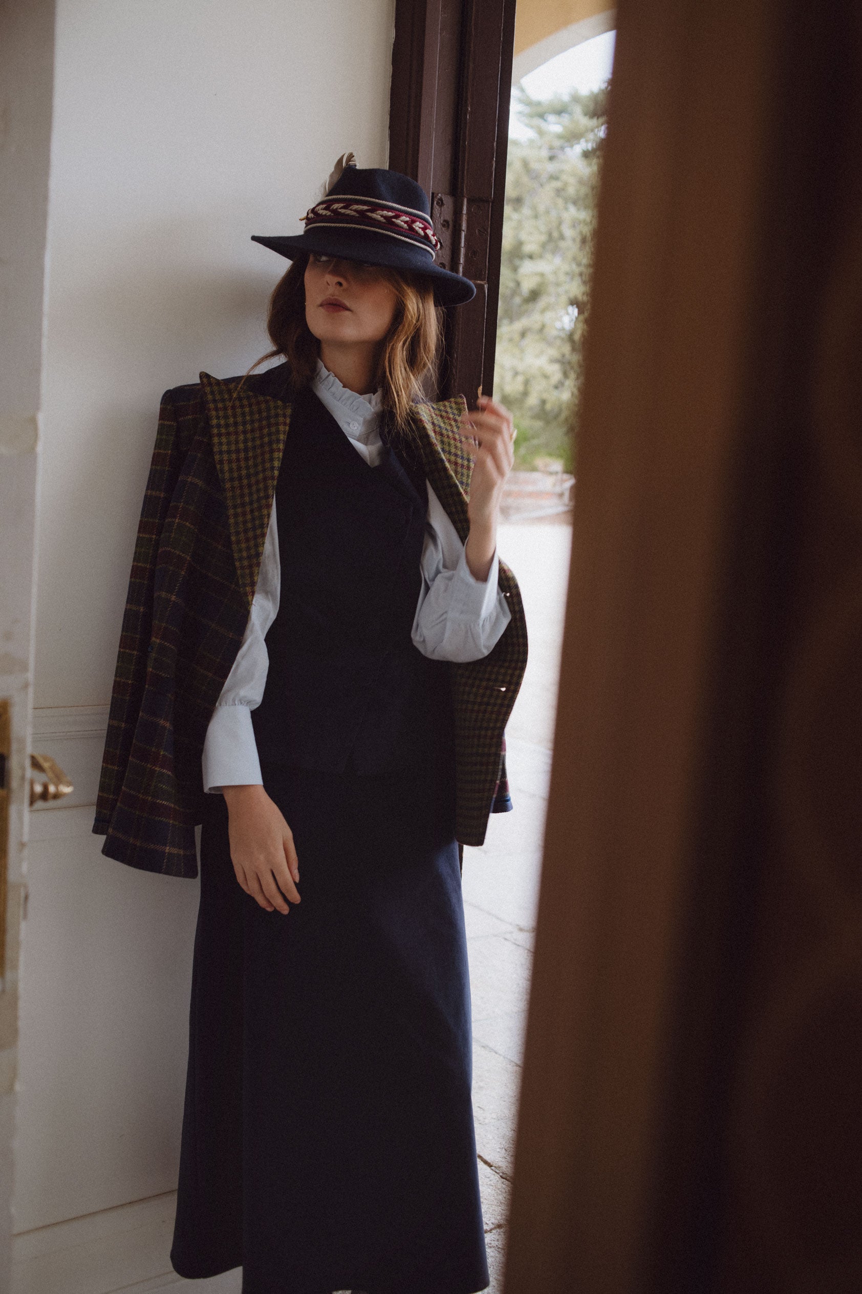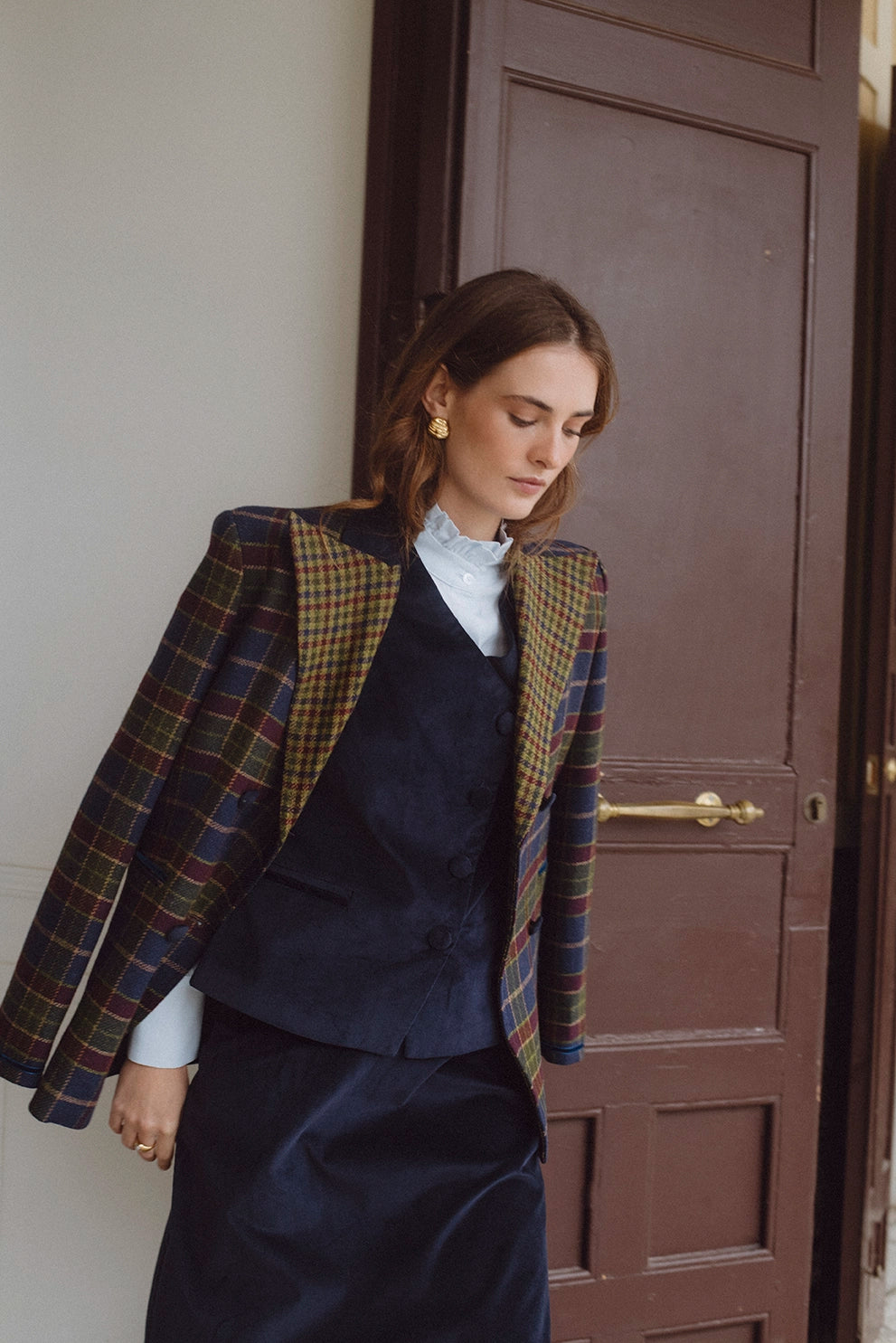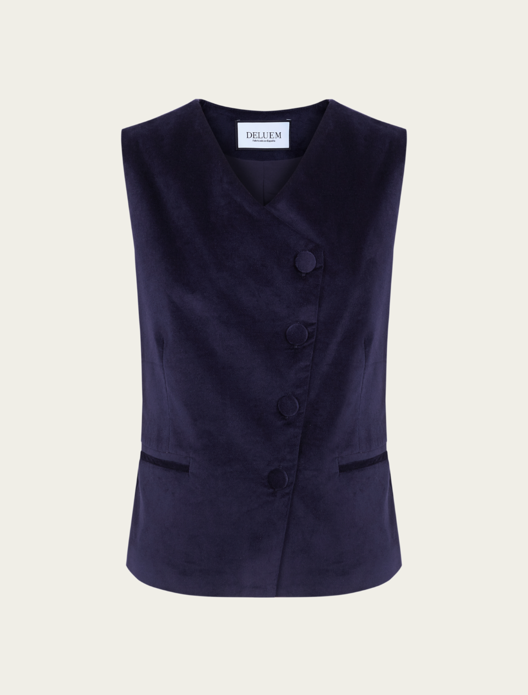 In deep navy blue, the Felicia Velvet Vest is pure elegance.
