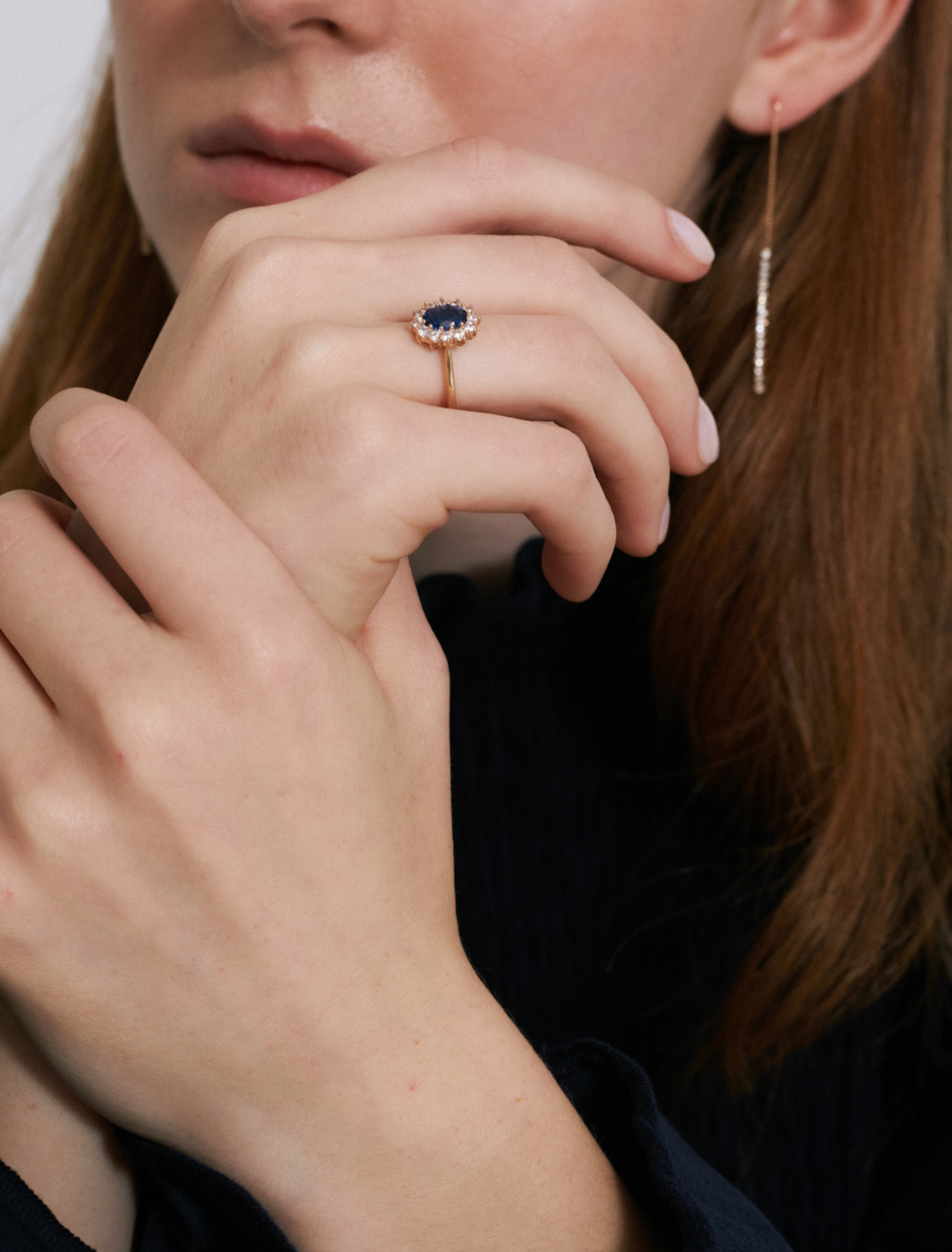 Anillo laminado con cinco micras de oro de 18K sobre base de latón con hilera de circonitas blancas y azul zafiro