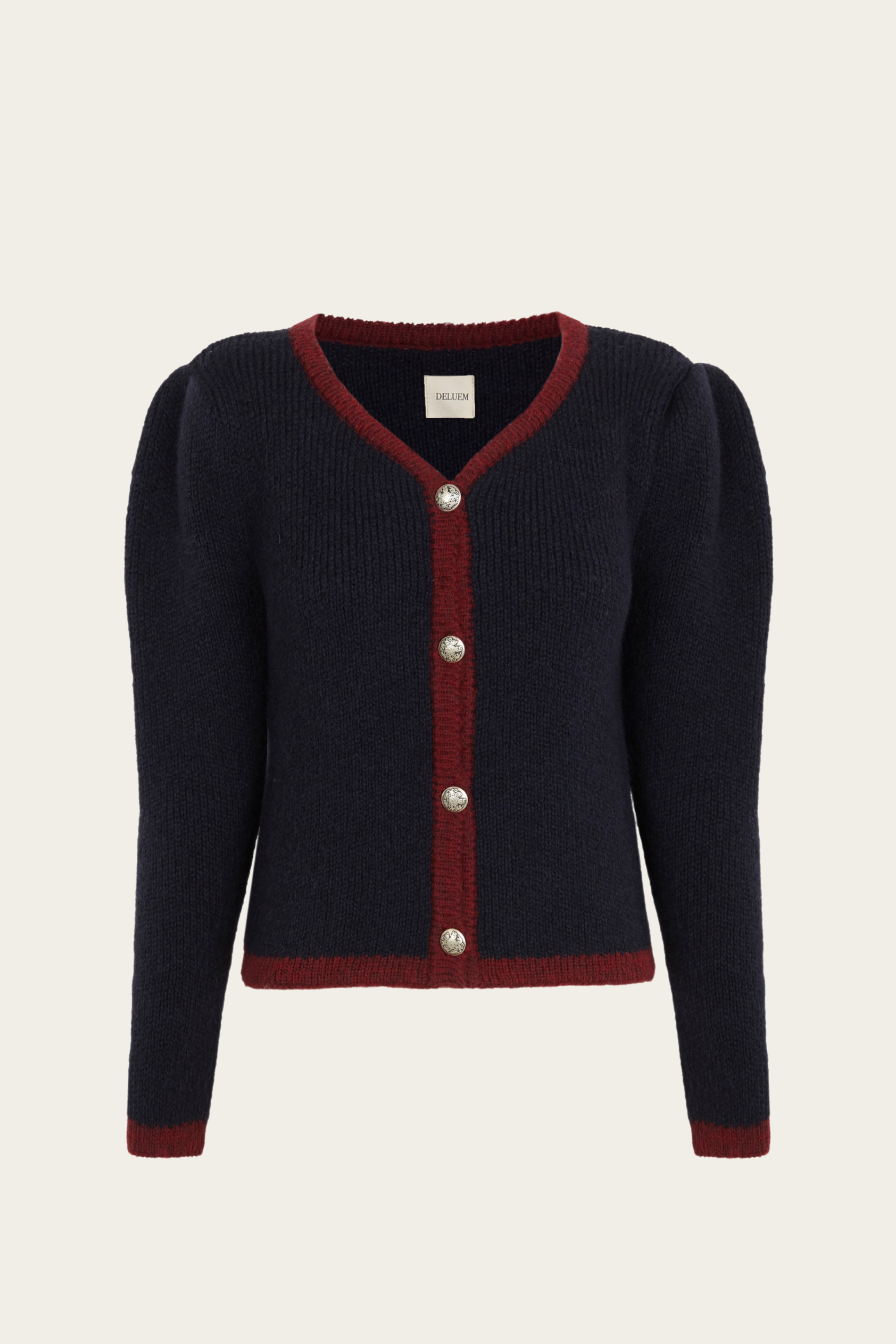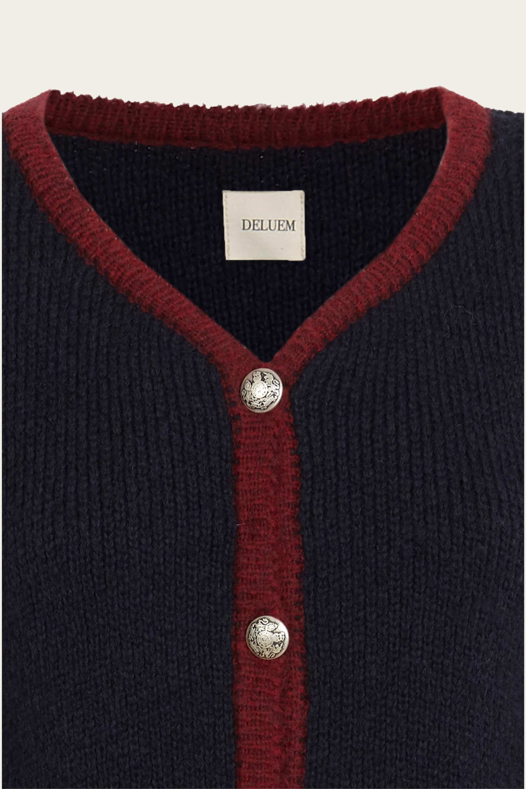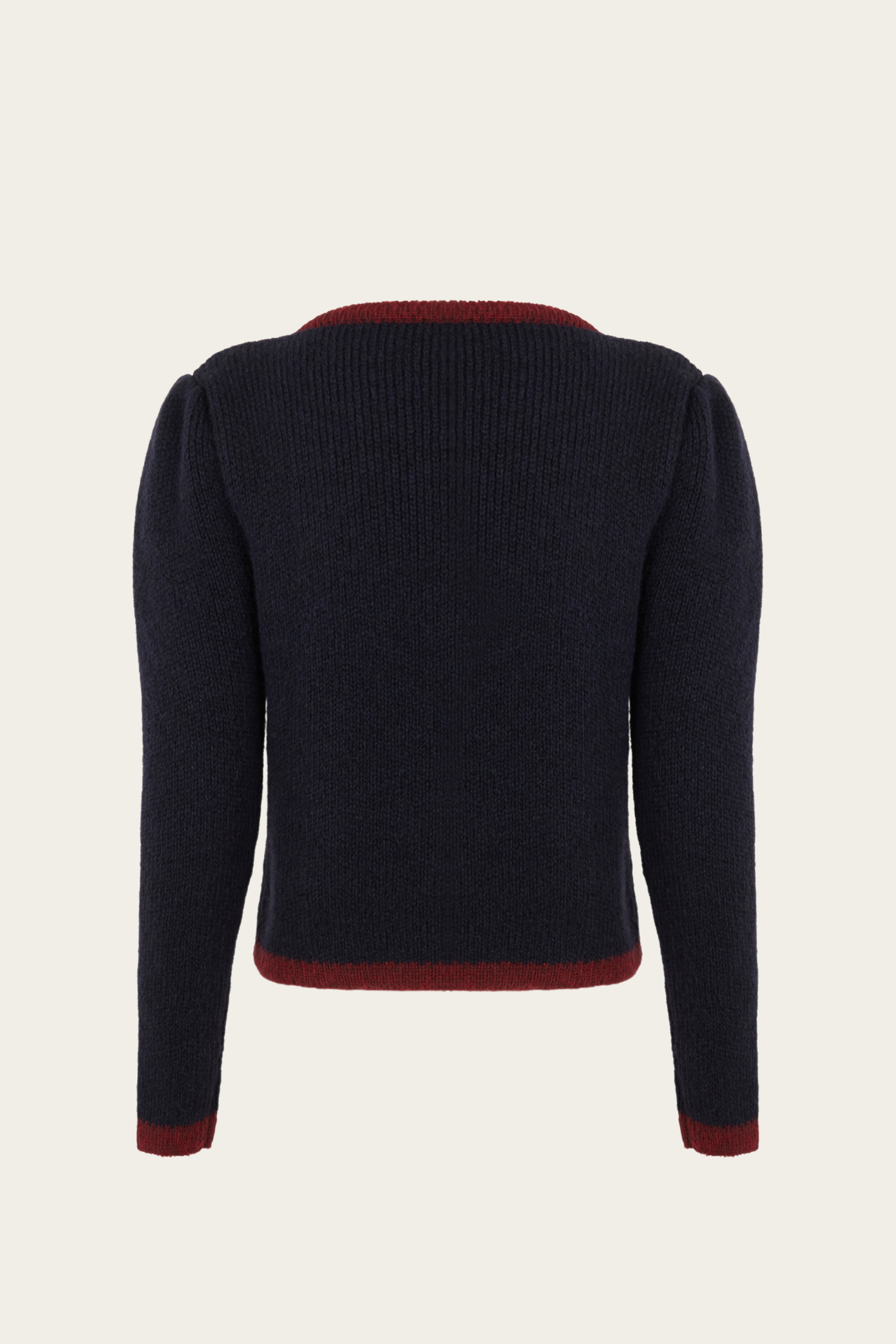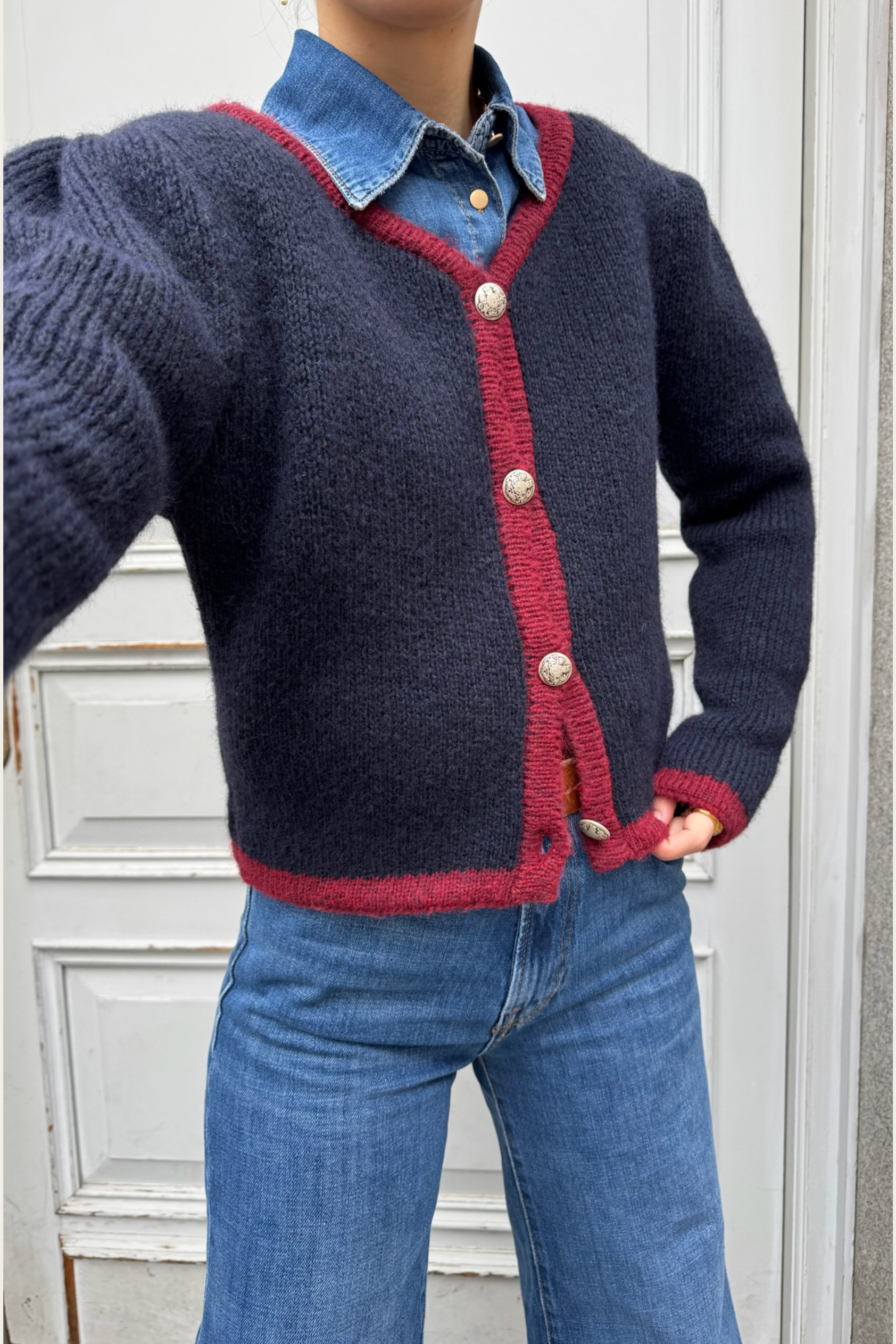 El azul marino es sinónimo de elegancia, pero en la chaqueta de punto tipo austriaca Margot - Navy Blue adquiere un matiz inesperado gracias a su vivo en granate.