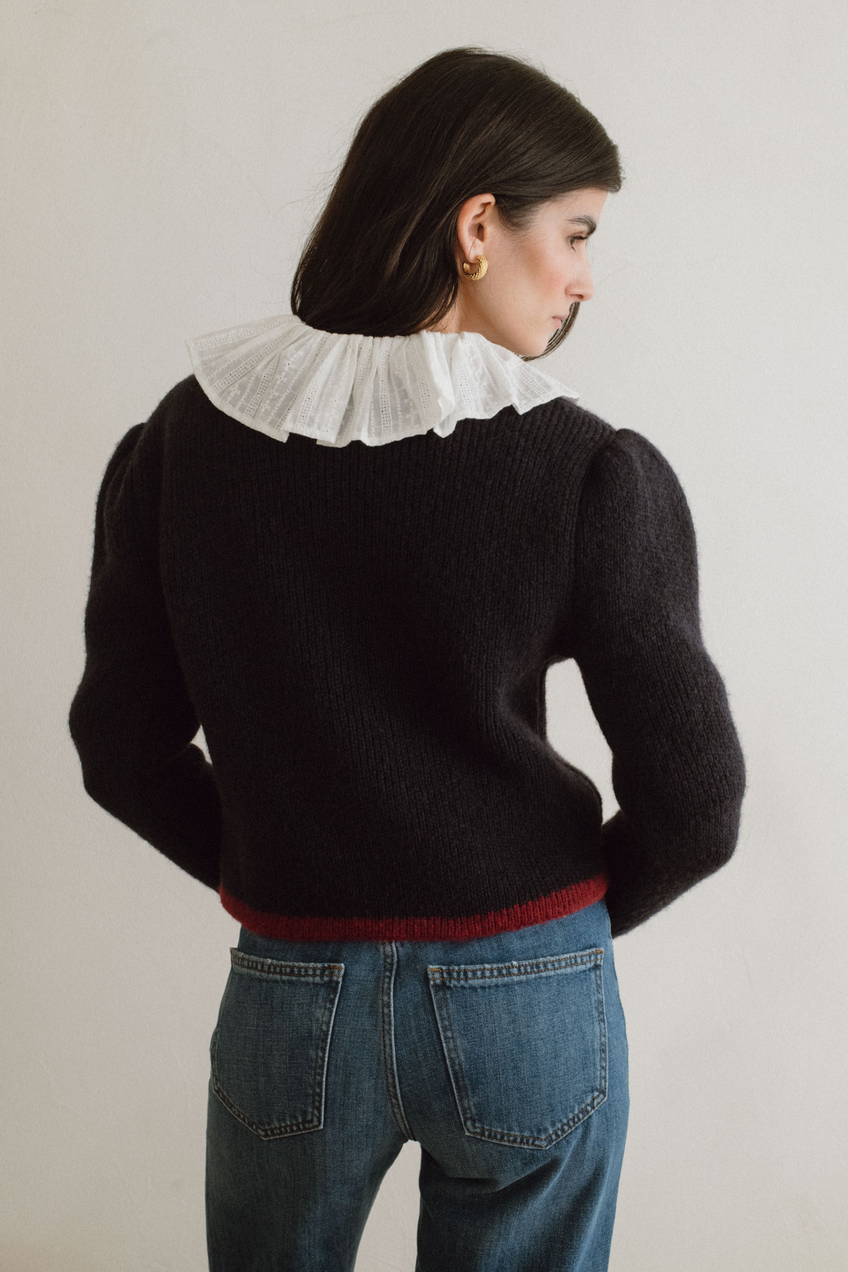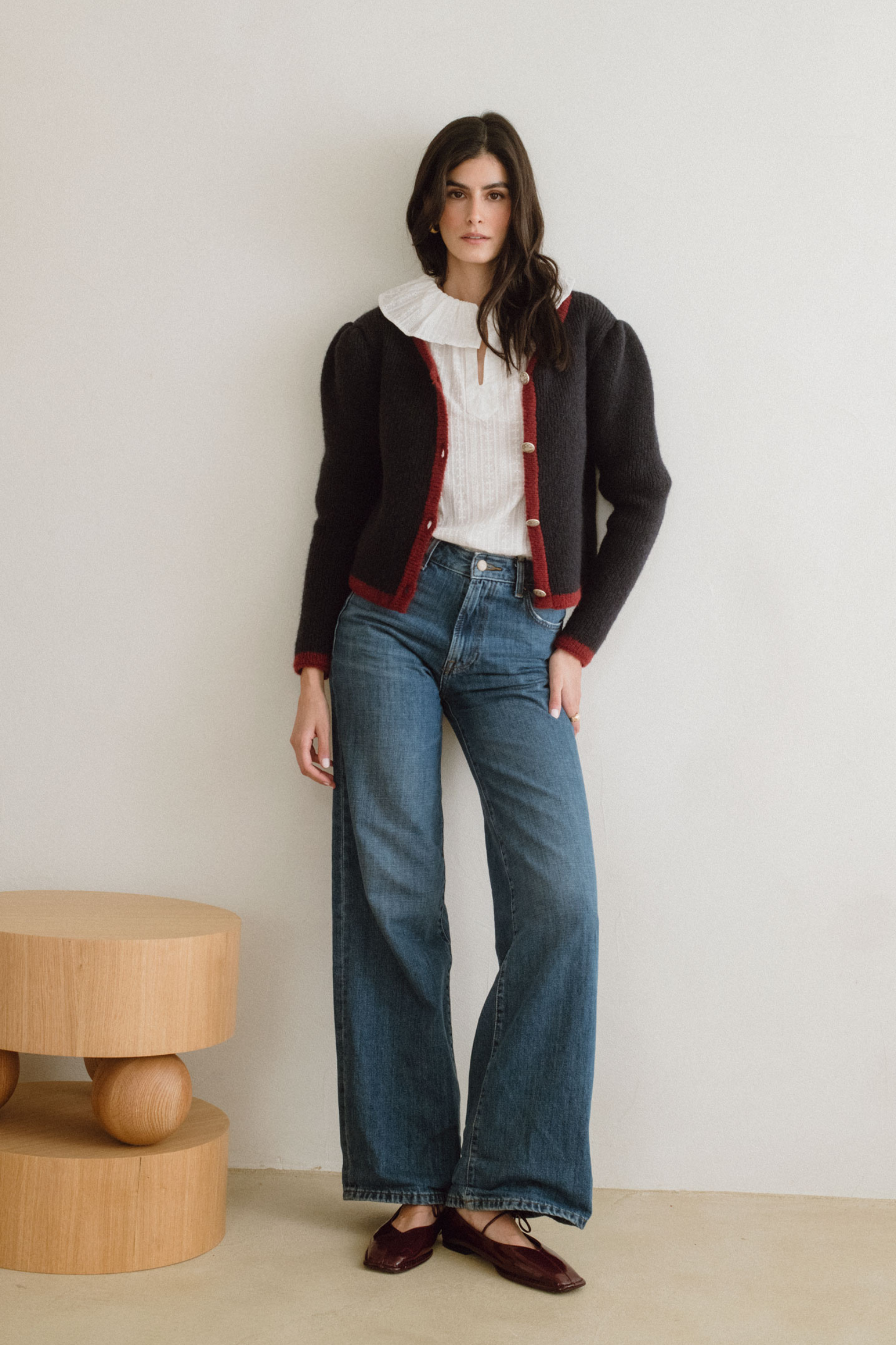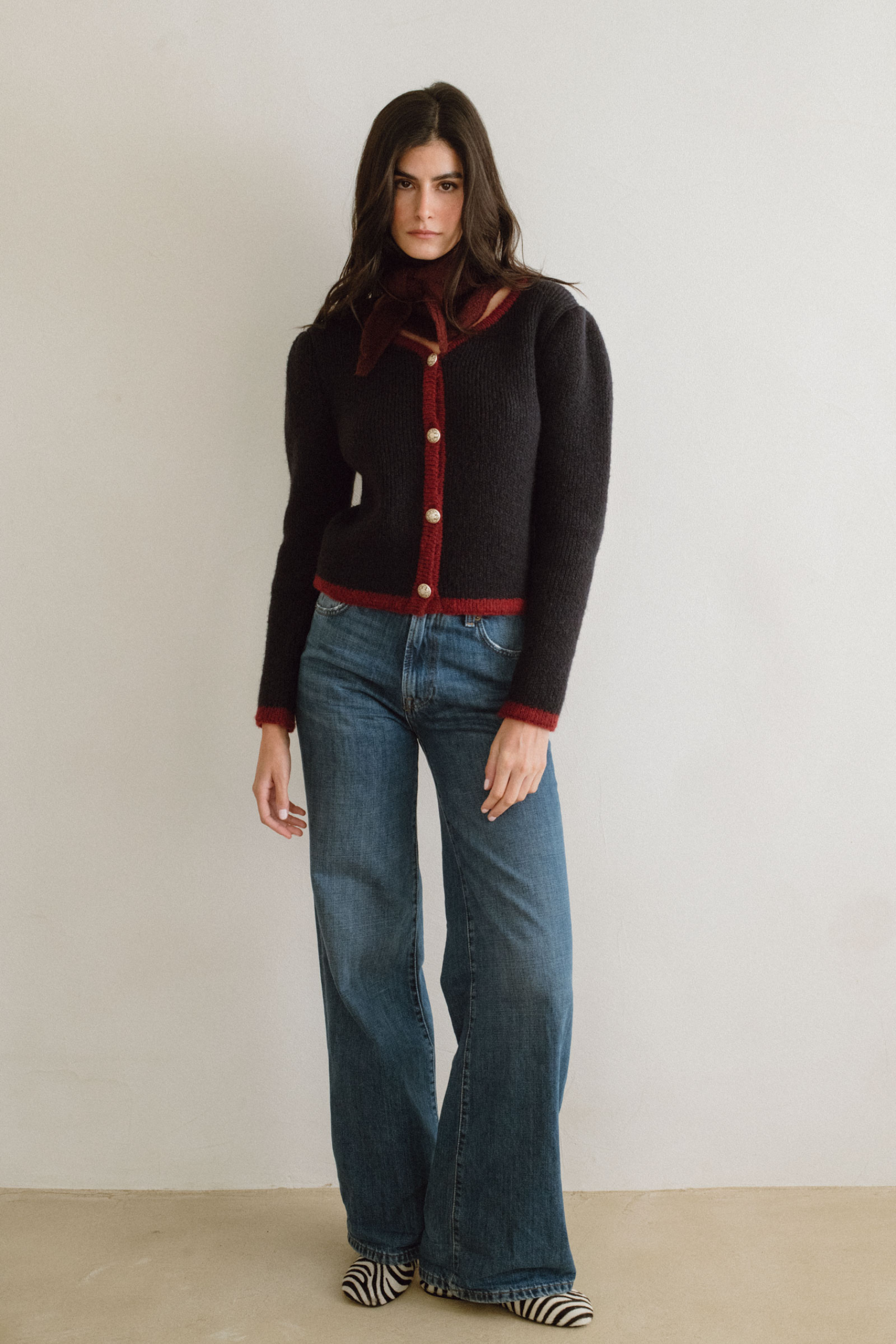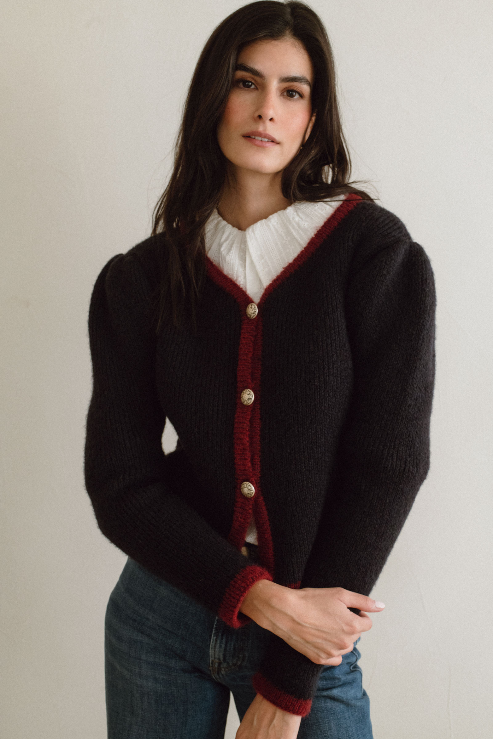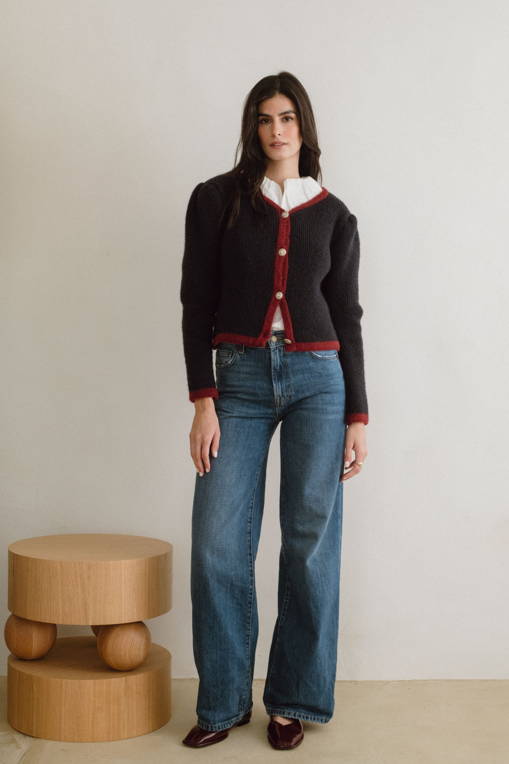 El azul marino es sinónimo de elegancia, pero en la chaqueta de punto tipo austriaca Margot - Navy Blue adquiere un matiz inesperado gracias a su vivo en granate.