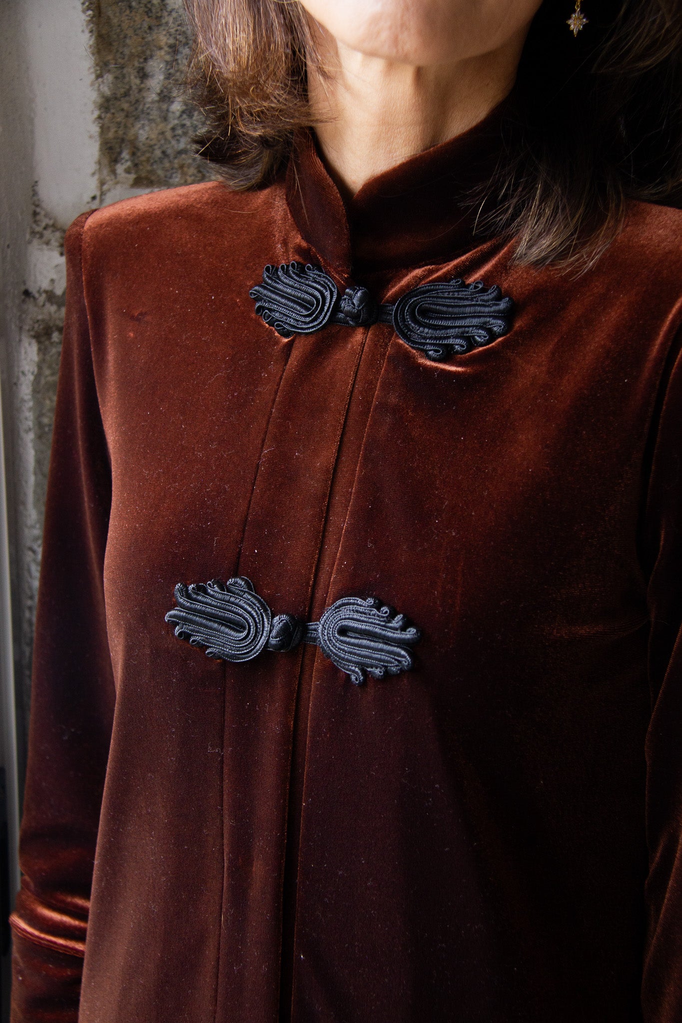 De corte oriental, cuenta con cuello mao y cierre superior con dos alamares de rayón negros. Tiene manga francesa y botonadura invisible en el interior de la solapa, lo que permite llevarla abierta a modo de chaqueta o cerrada como vestido.