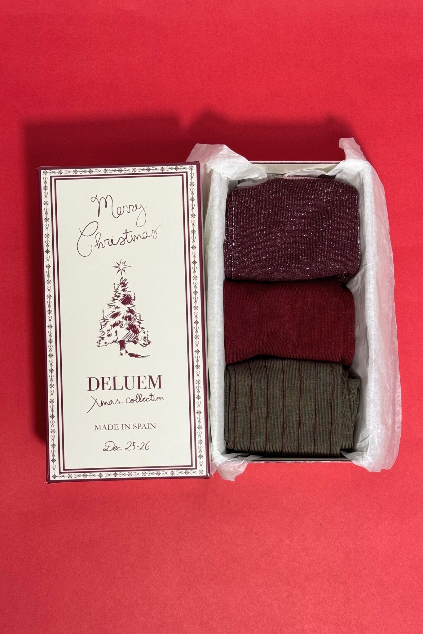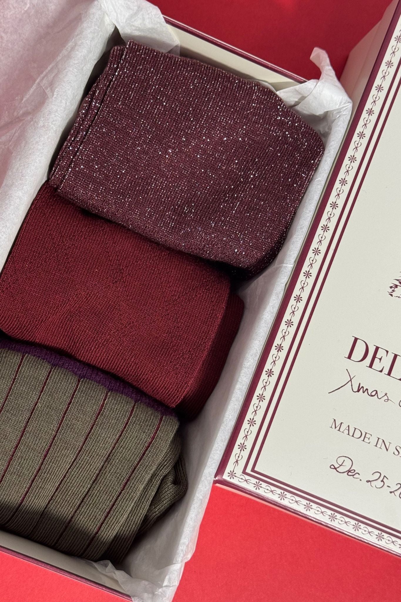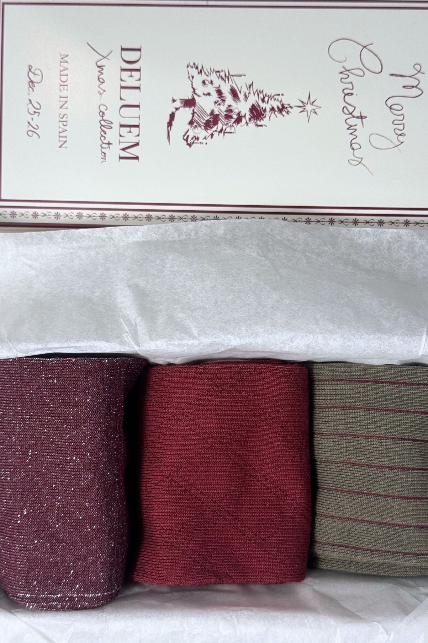 Pack de calcetines de mujer de caña media, confeccionados en punto suave de algodón. Incluye tres diseños combinados en granates y rosas: canalé clásico, motivo de rombos y acabado con hilo de lúrex, que aporta un sutil brillo. Un conjunto versátil y elegante, fabricados en España, ideal para el día a día o para dar un toque especial a tus looks de invierno.