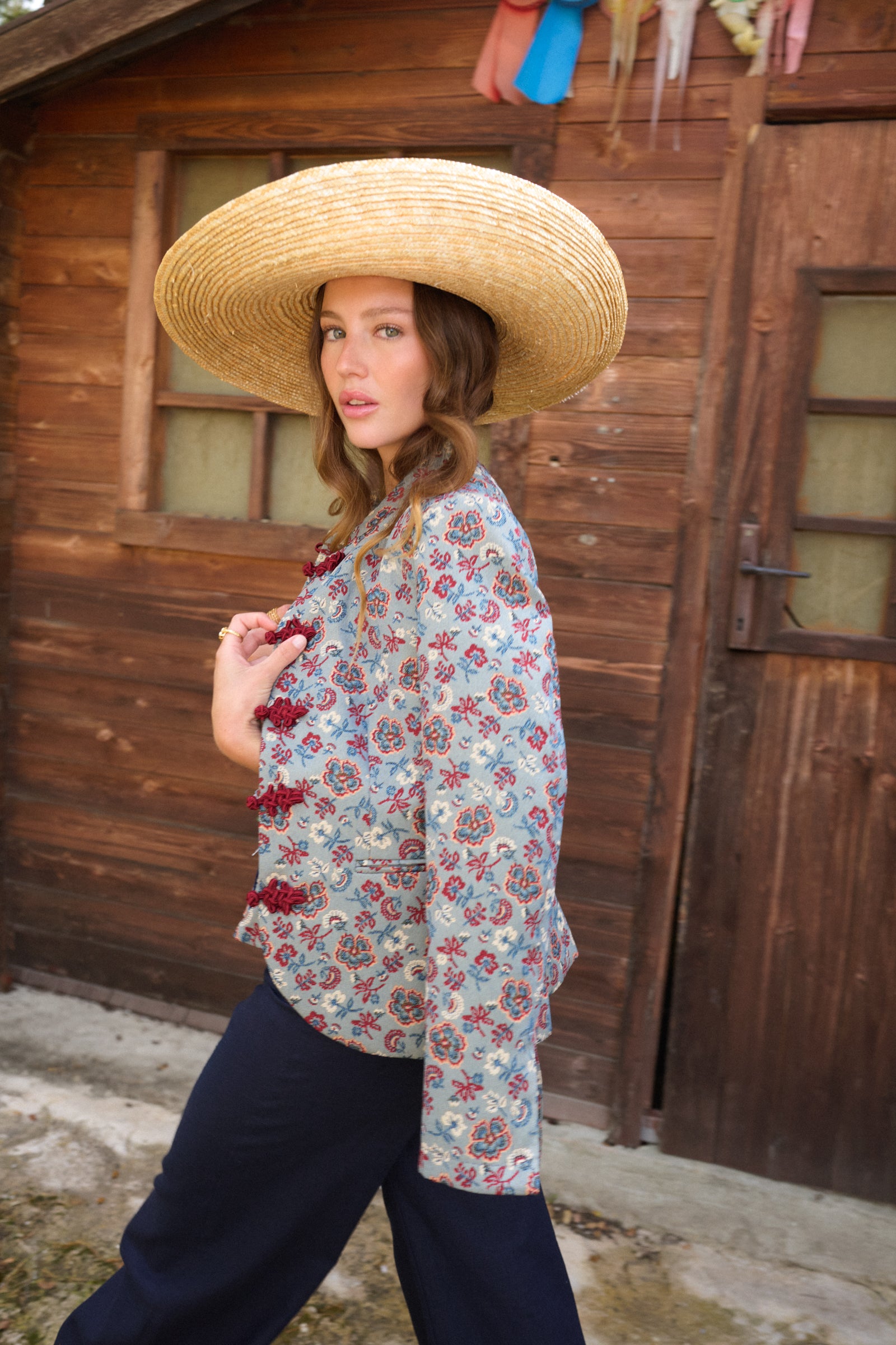 La pieza más especial de la colección. Chaqueta de inspiración oriental en tejido estructurado de tapicería en tonos azules y granates, con cuello mao y cierre con alamares en contraste que aportan un diseño único y original.