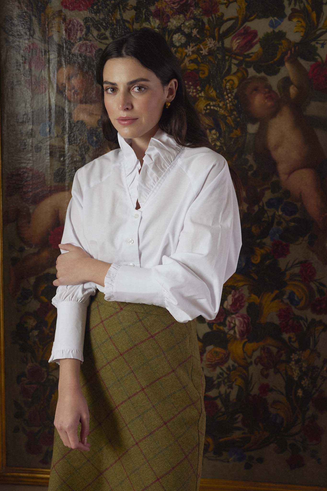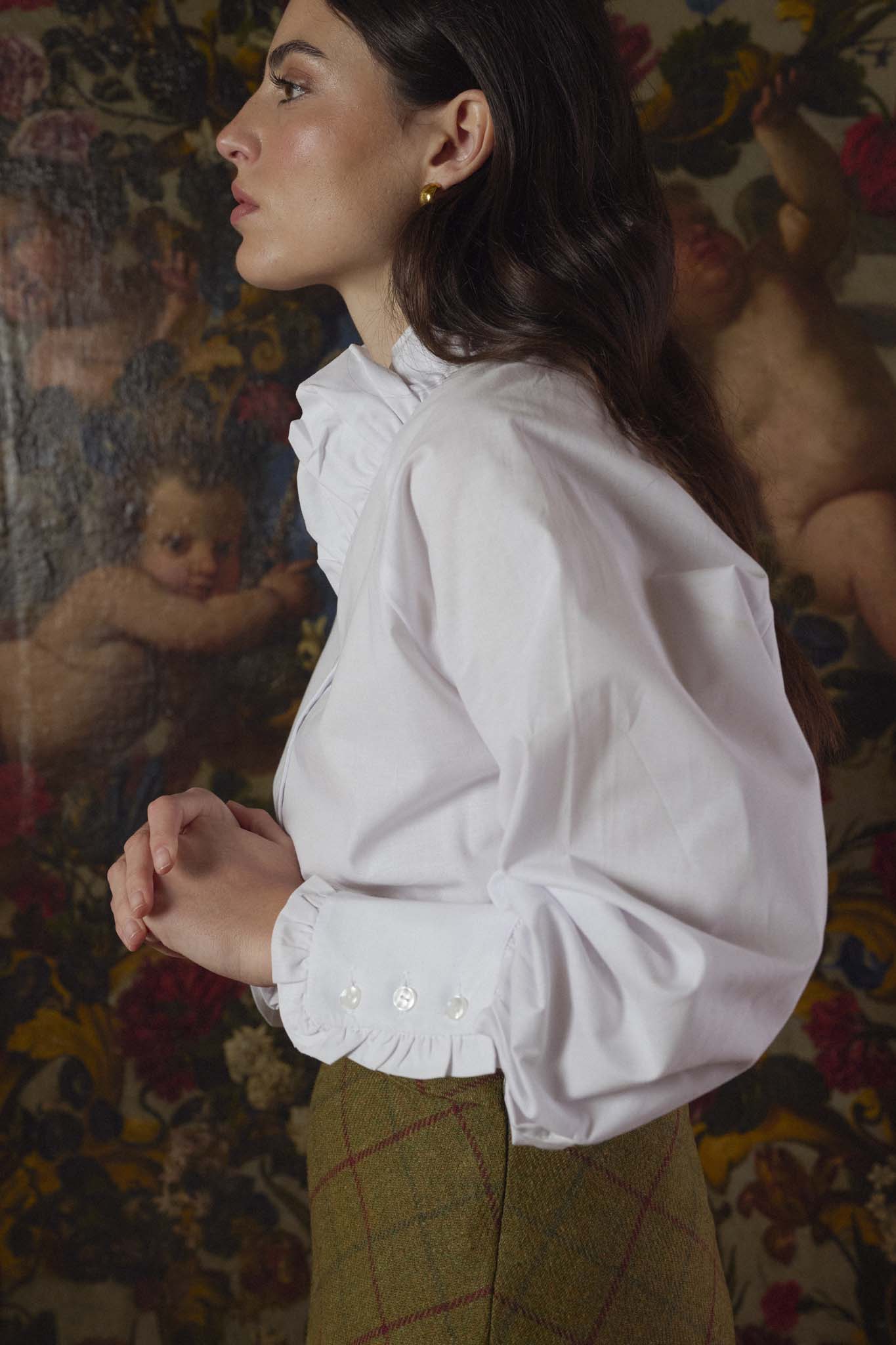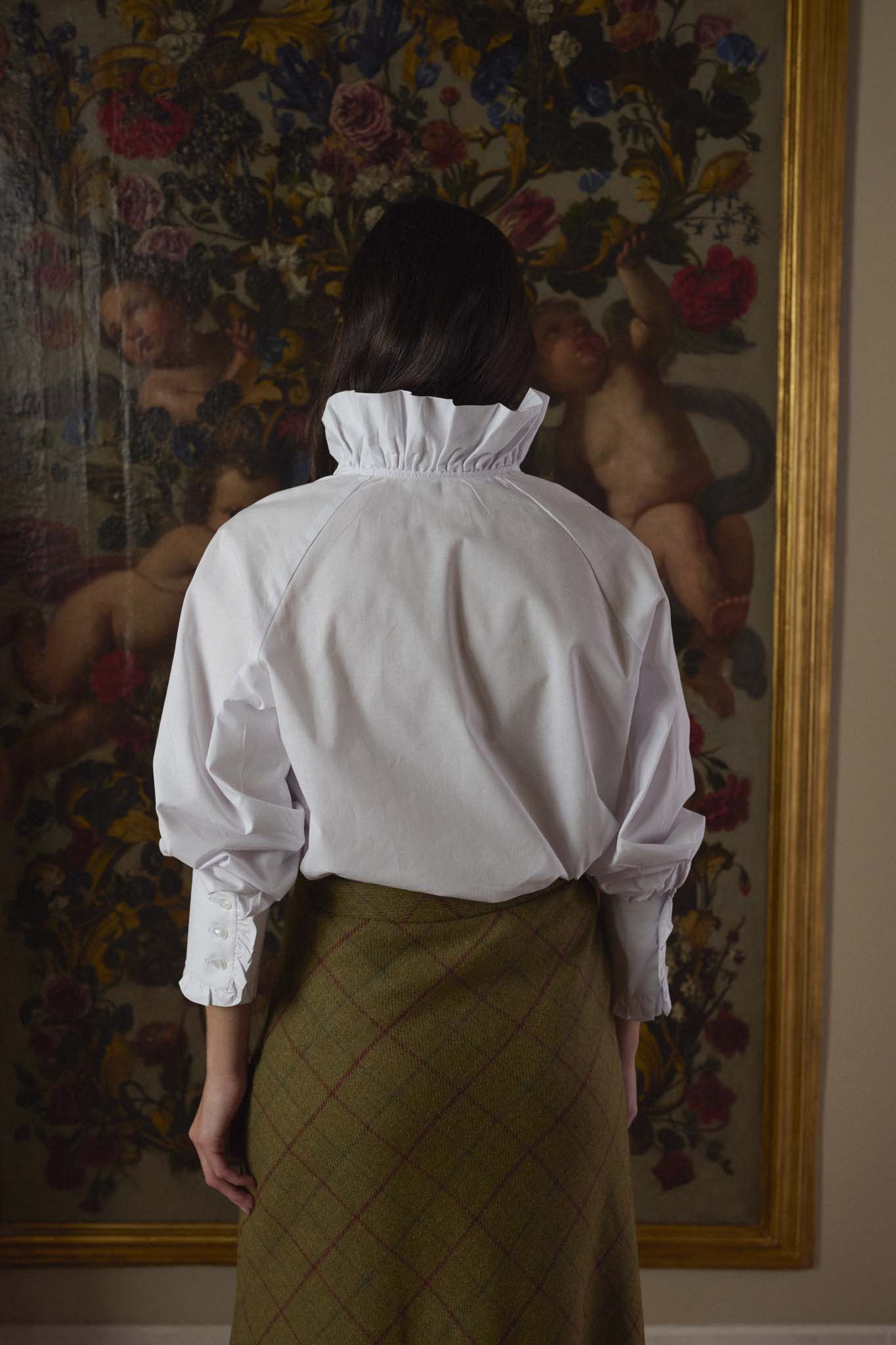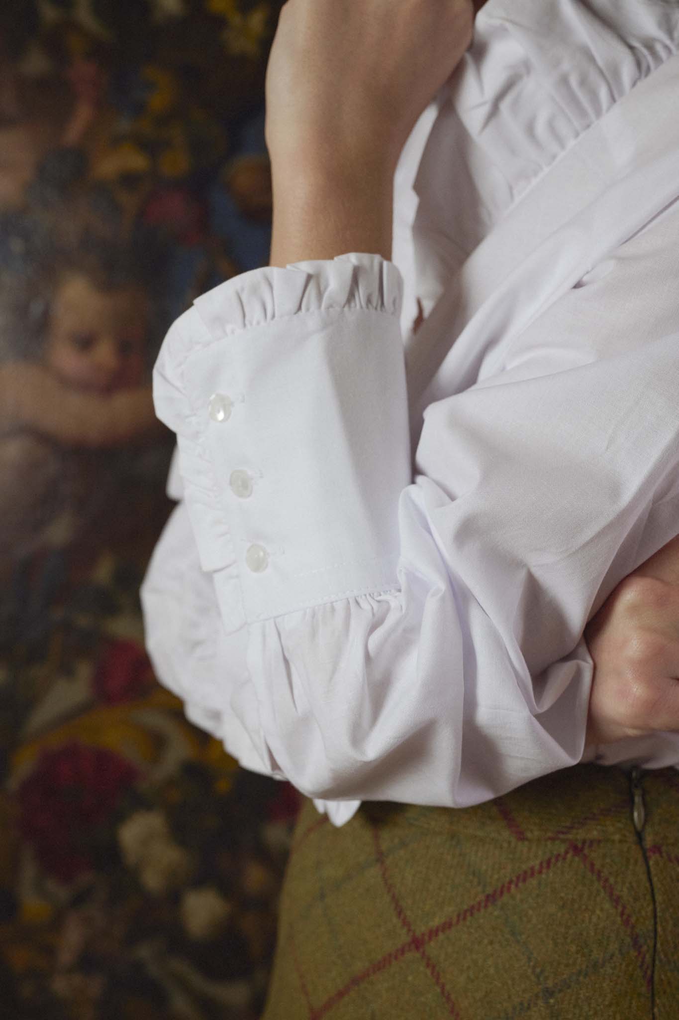 Nuestra icónica blusa ahora en popelín blanco. Confeccionada artesanalmente en nuestros talleres de Madrid. Diseñada con cuello adornado con volantes que aportan un toque femenino y romántico. Presenta manga larga con puños fruncidos y cierre de tres botones. Su diseño atemporal, enriquecido con detalles sutiles, la convierte en una prenda versátil, perfecta para combinar con cualquier look. La blusa que se adapta a cada ocasión con una elegancia sin esfuerzo. Para looks de oficina, casuales y evento. Al tratarse de productos fabricados a mano pueden presentar pequeñas diferencias respecto a las fotografías.