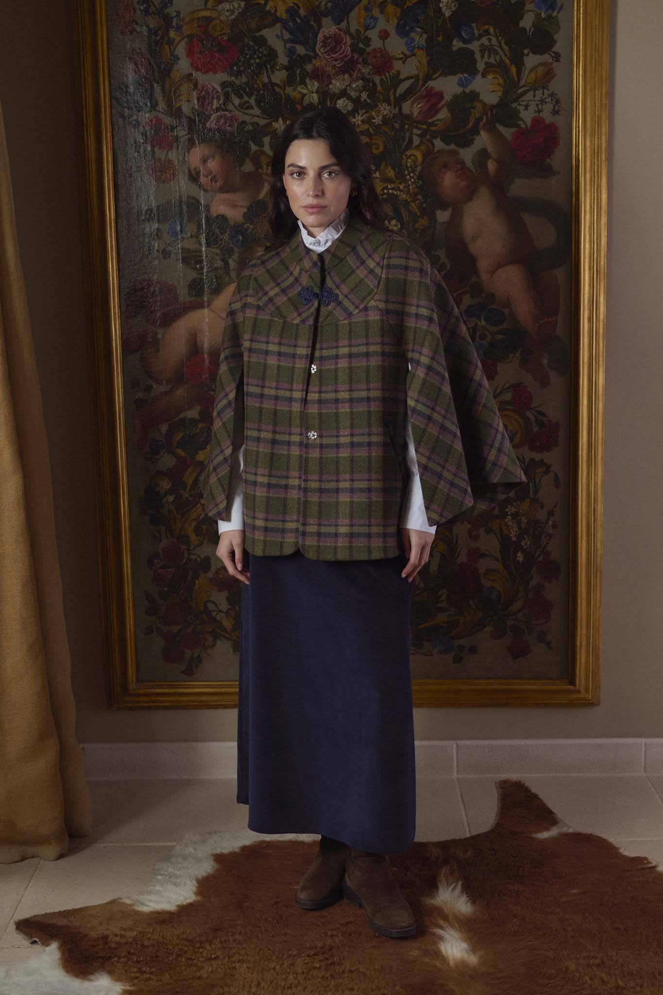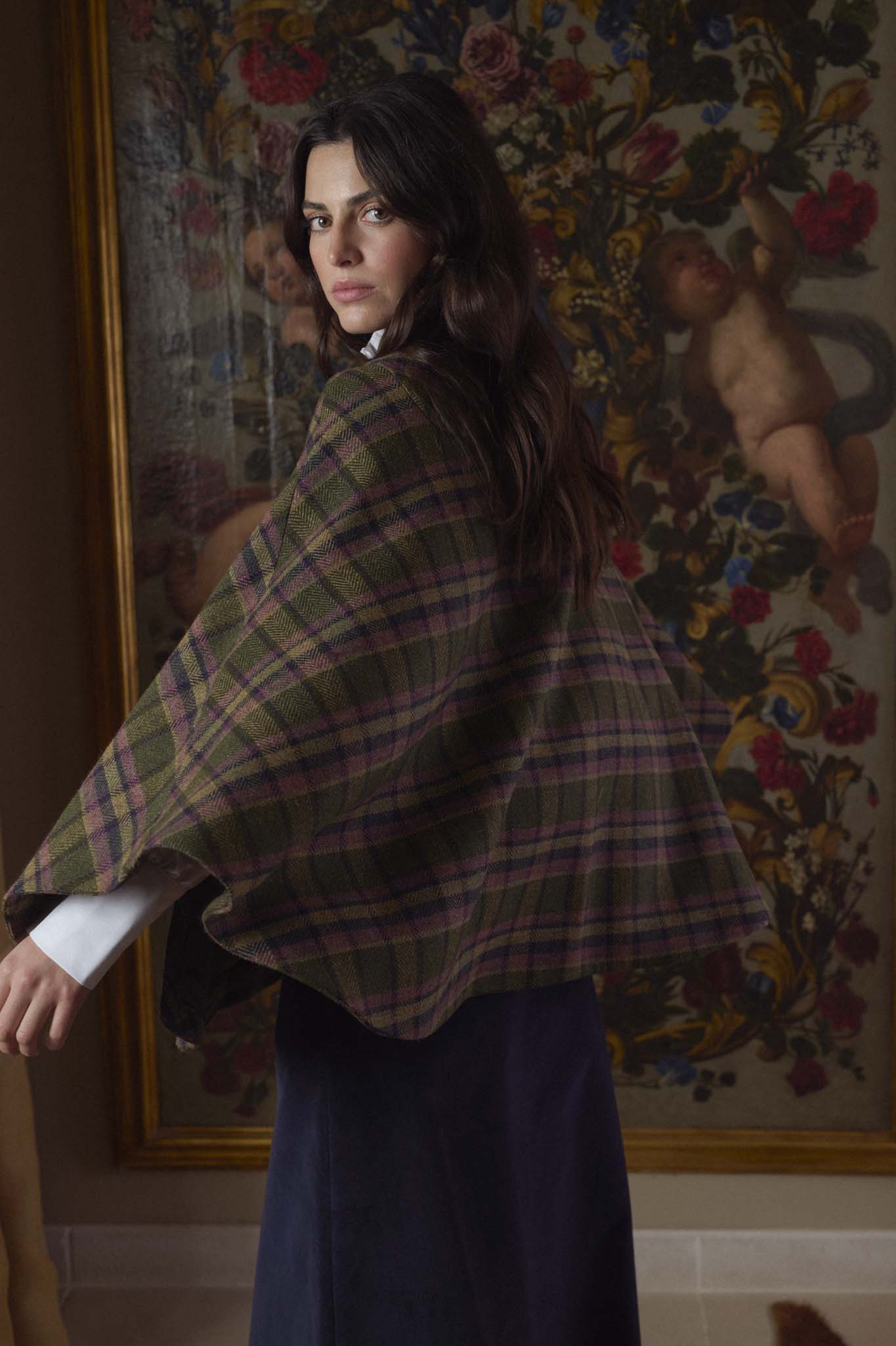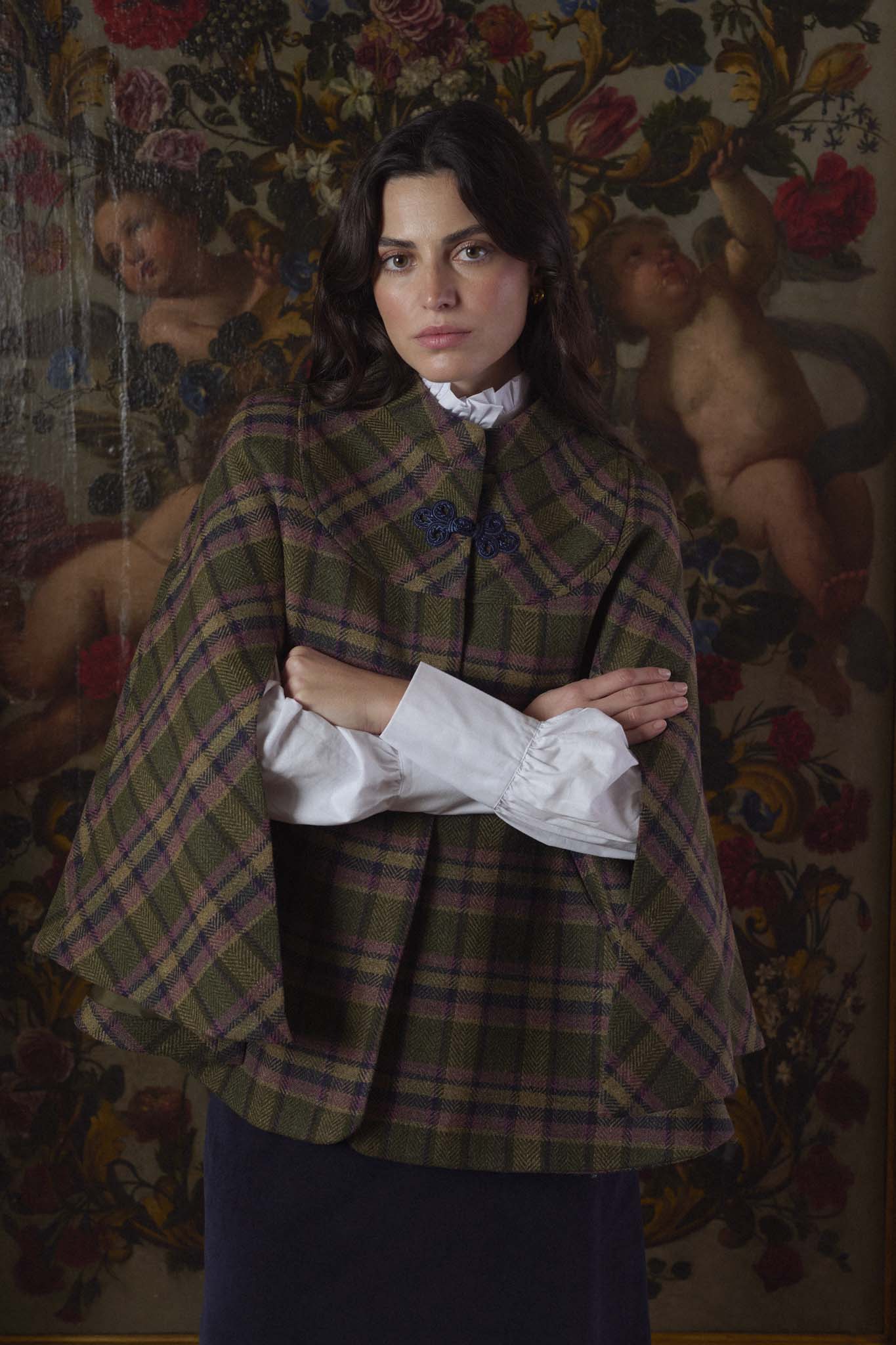 Capa de 100% lana, tejida en Salamanca, de silueta amplia con cuello alto, cierre frontal con alamar decorativo en la parte superior. Con detalles únicos como el contraste del cuadro cortado al bies en la pieza superior delantera y espalda. Incluye aberturas laterales para los brazos. Con forro interior completo. Su confección artesana en España se percibe en cada detalle y en la calidad de una prenda a la par clásica que original.