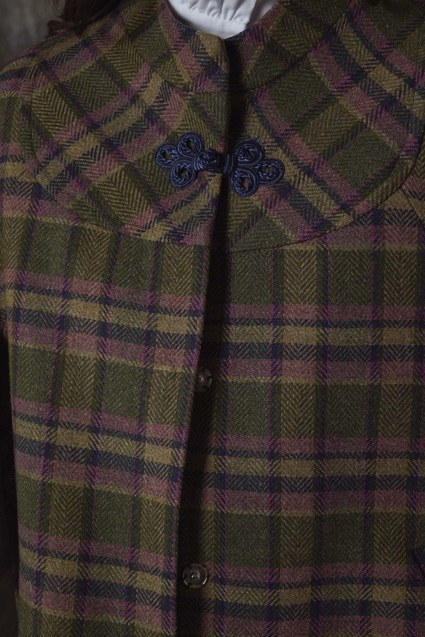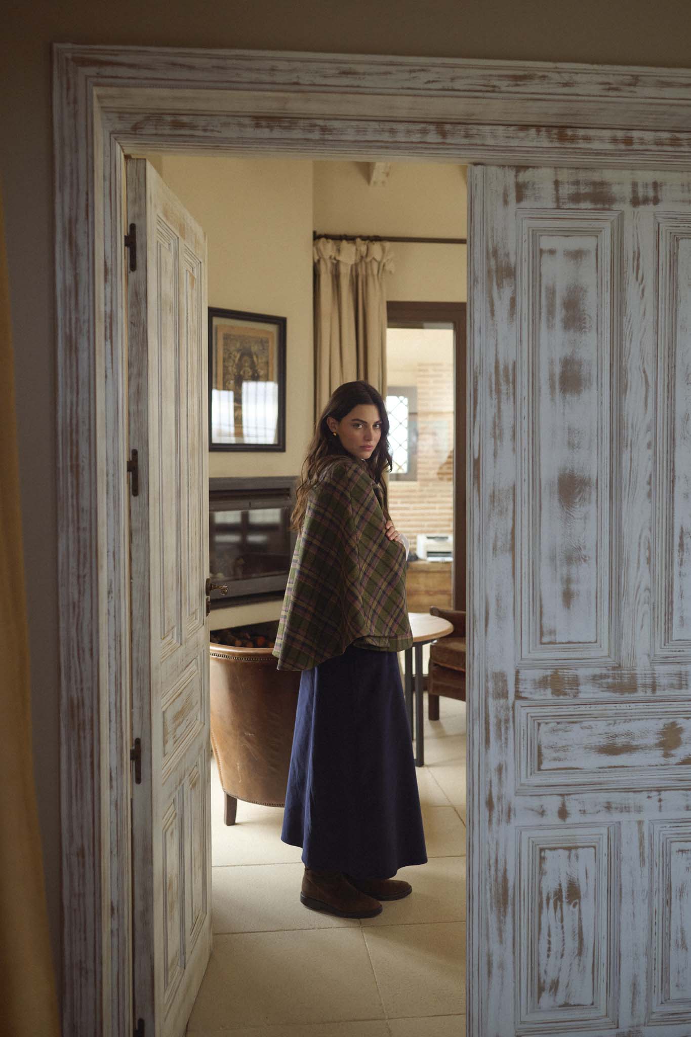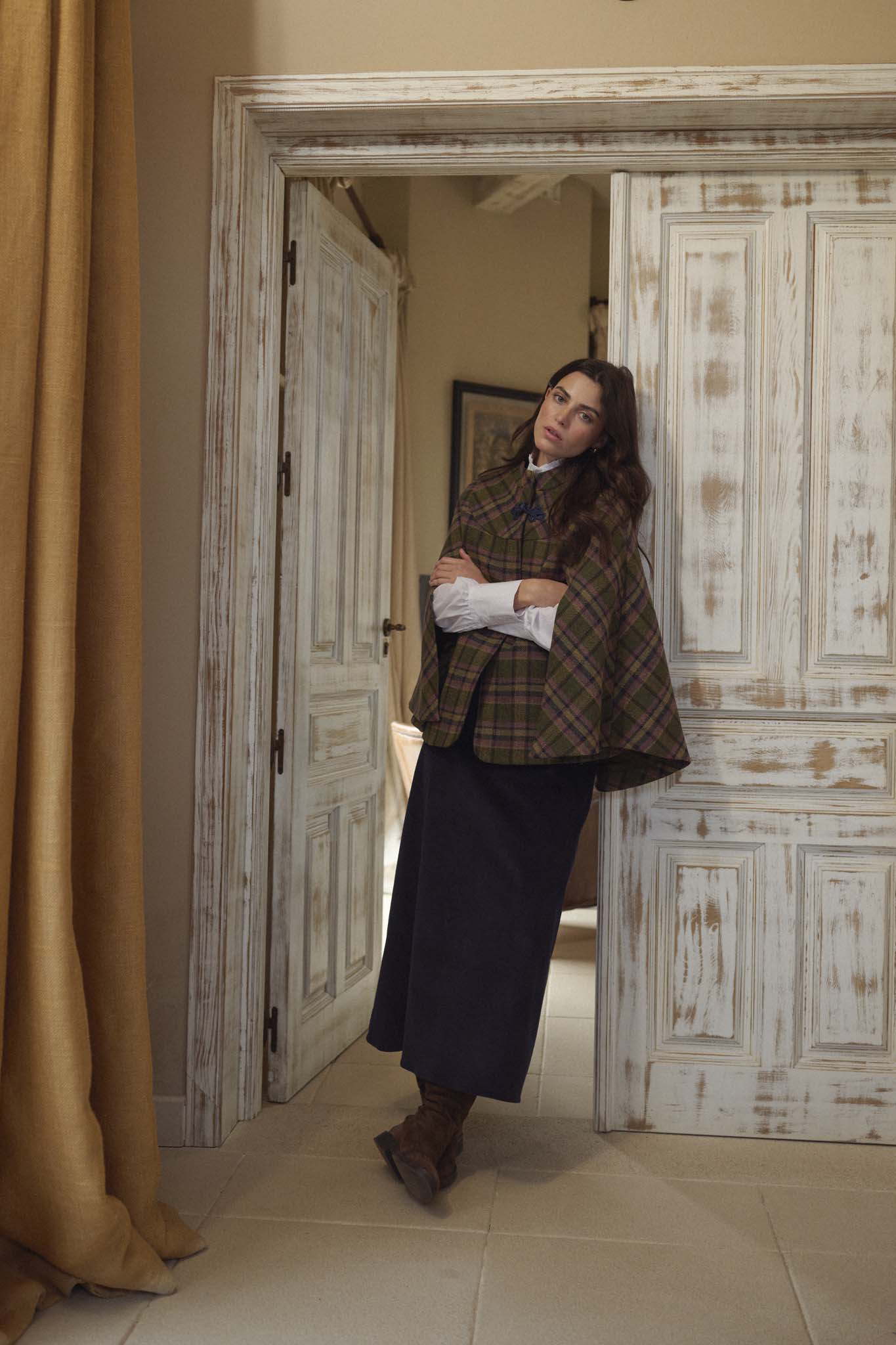 Capa de 100% lana, tejida en Salamanca, de silueta amplia con cuello alto, cierre frontal con alamar decorativo en la parte superior. Con detalles únicos como el contraste del cuadro cortado al bies en la pieza superior delantera y espalda. Incluye aberturas laterales para los brazos. Con forro interior completo. Su confección artesana en España se percibe en cada detalle y en la calidad de una prenda a la par clásica que original.