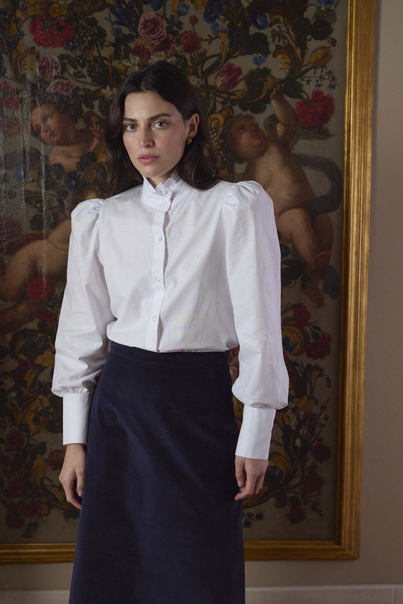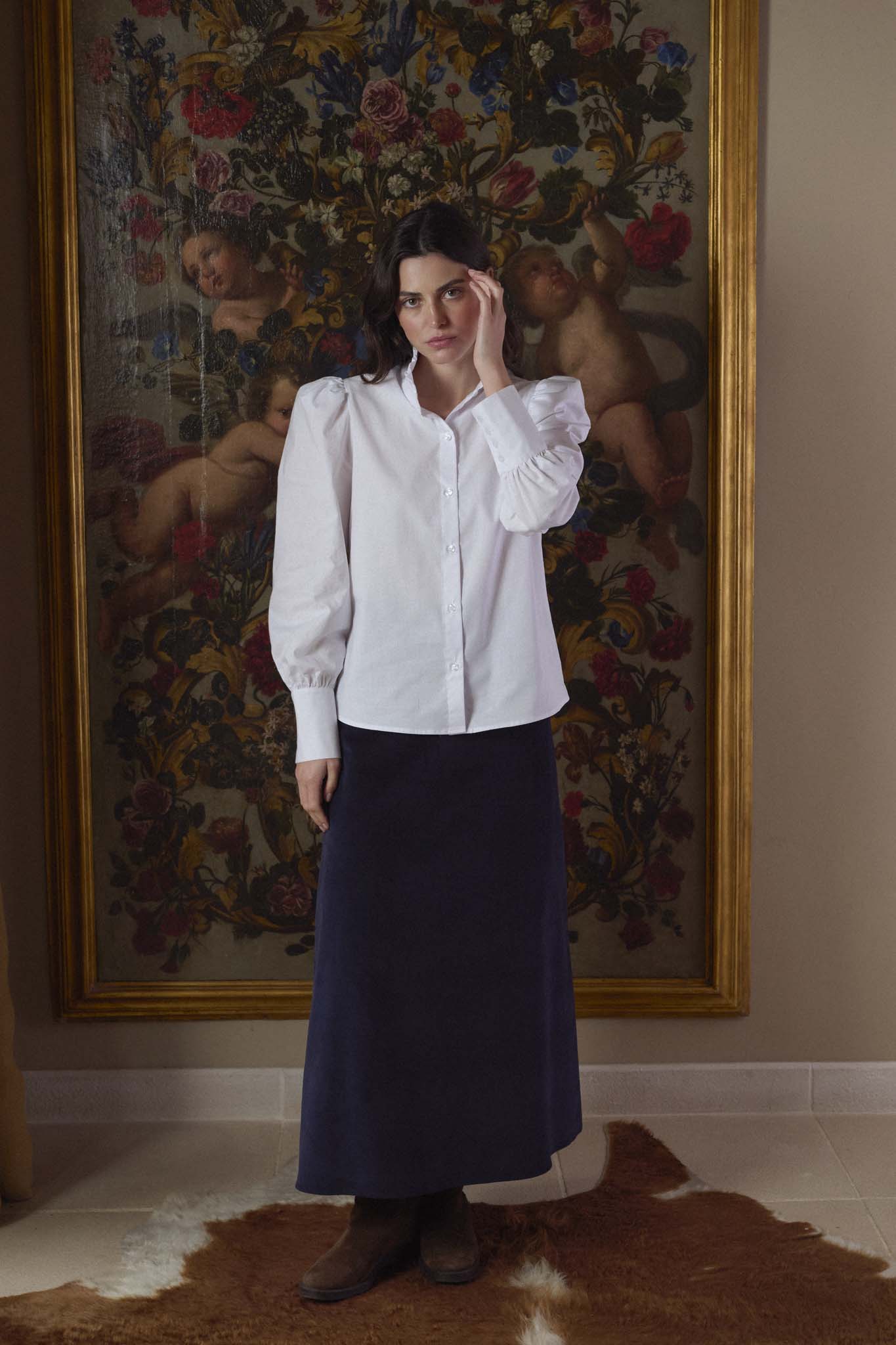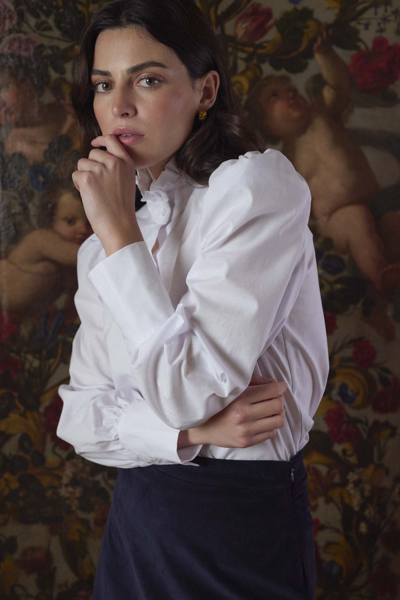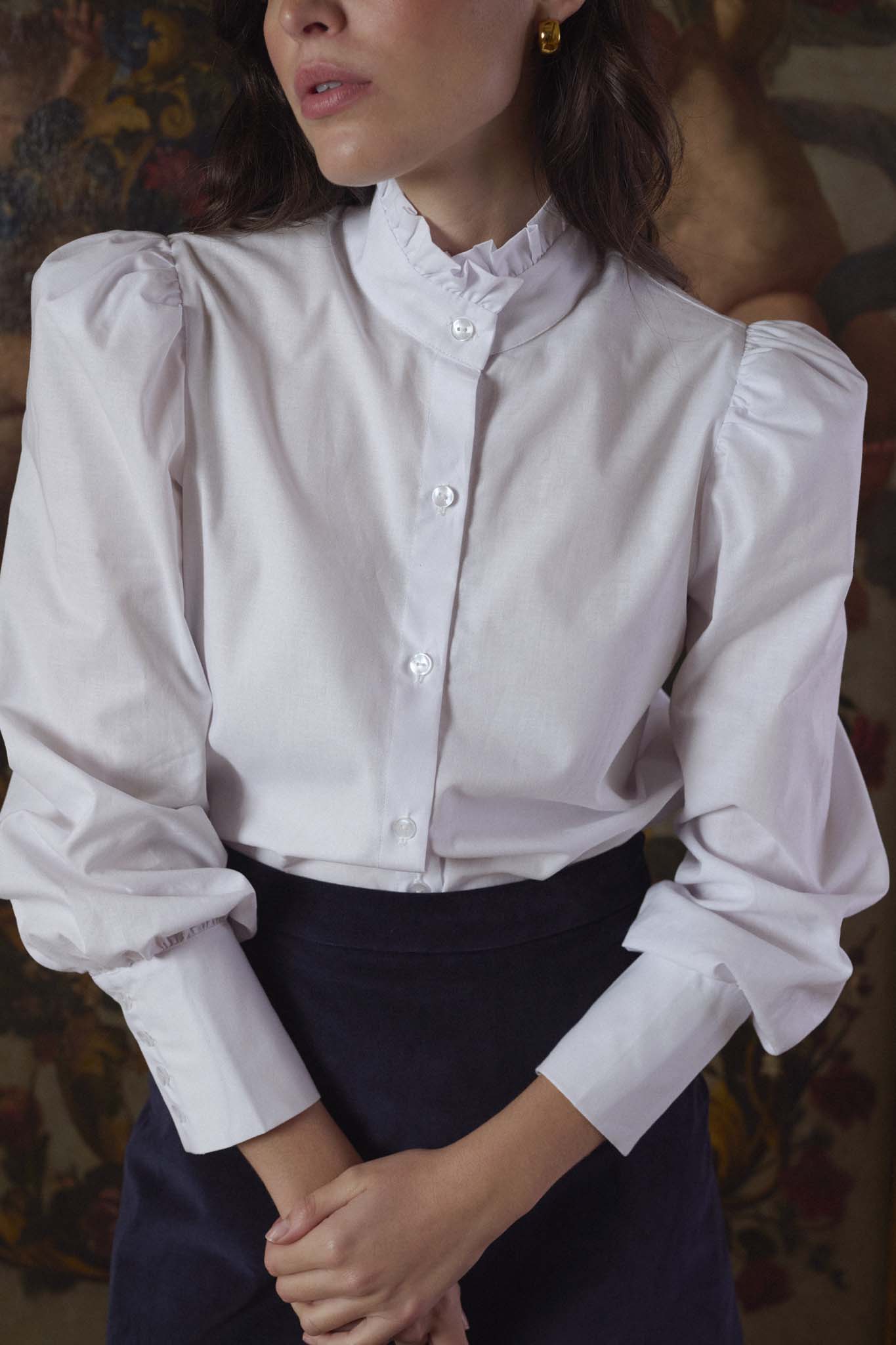Blusa con cuello con volante y mangas abullonadas con detalle de volumen en la hombrera que acaban en puño largo de 4 botones. Una prenda femenina y especial, ideal para aportar un toque suave, romántico y convertirse en el mejor básico de armario. Cada blusa ha sido diseñada para complementar tanto looks casuales como más formales, reflejando el compromiso con la excelencia y la artesanía española en cada detalle.
