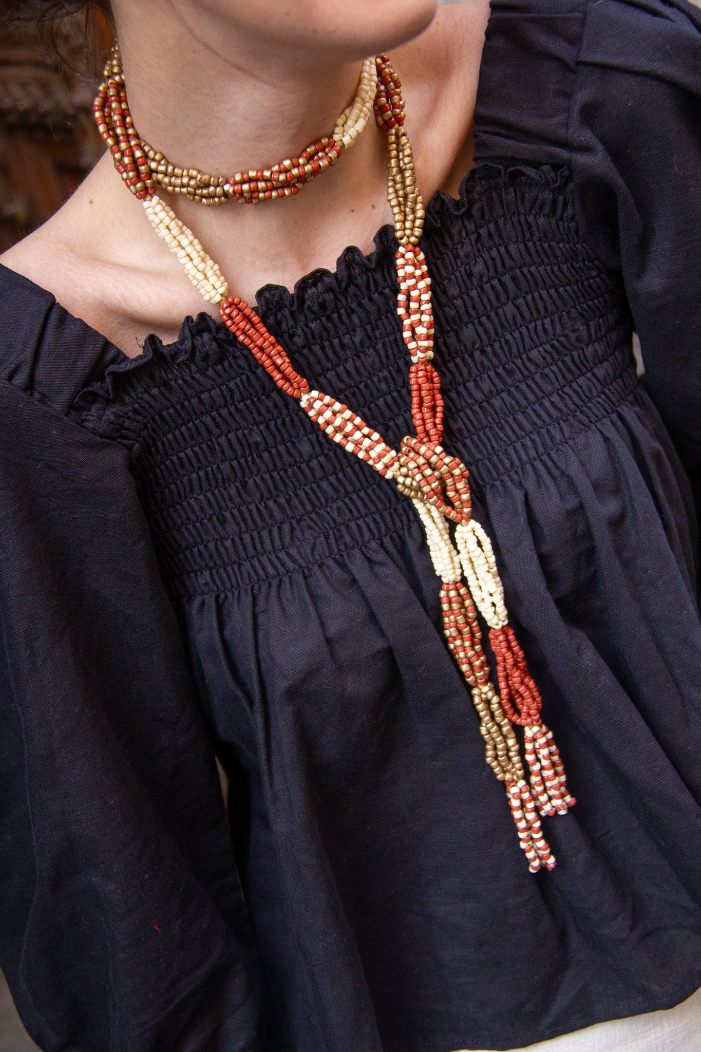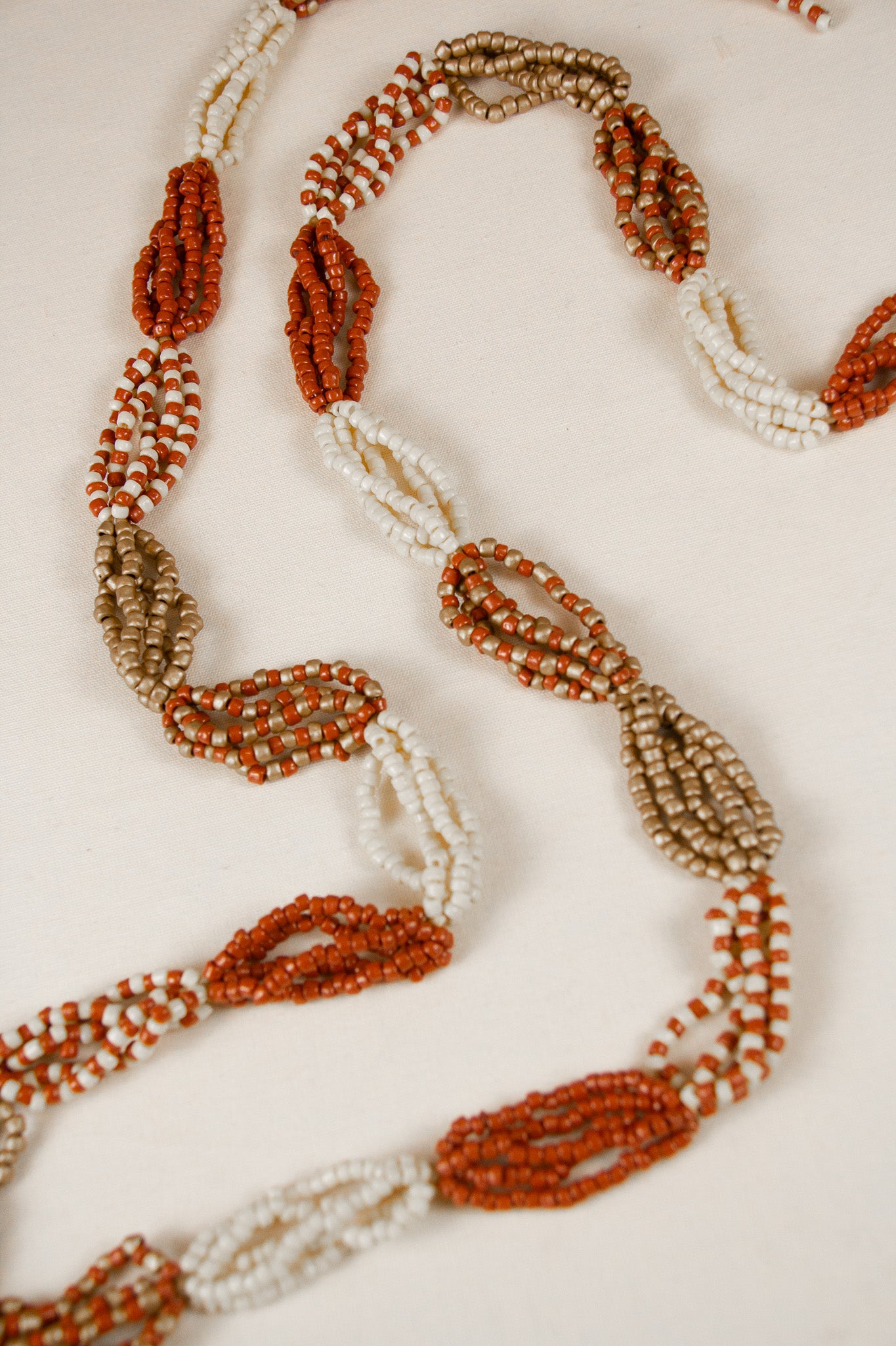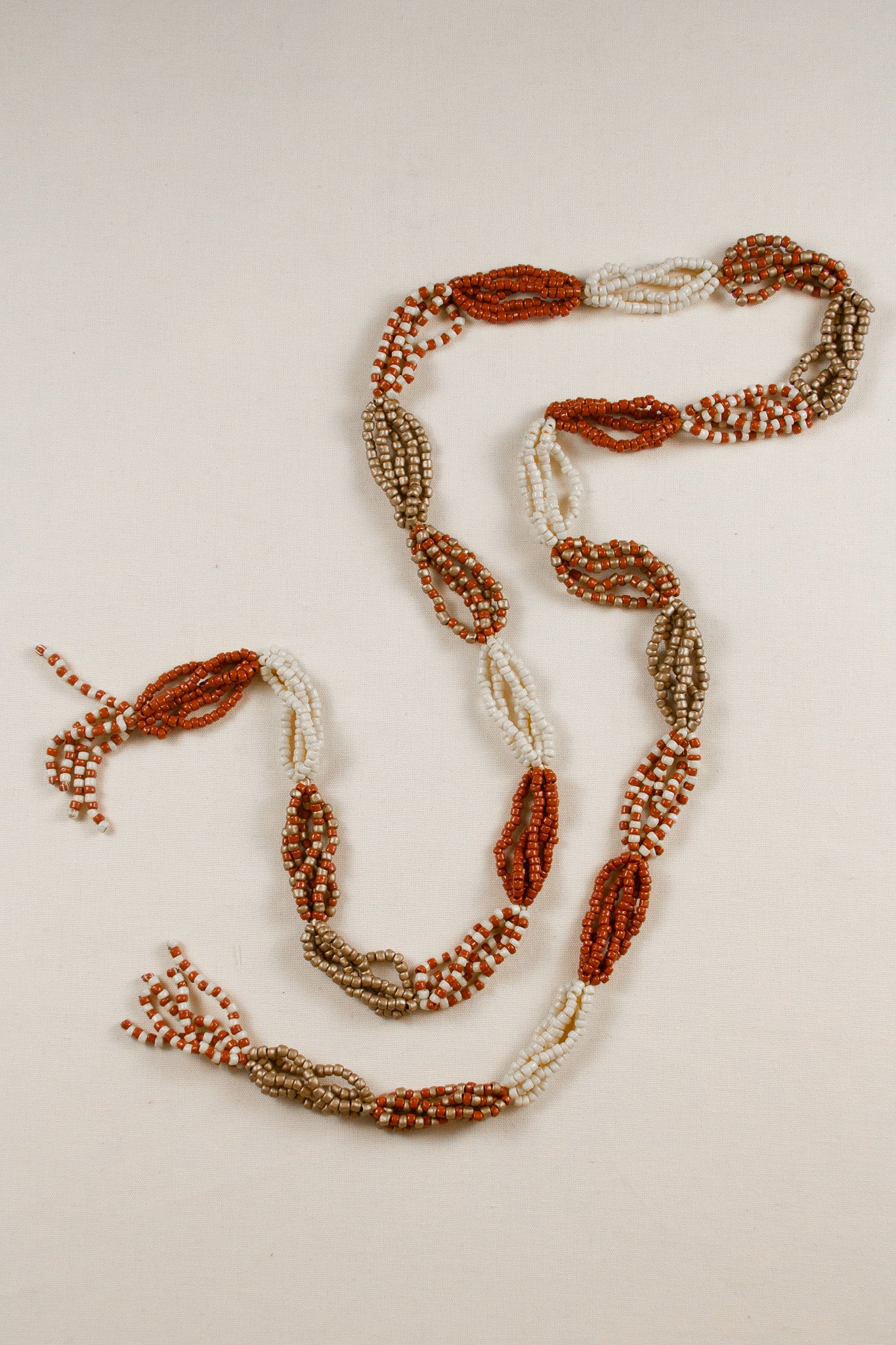 Collar-cinturón largo de cuentas unidas creando combinaciones de color y patrones, terminando en forma de borla. En tonos coral, tierra, crudo y dorado.