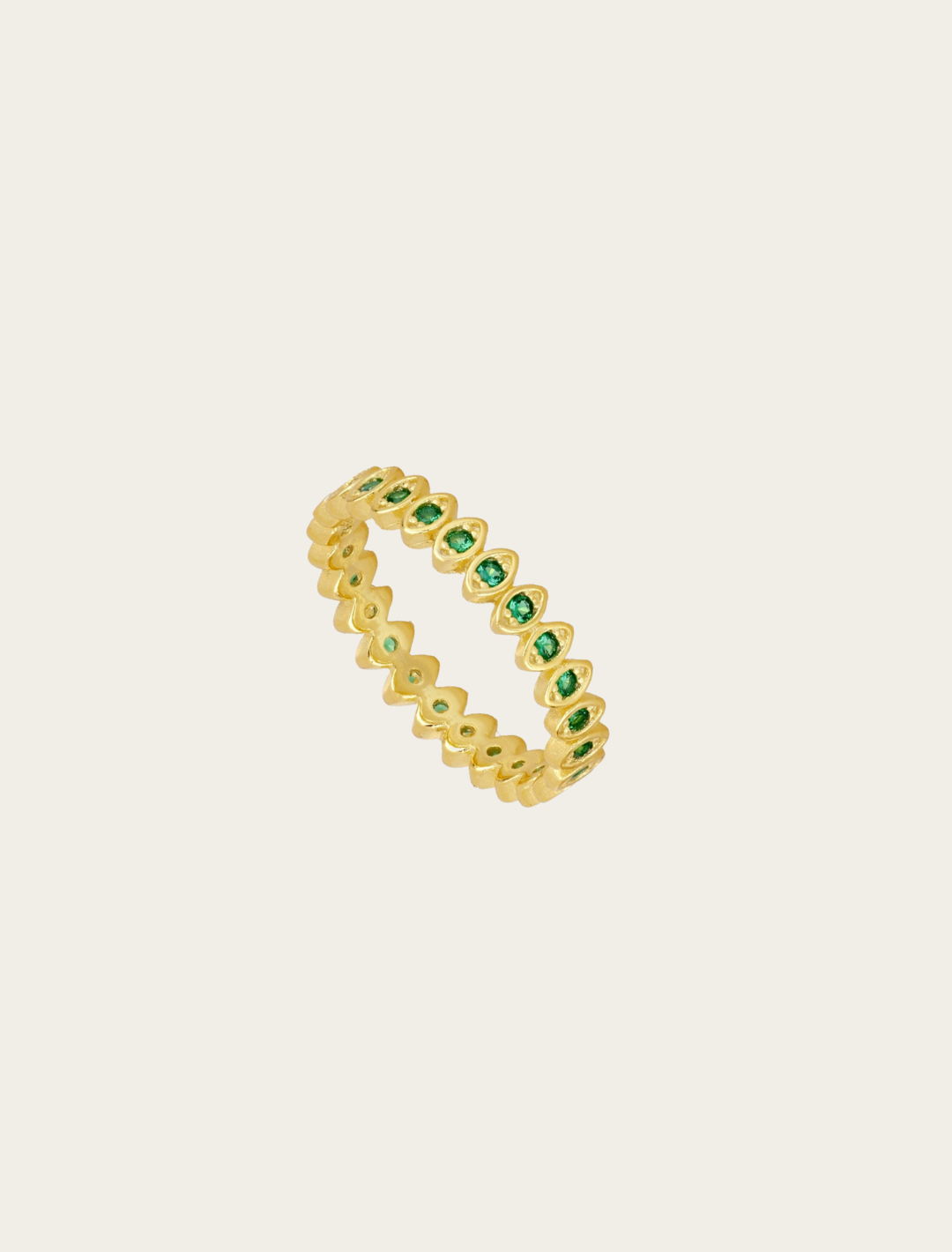 Material: Plata de primera ley y plata 925 bañada con oro de 18k Piedra: circonitas verdes Anchura: 4mm