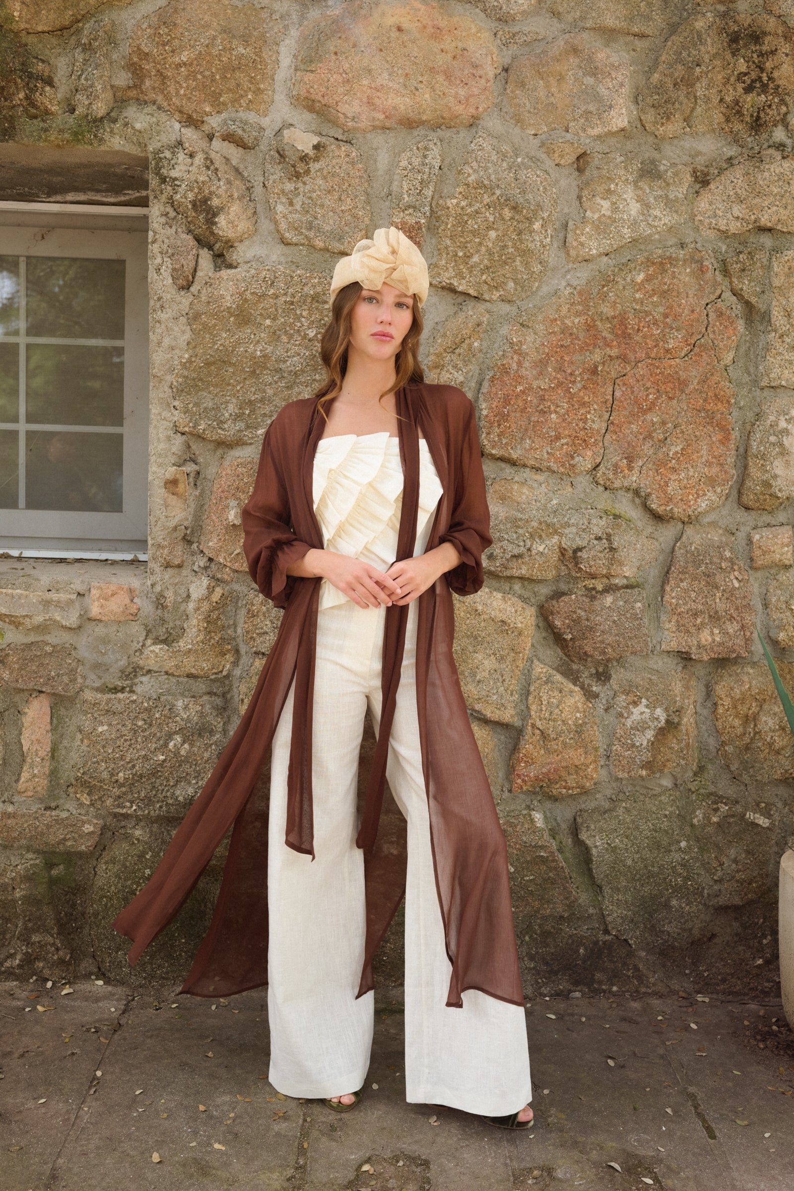 Chaqueta de gasa abierta en tono marrón confeccionada artesanalmente en España, con un diseño ligero y fluido pensado para aportar movimiento y elegancia a cualquier look de invitada.
