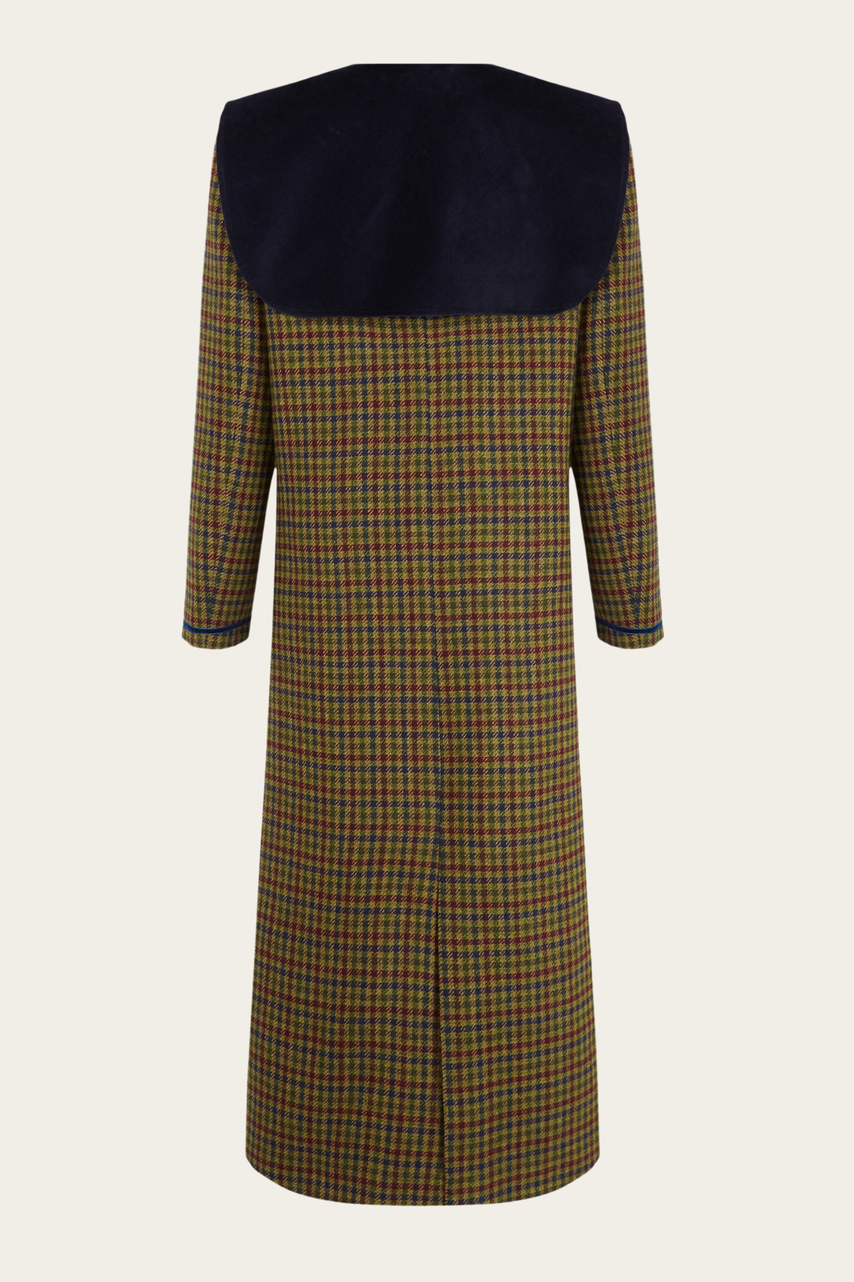 La capelina trasera, elaborada en terciopelo azul, aporta un toque distintivo y refinado, resaltando el carácter exclusivo del diseño. Cerrado con dos botones forrados y un botón interior, el abrigo Gabriella es una pieza que no solo celebra las historias del pasado, sino que crea nuevas memorias para quienes lo visten y lo heredan.