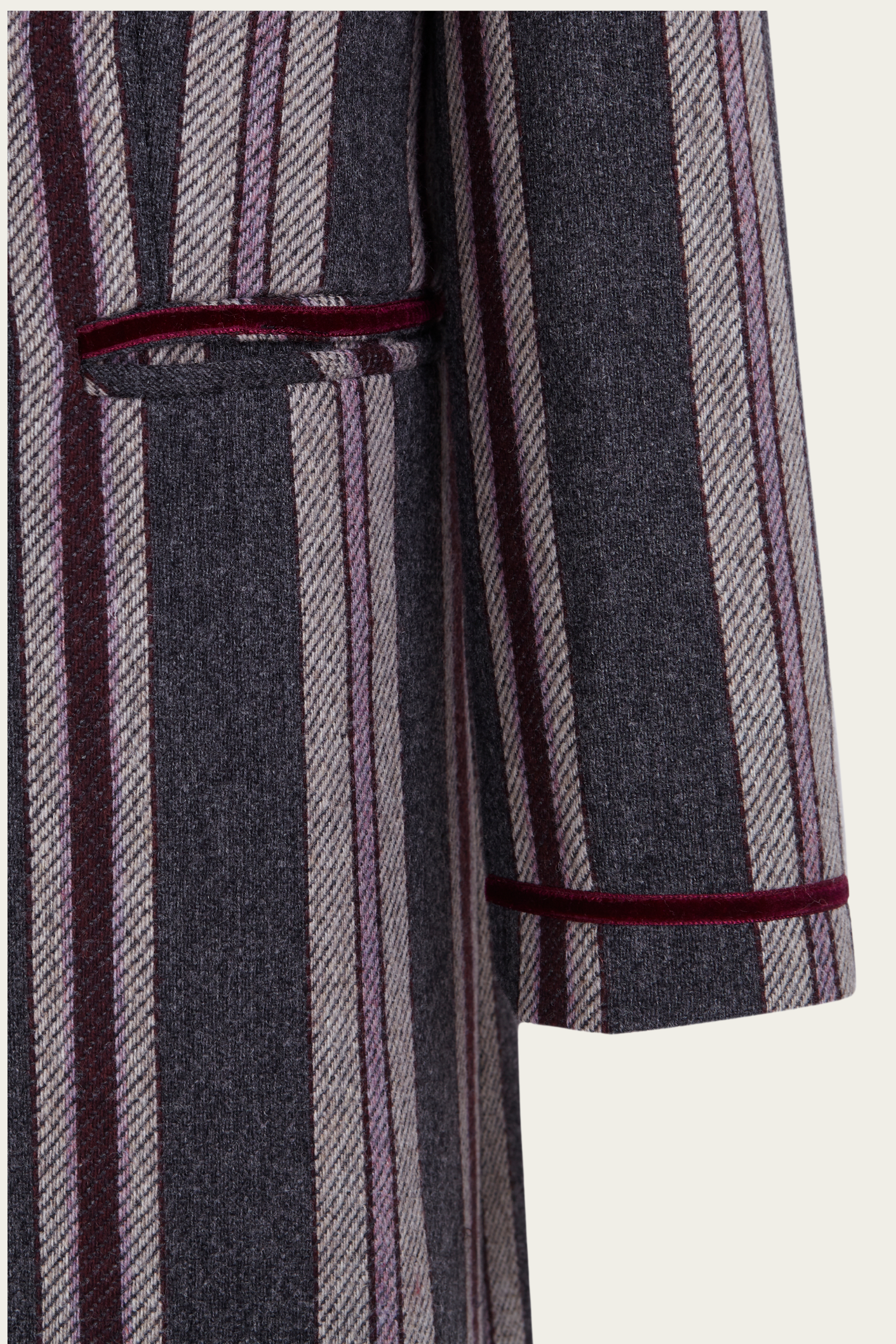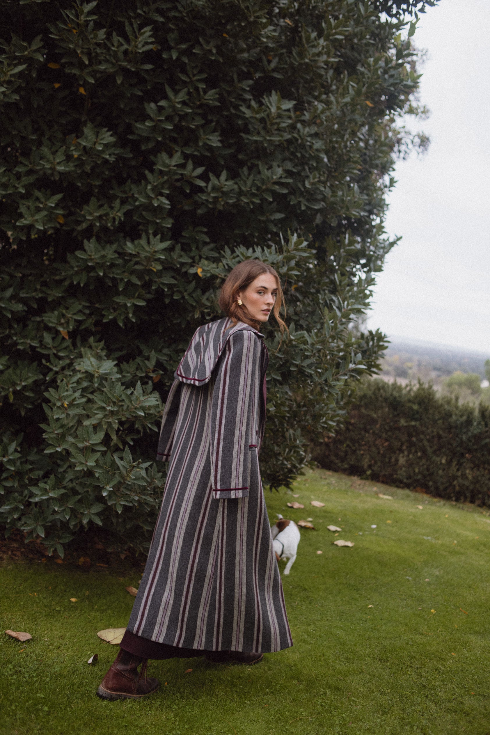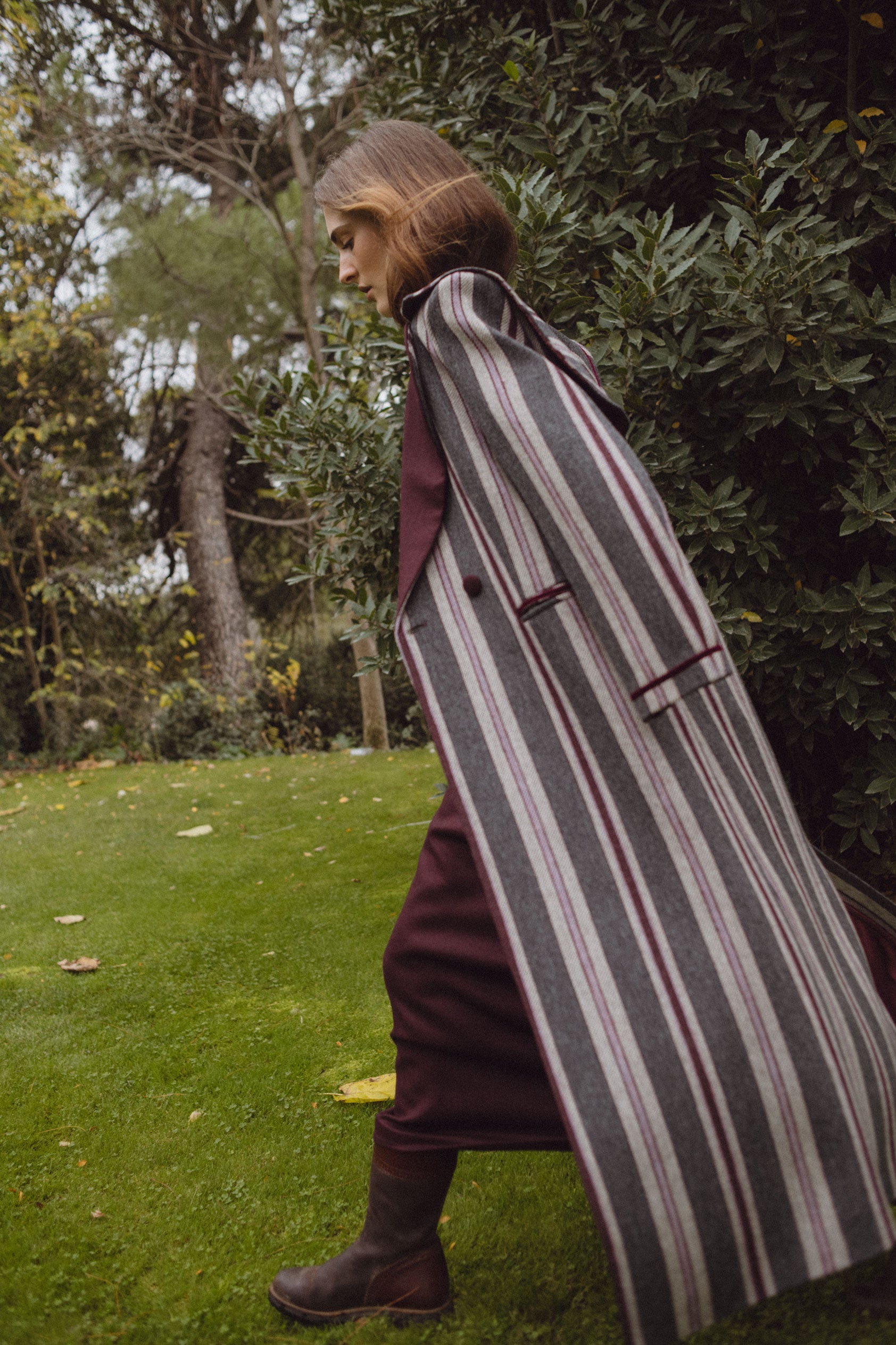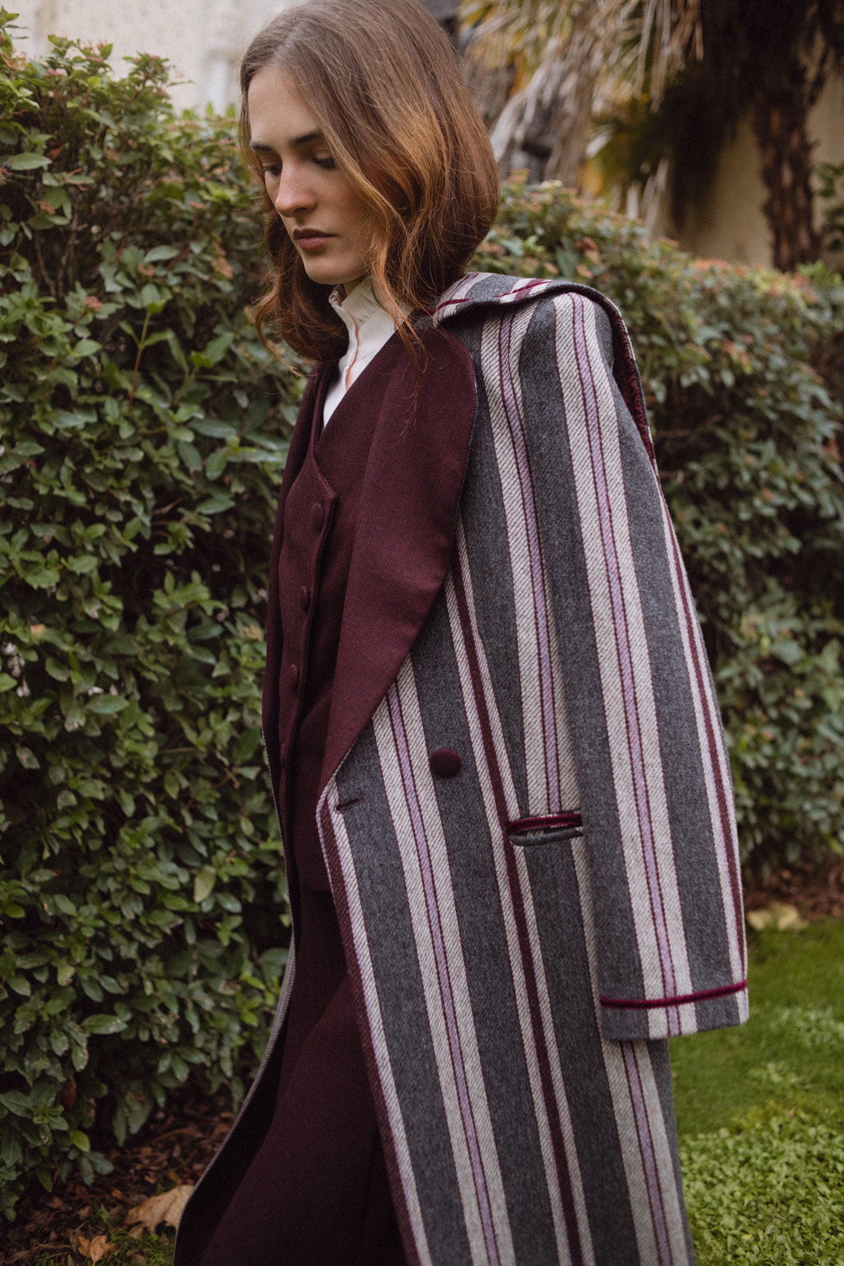 El abrigo James combina rayas en tonos burdeos y grises, juega con texturas que añaden profundidad y personalidad a la prenda, mientras que su solapa en cashmere burdeos a contraste refuerza su aire tradicional y elegante.