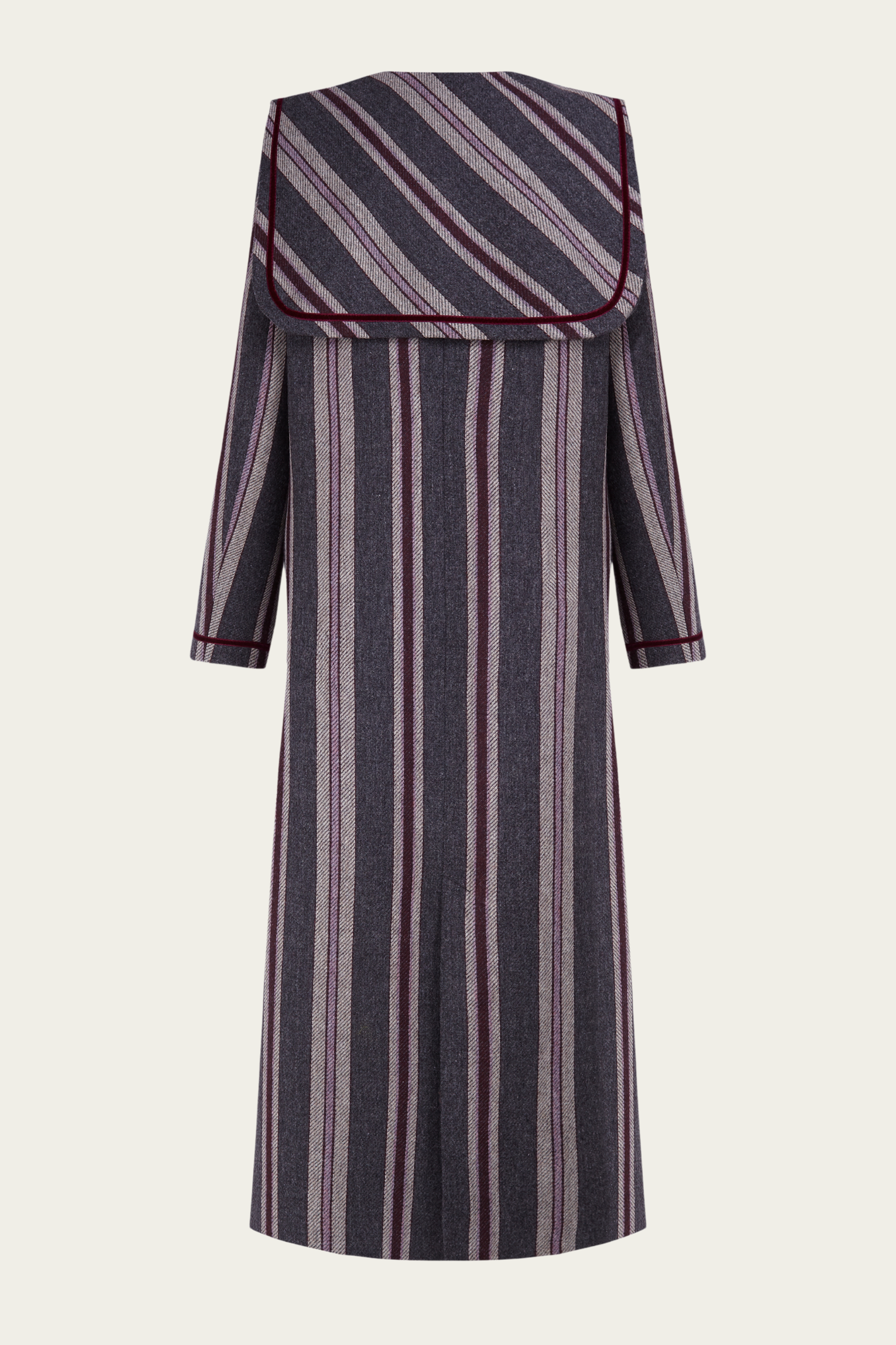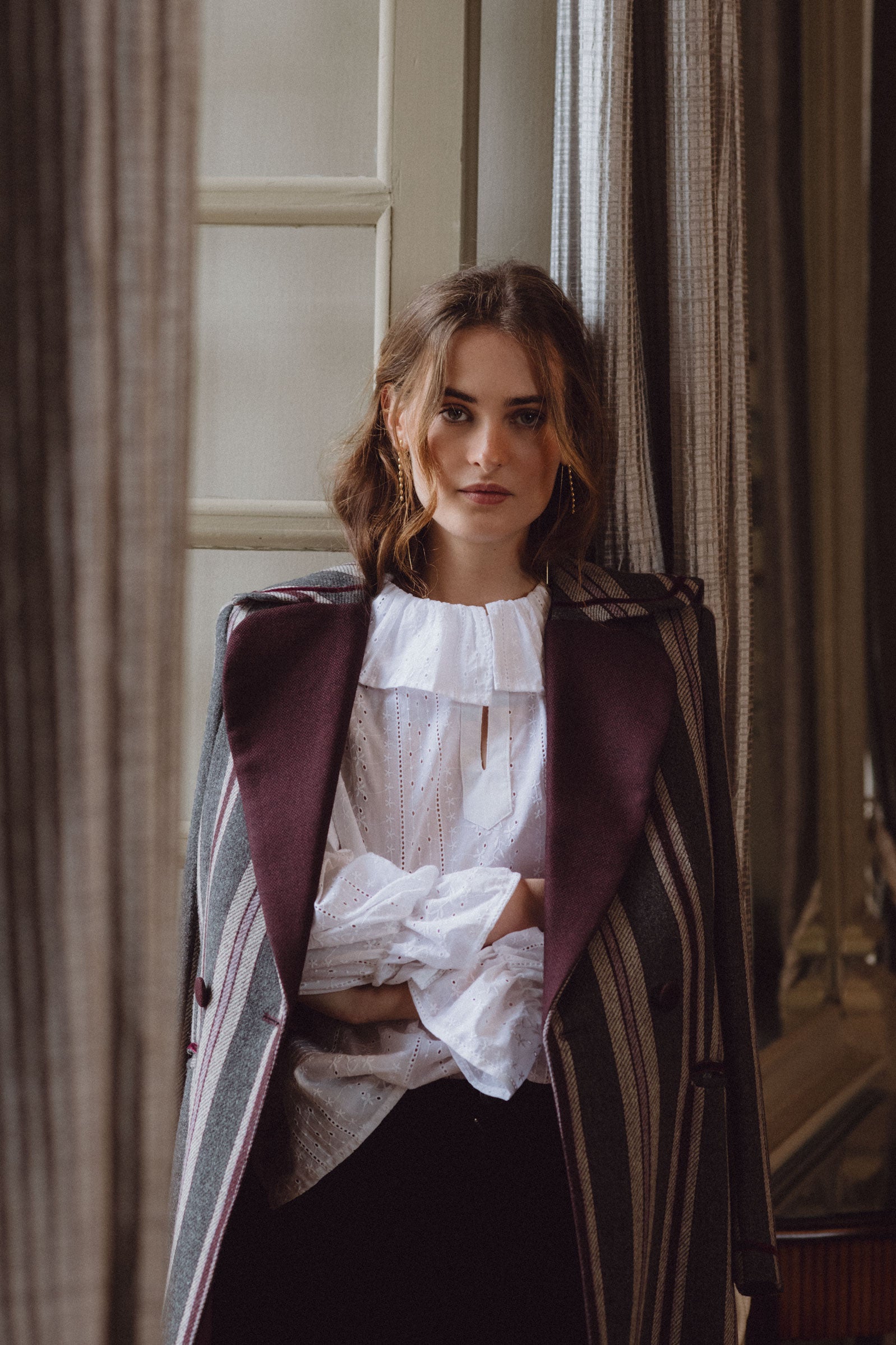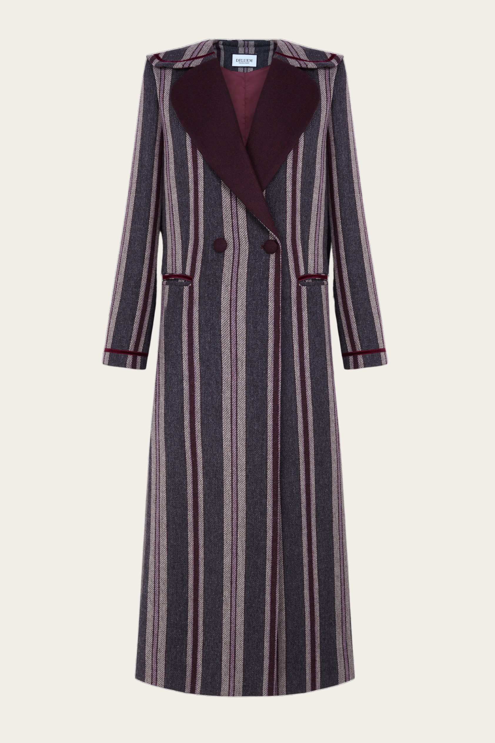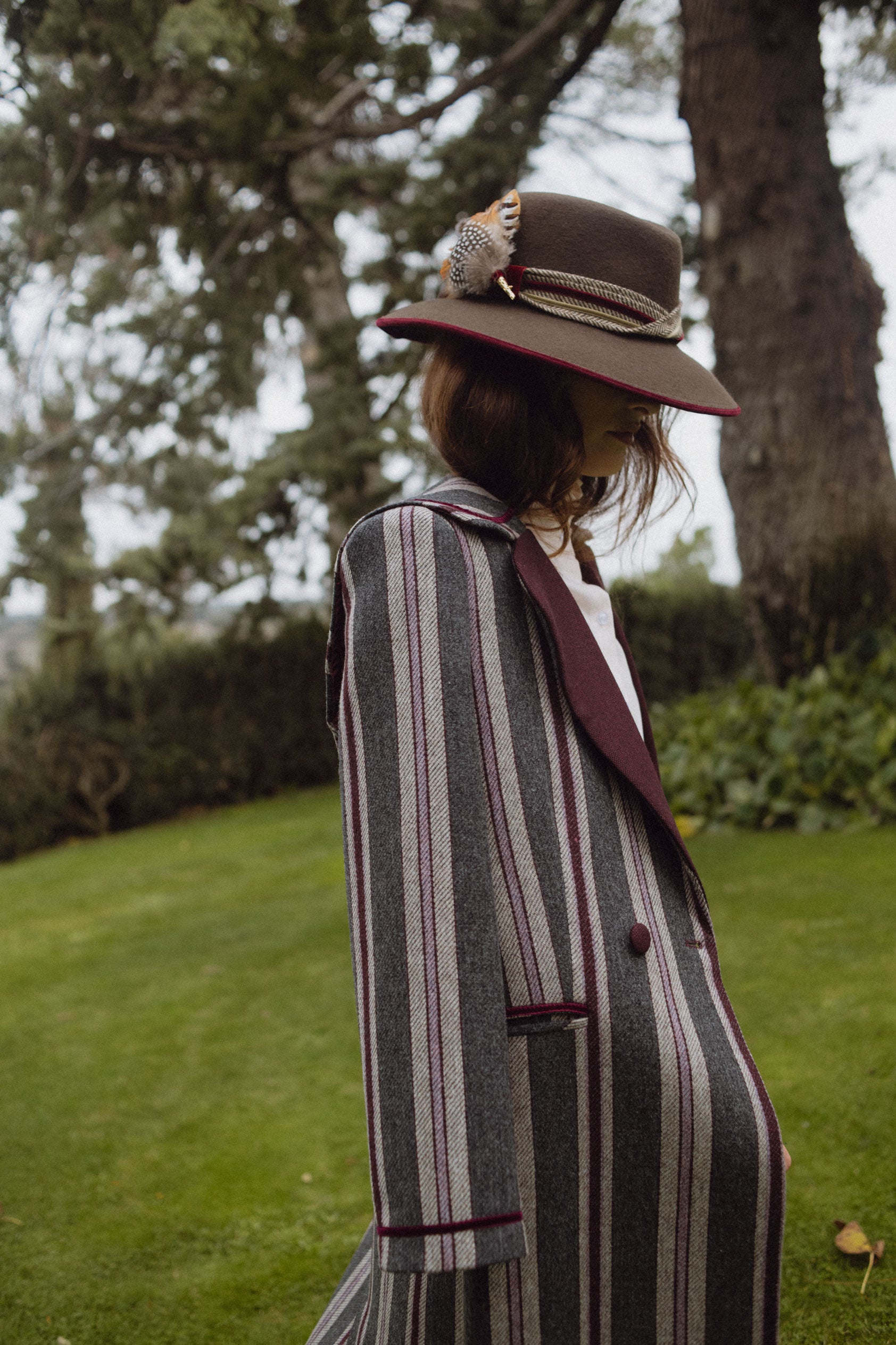 El abrigo James combina rayas en tonos burdeos y grises, juega con texturas que añaden profundidad y personalidad a la prenda, mientras que su solapa en cashmere burdeos a contraste refuerza su aire tradicional y elegante.