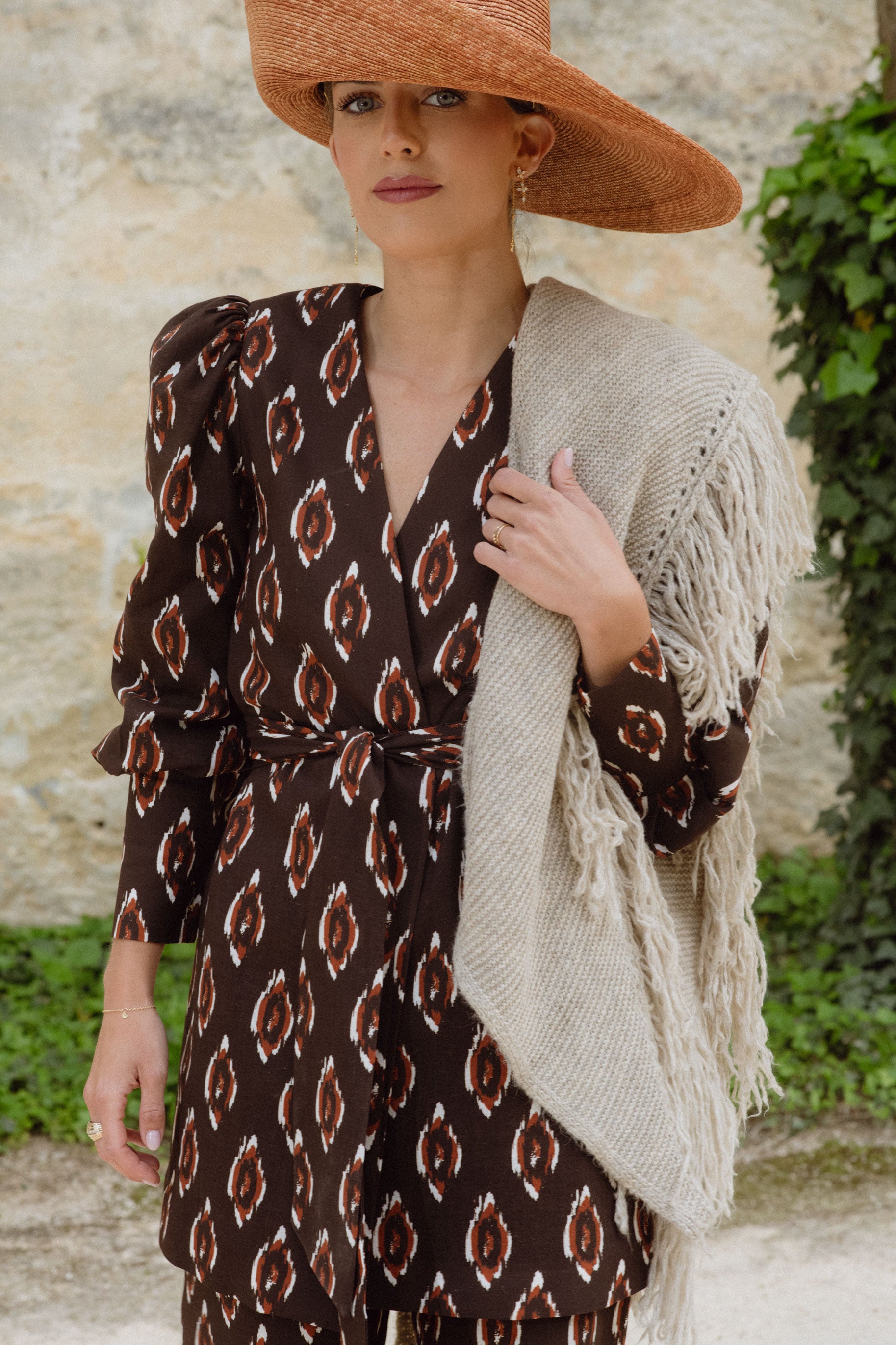 Chaqueta de lino diseñada y confeccionada en España de forma artesanal. Incluye un fajín desmontable que te permite jugar con el estilo, adaptándola a cada ocasión. Las mangas abullonadas y el escote en pico aportan un aire romántico y femenino, ideal para ocasiones especiales como bautizos, bodas, pedidas o comuniones.