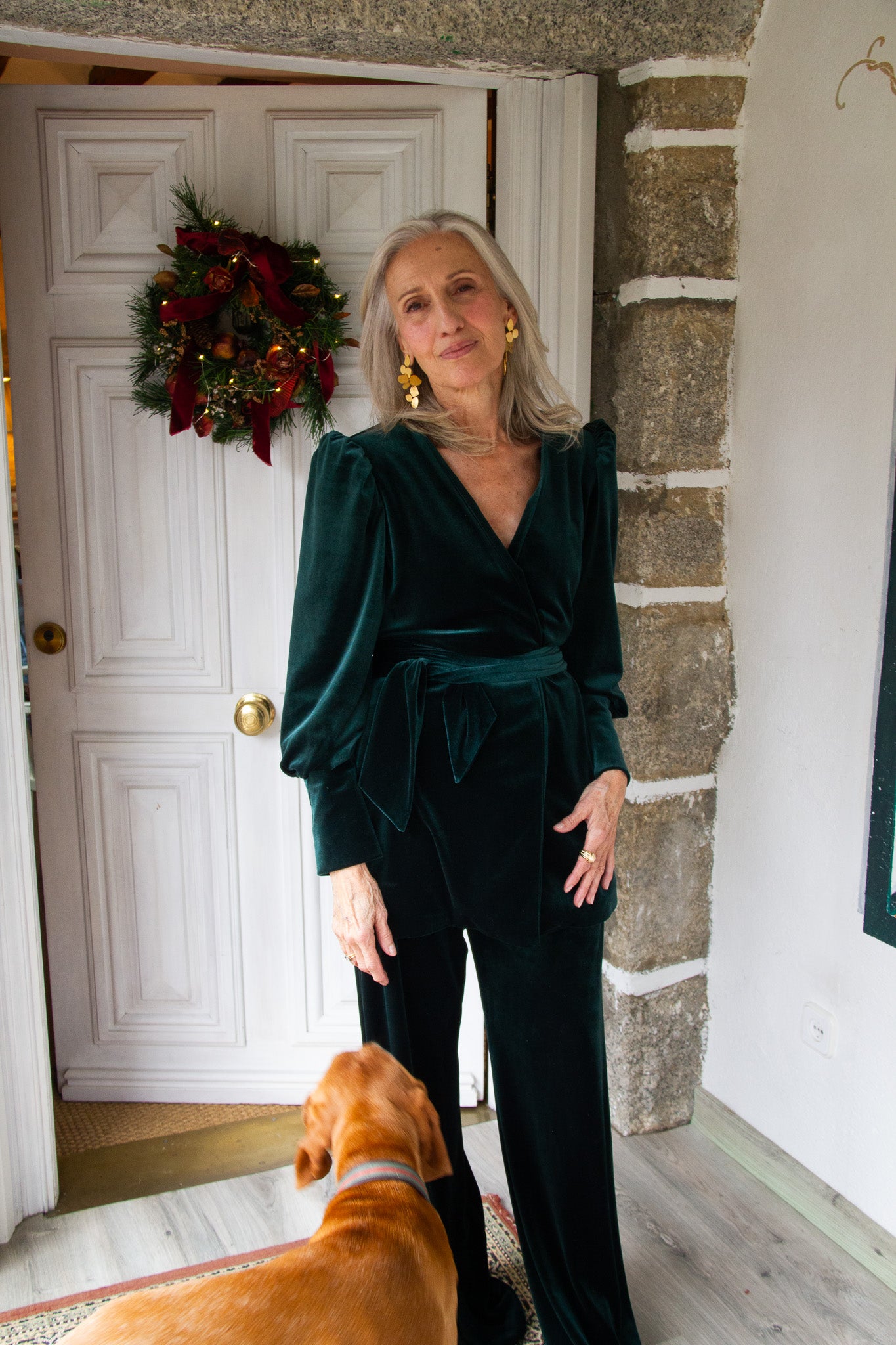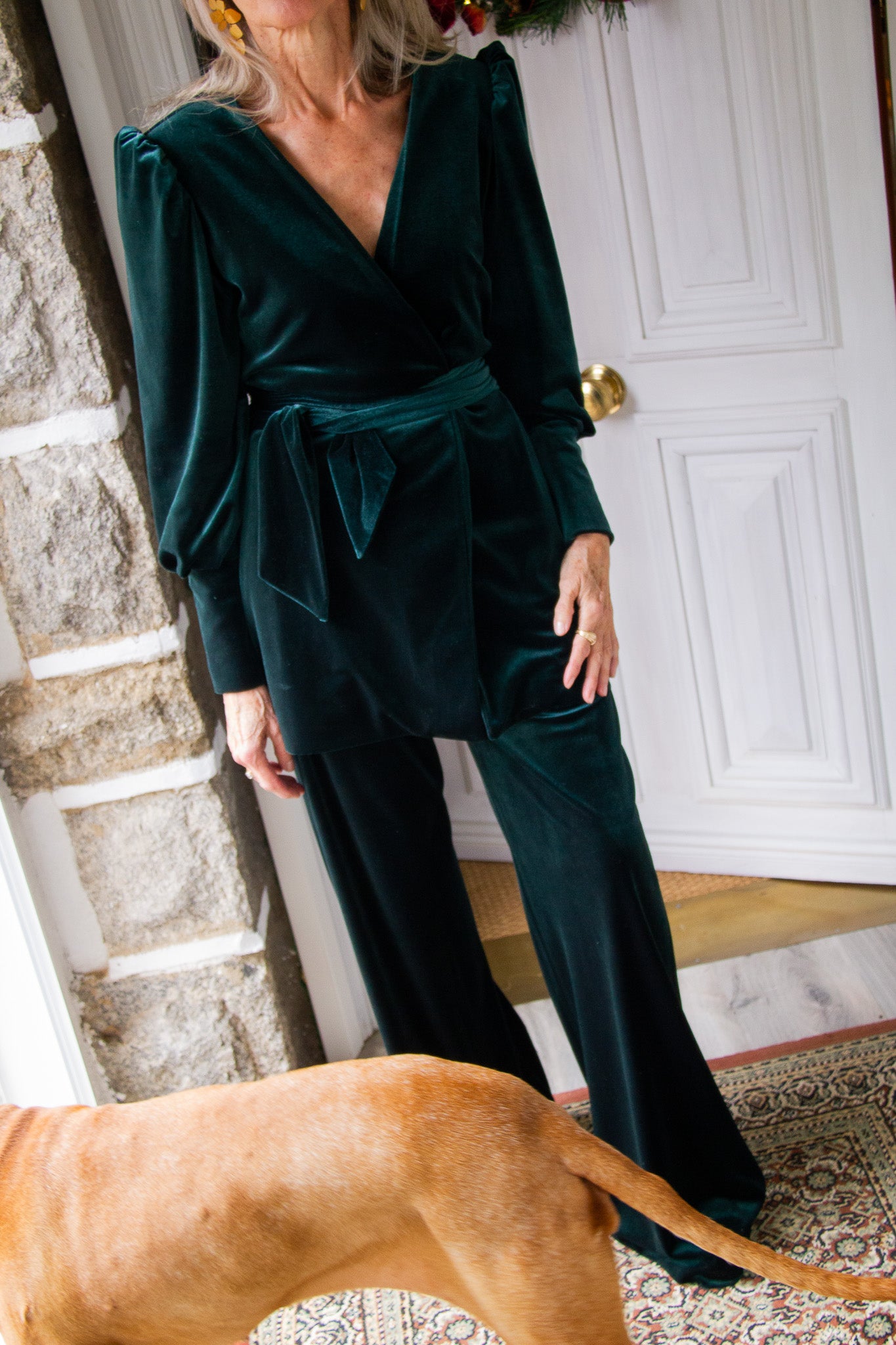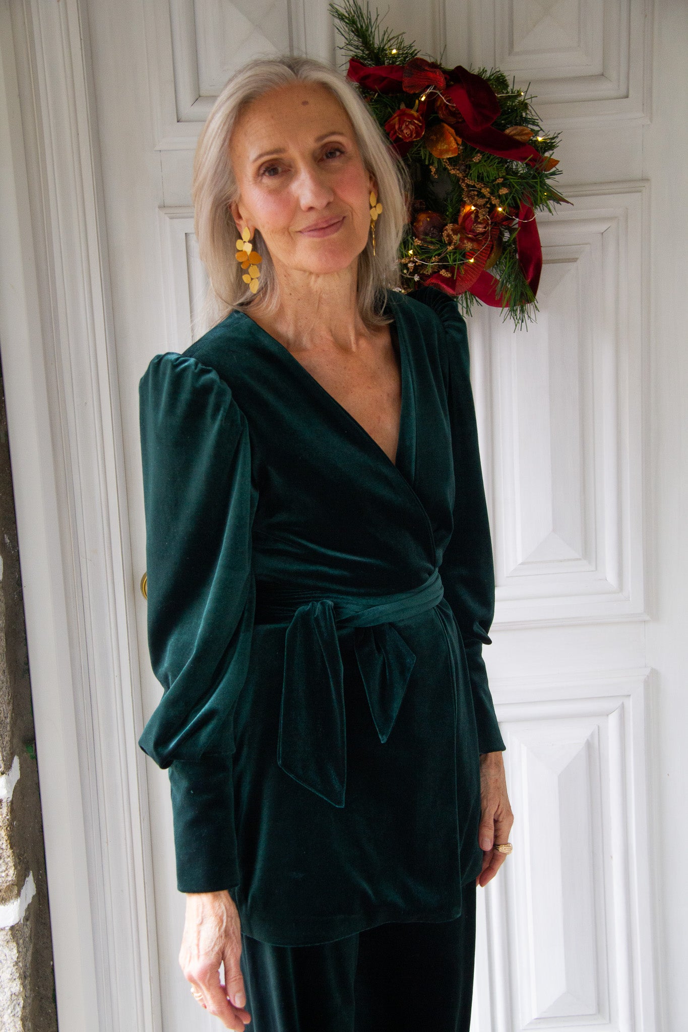 Chaqueta en terciopelo de manga abullonada y puños largos. Cierre cruzado con fajín, se puede llevar tanto cerrada con escote en pico como abierta. Versátil y elegante, será la aliada perfecta para estas Navidades y cualquier evento que se te presente. La prenda perfecta para las invitadas de invierno.