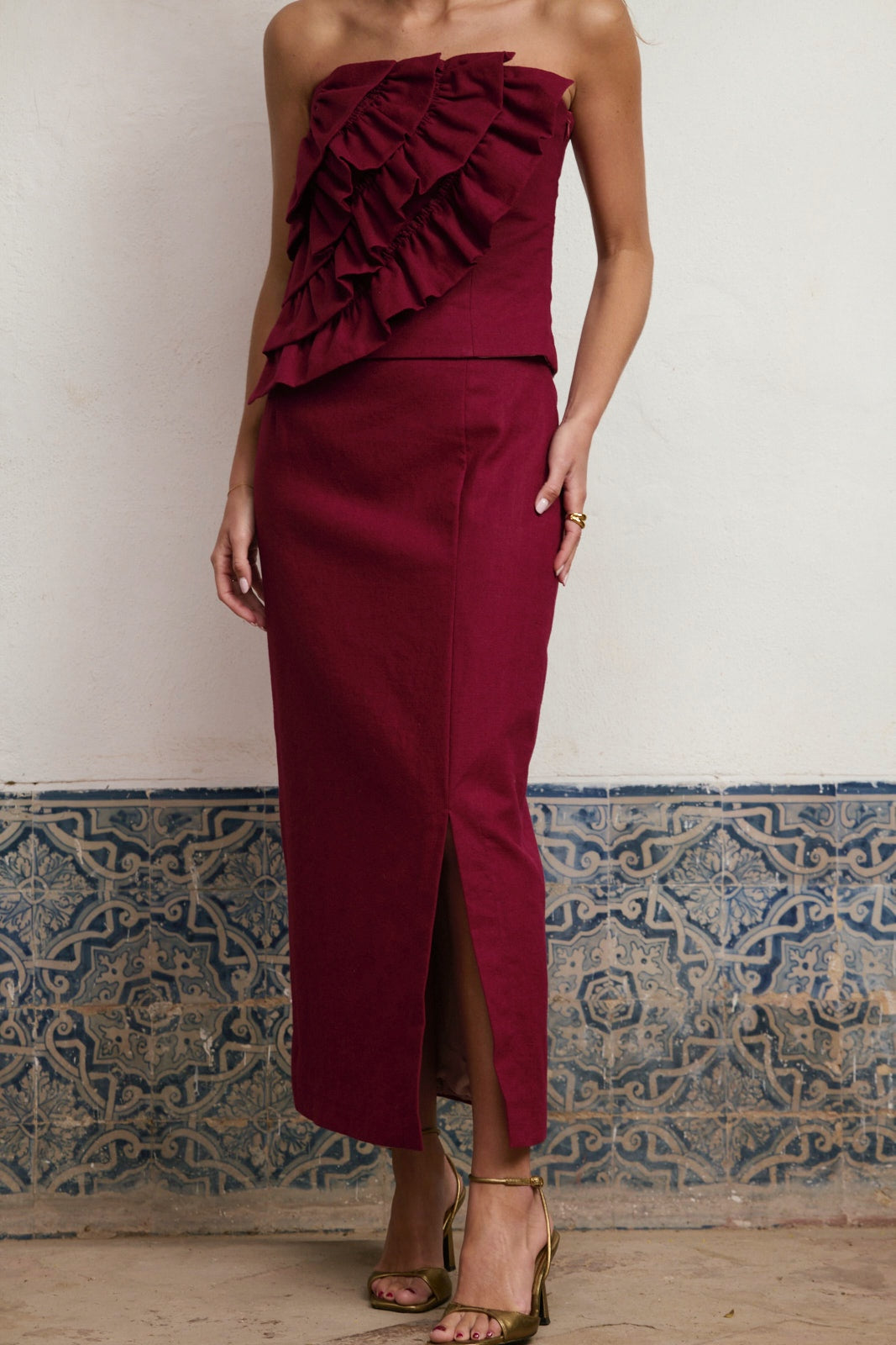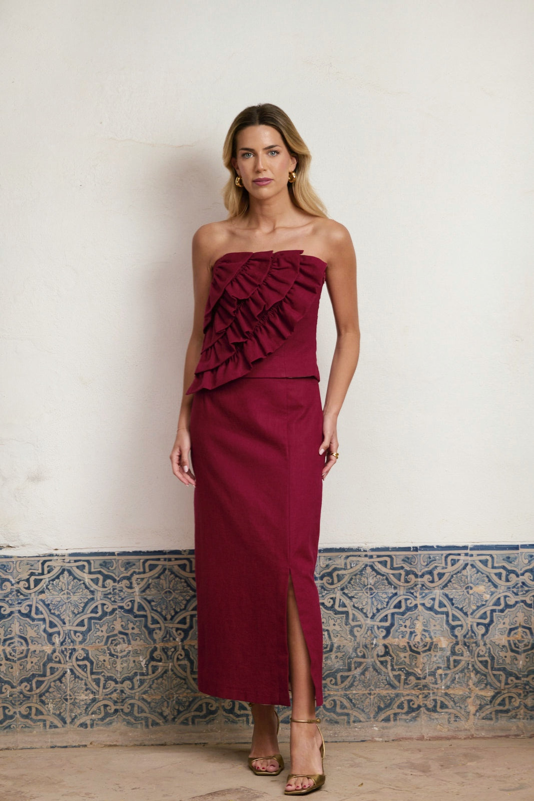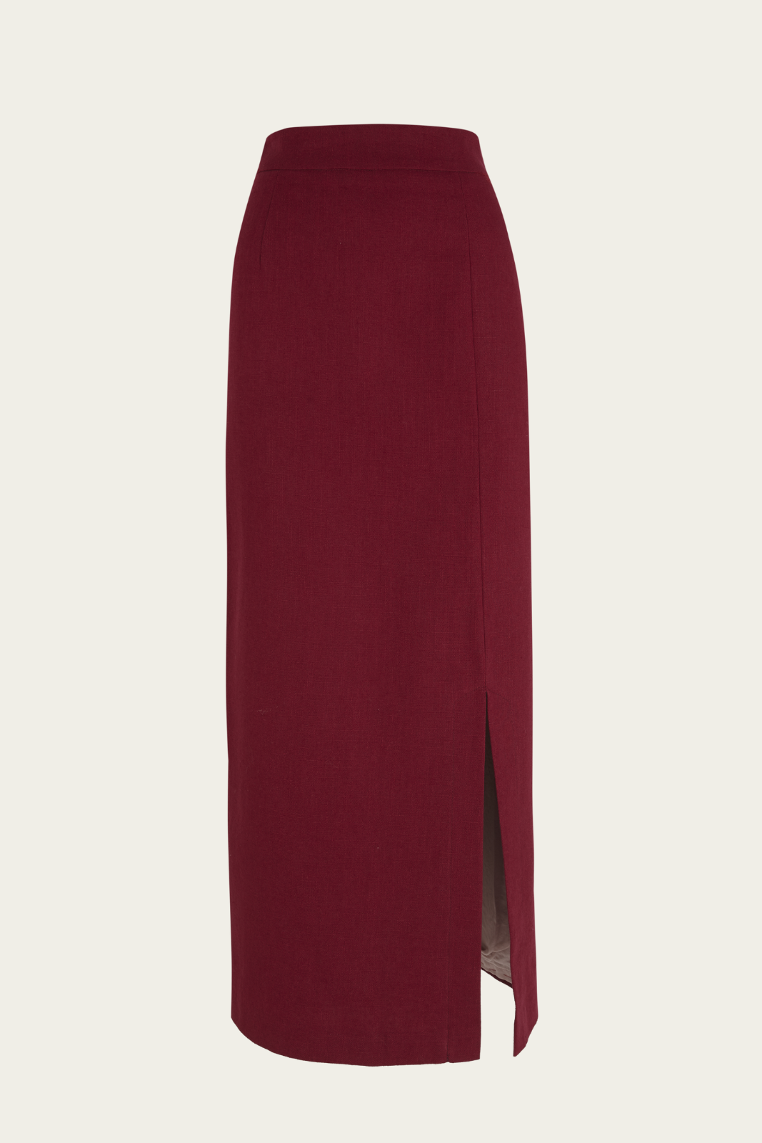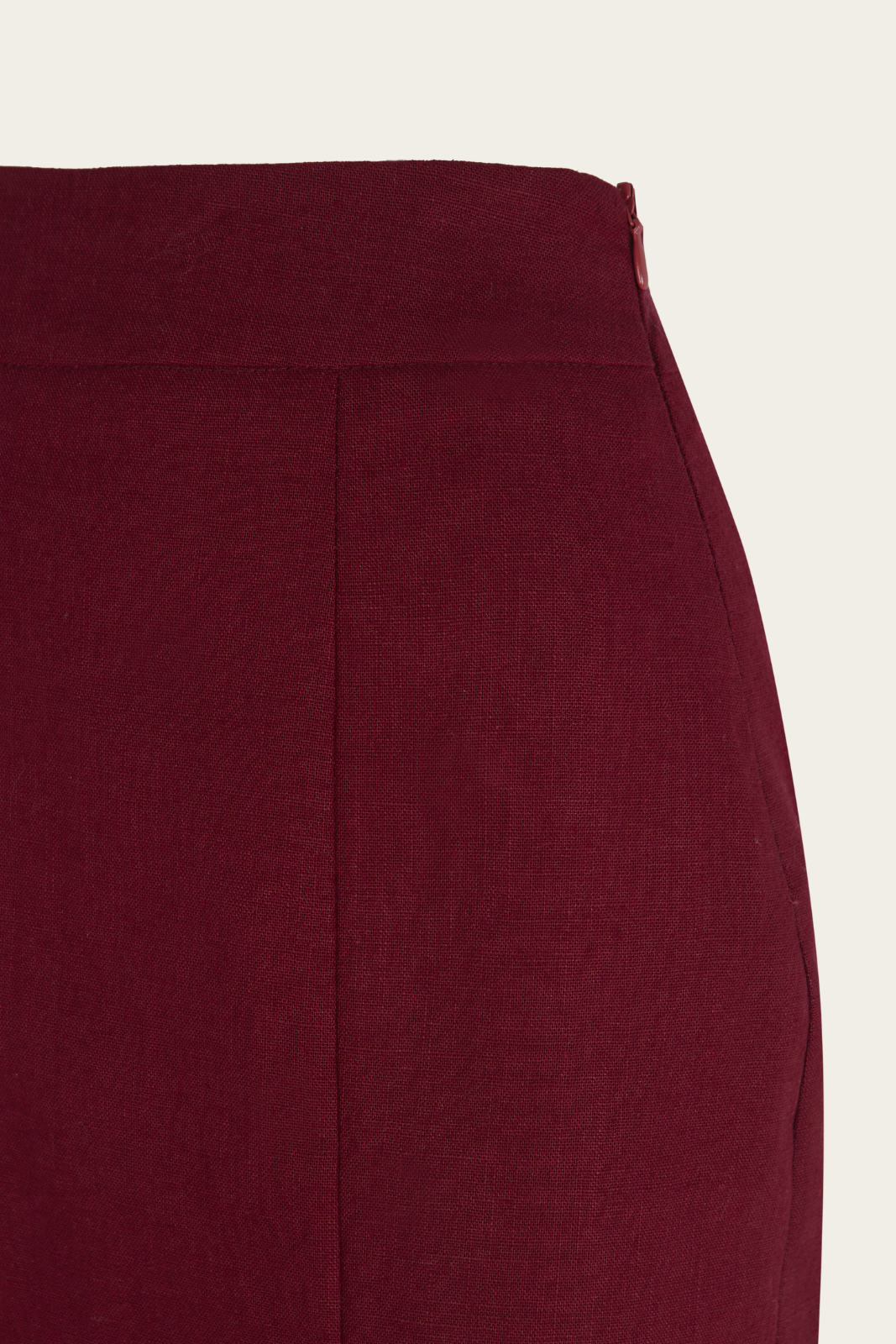 Perfecta para un look sofisticado y con personalidad. Su silueta estilizada y su elegante color vino hacen de esta falda un must-have para cualquier evento especial. Cremallera lateral.