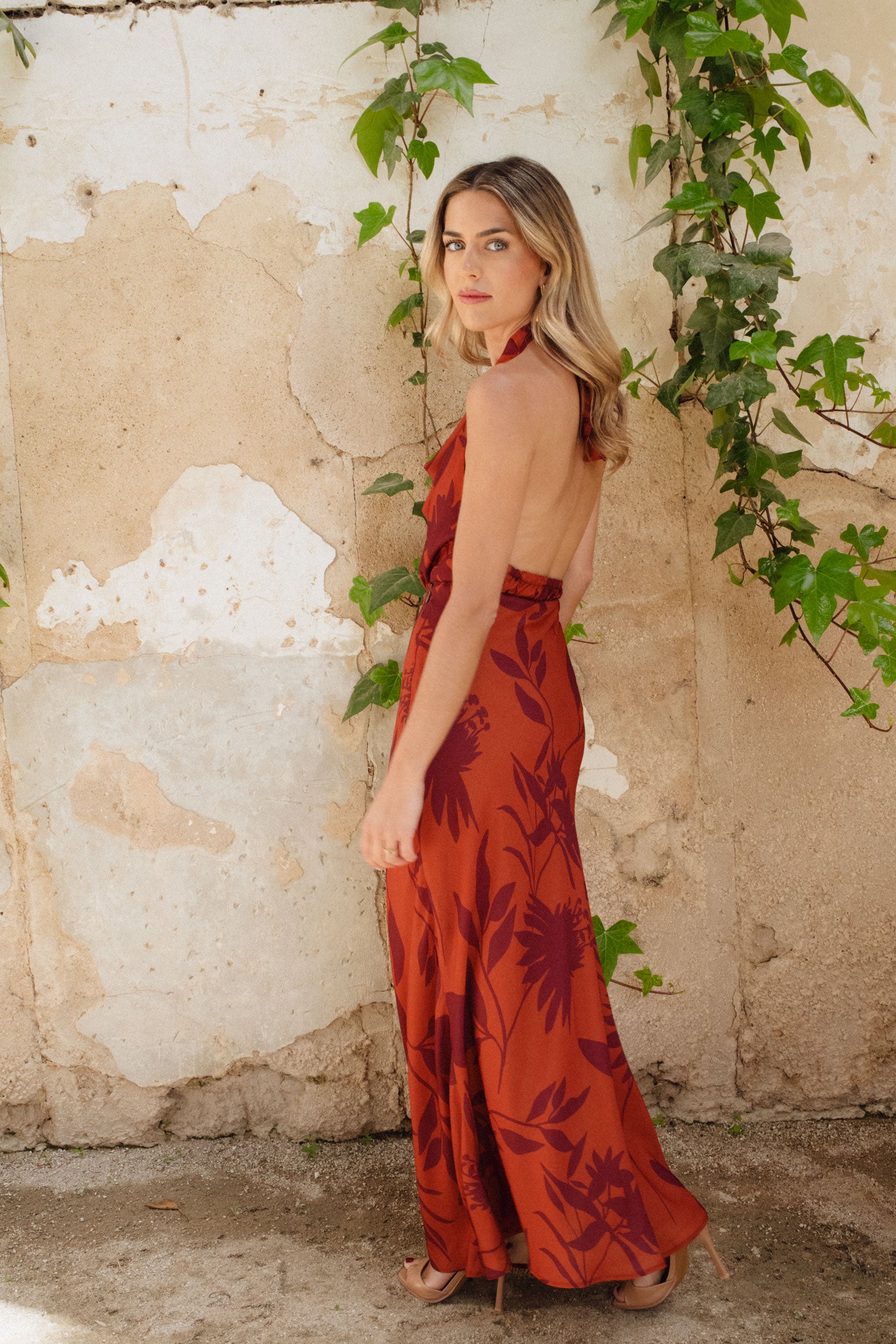 Este conjunto combina una falda fluida con un top halter. El top incorpora una goma trasera para un ajuste perfecto y dos botones a cada lado, que permiten llevarlo de distintas formas: con la espalda completamente descubierta y lazada en el cuello o con los tirantes cruzados.