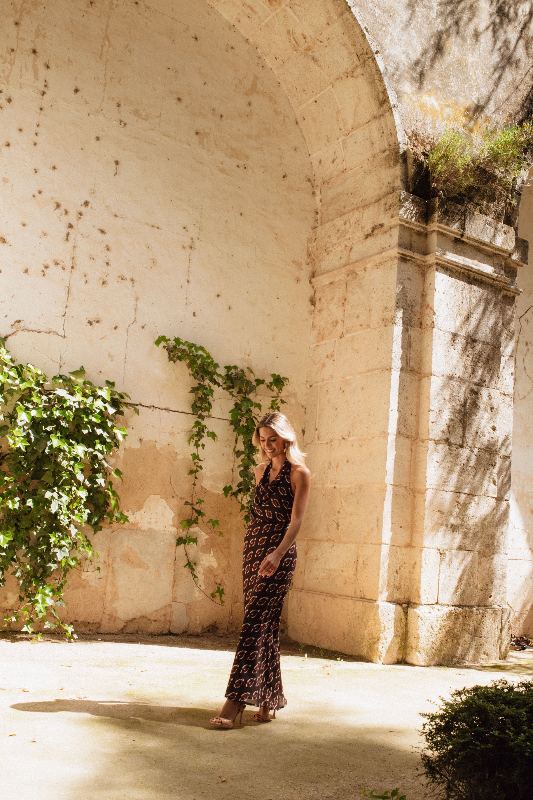 Este conjunto combina una falda fluida con un top halter. El top incorpora una goma trasera para un ajuste perfecto y dos botones a cada lado, que permiten llevarlo de distintas formas: con la espalda completamente descubierta y lazada en el cuello o con los tirantes cruzados.