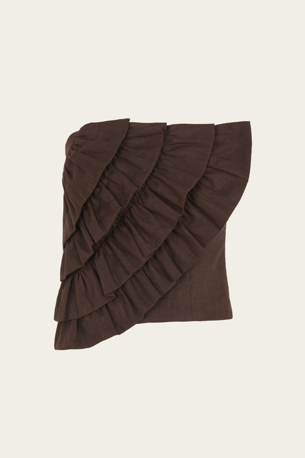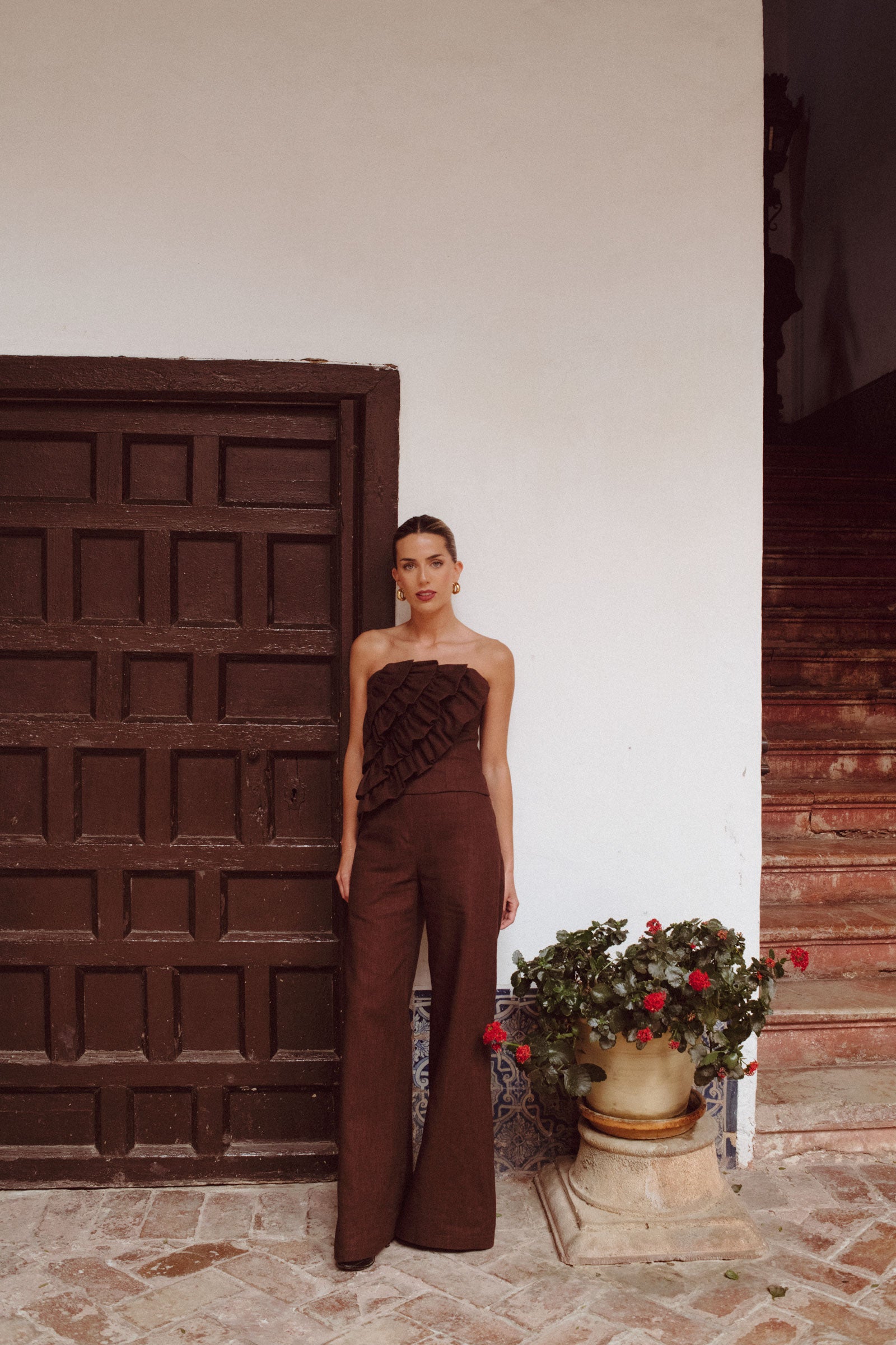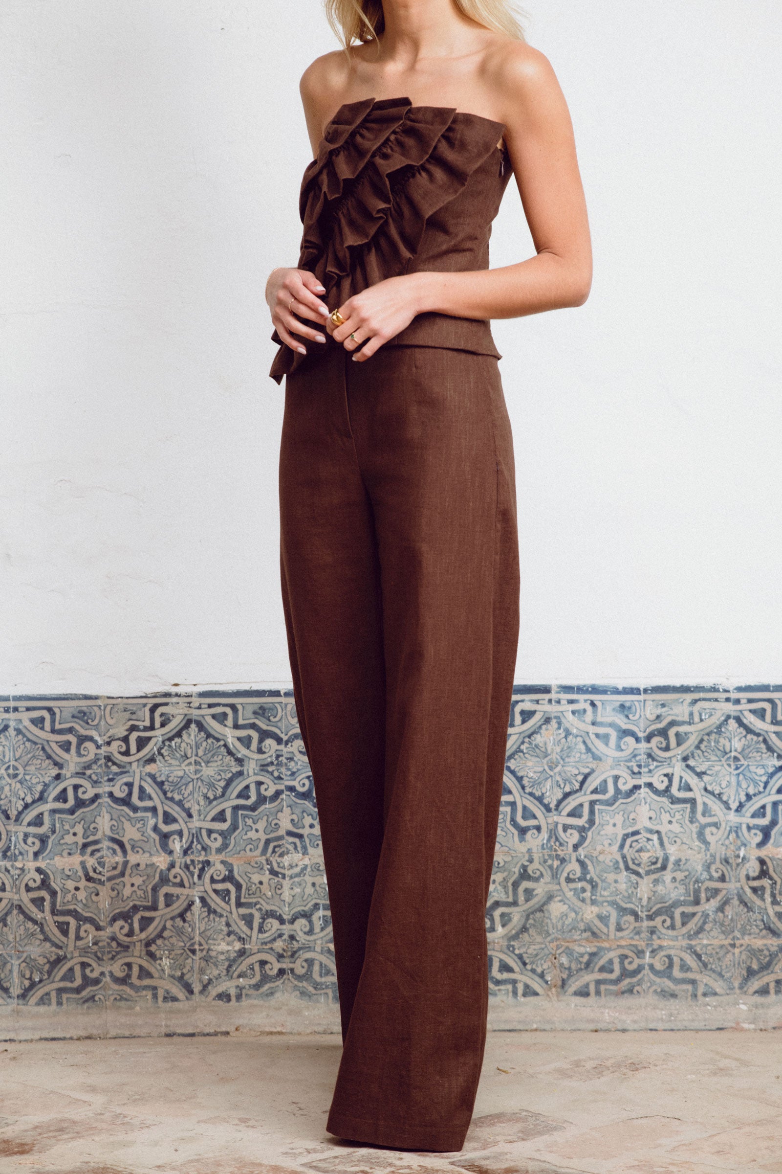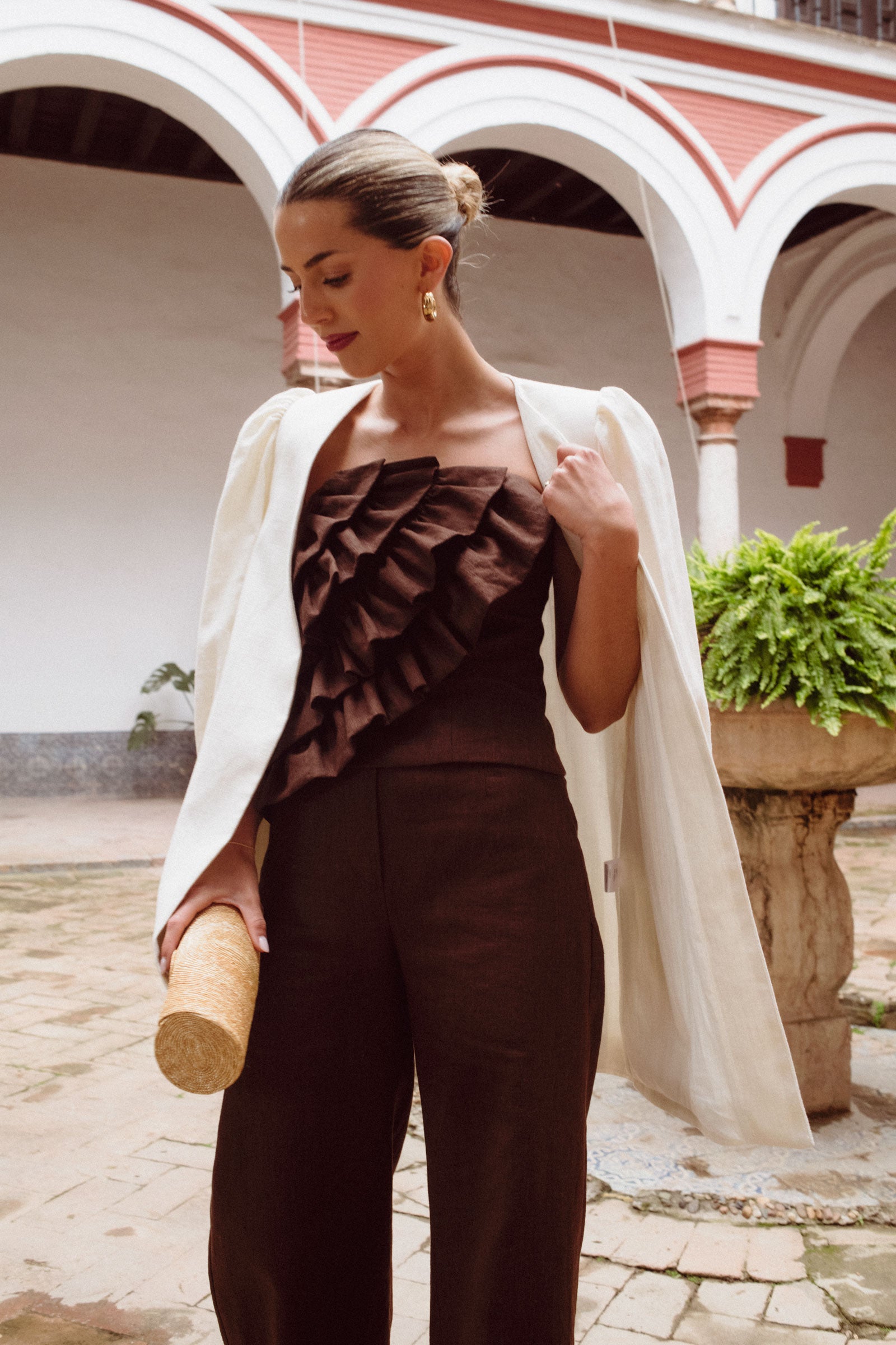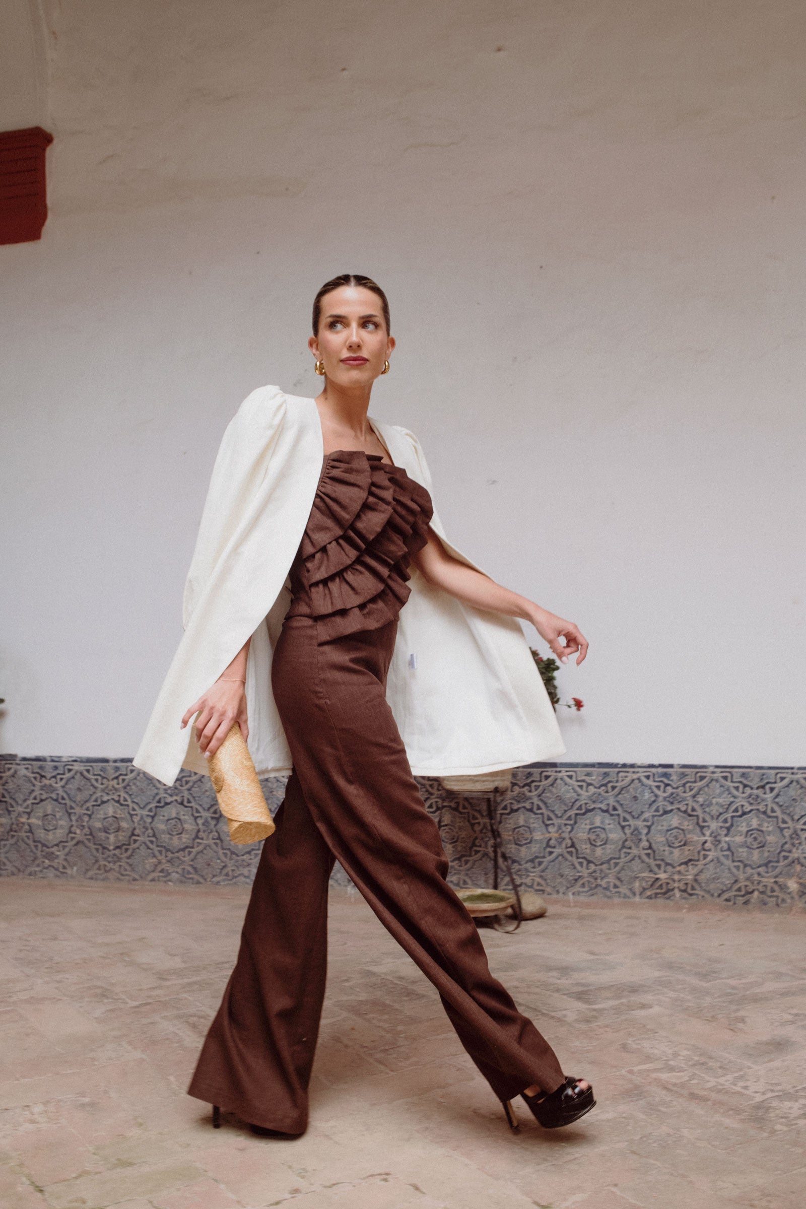 Natural, cálido y con mucho estilo. Este top marrón se convertirá en tu favorito gracias a su corte impecable, sus volantes frontales y ese toque artesanal que lo hace único. Nido de abeja en la espalda y cremallera lateral para mayor comodidad.