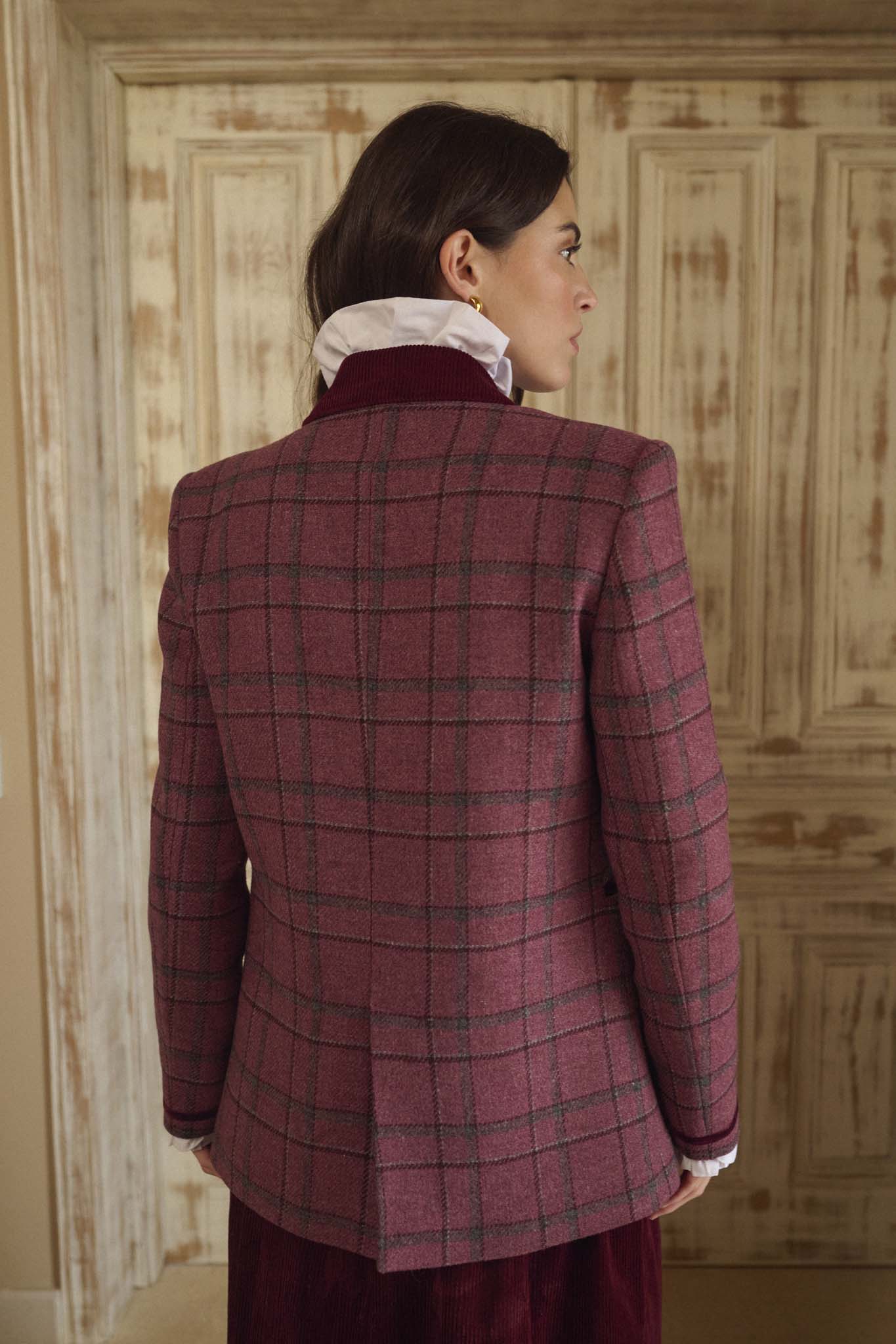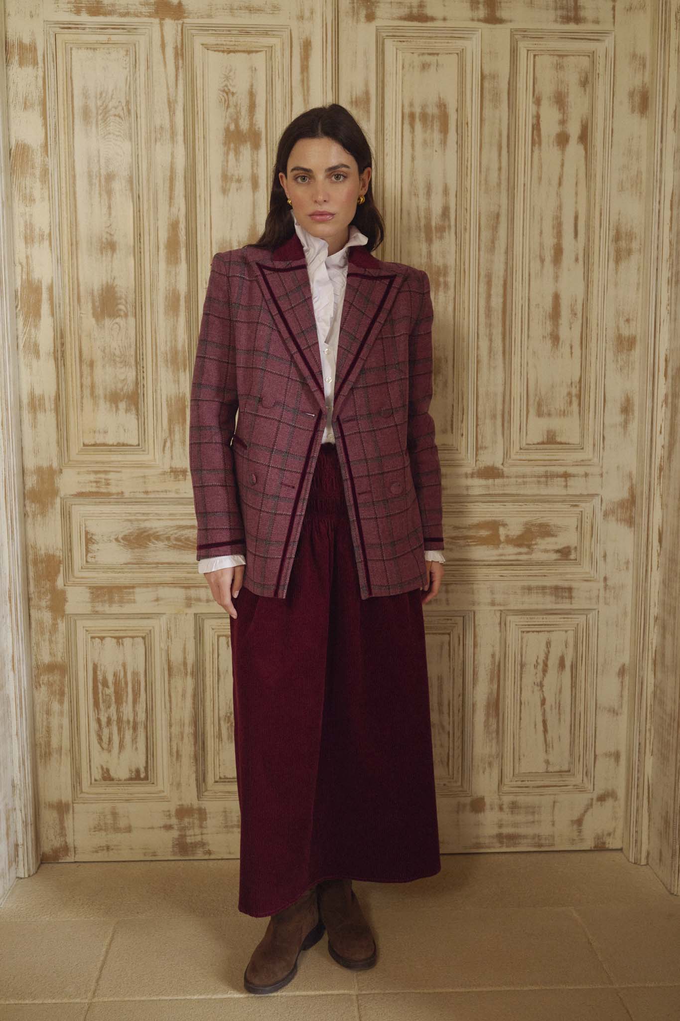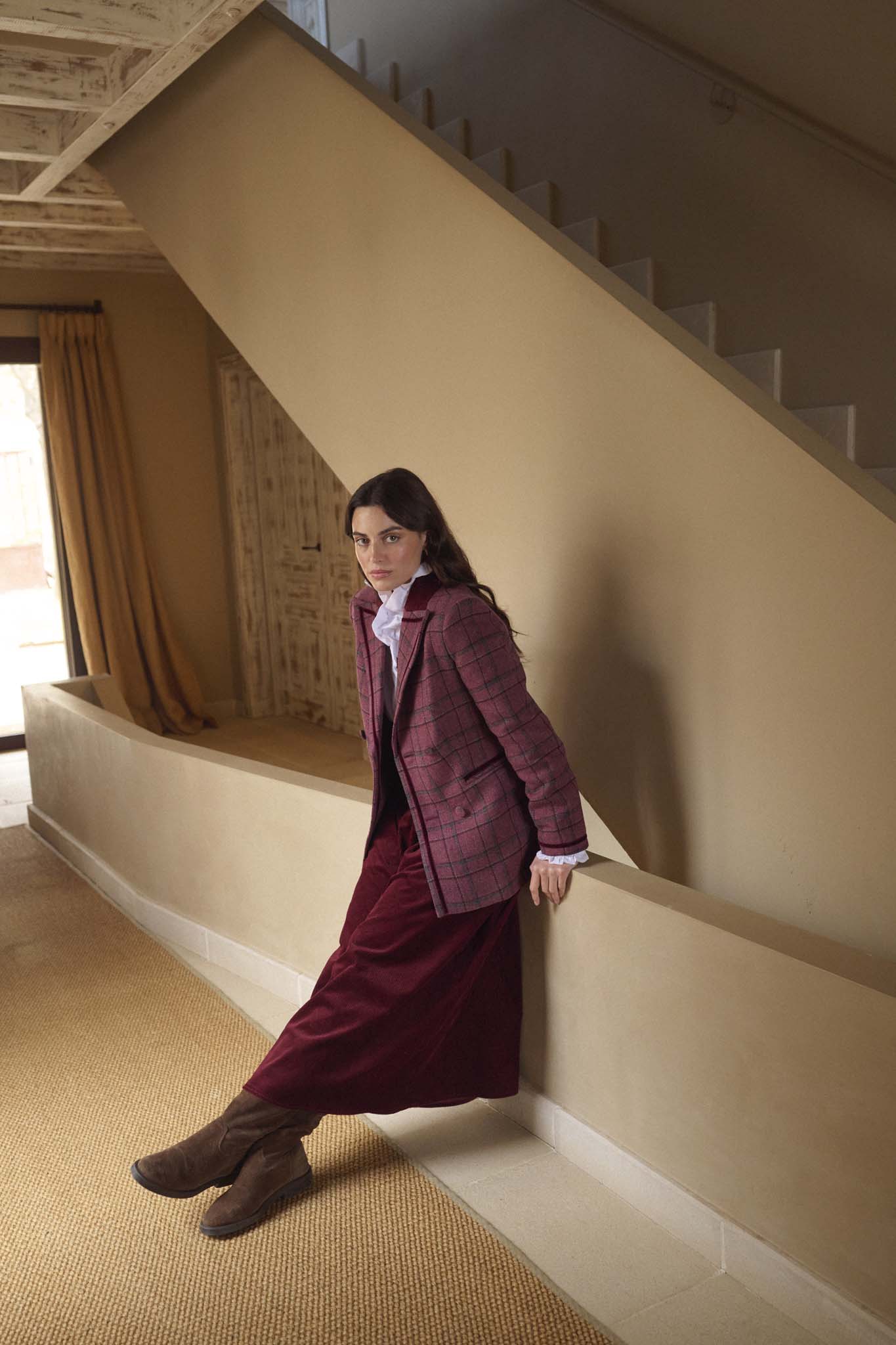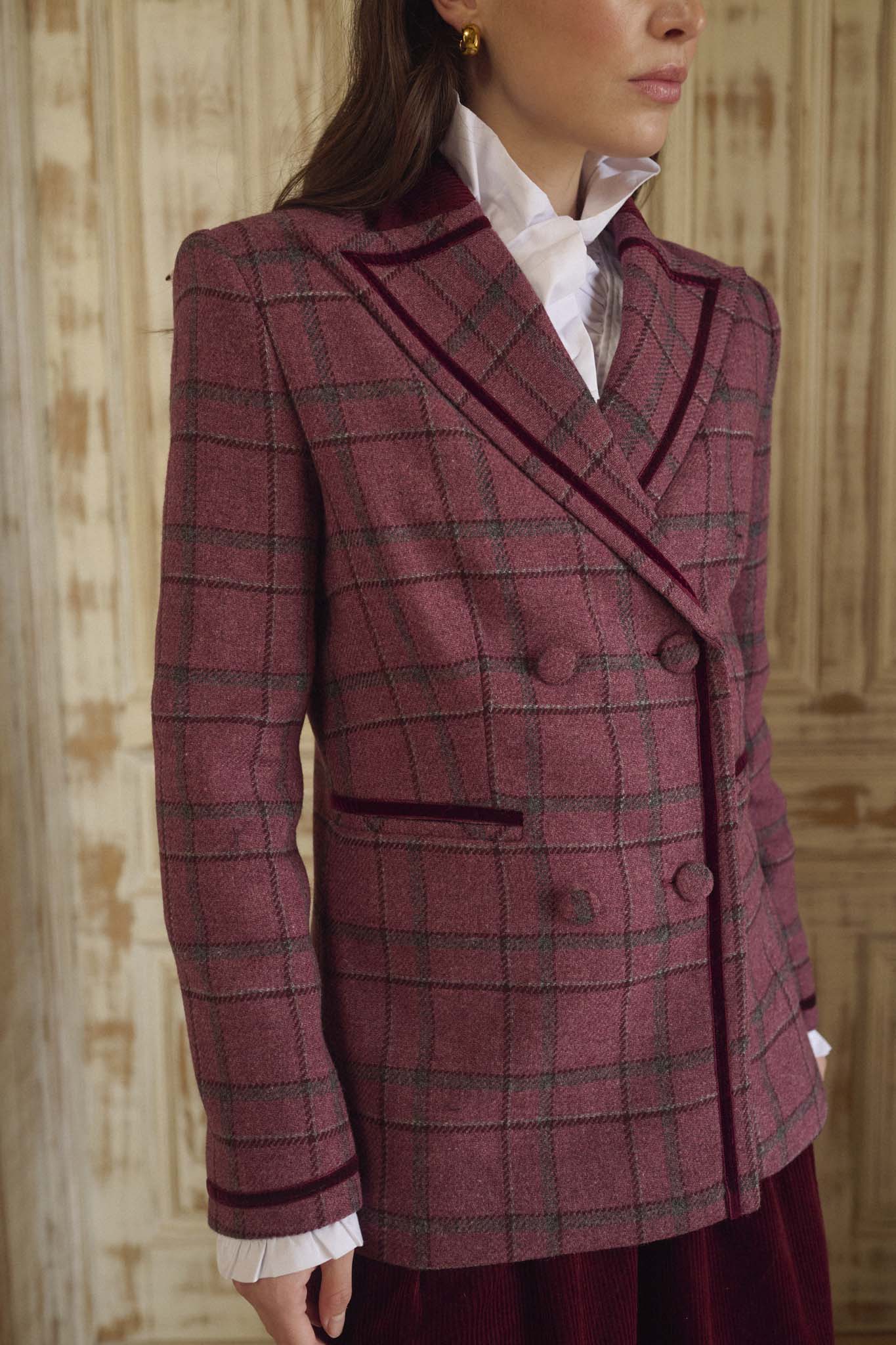 Nuestra icónica americana en tejido 100% lana, tejida en Salamanca, con la calidad de la manufactura española. De corte recto con solapa de muesca, hombreras y cierre cruzado de cuatro botones. Con solapas puntiagudas embellecidas con vivos de terciopelo. Detalle en el cuello en pana burdeos a contraste.