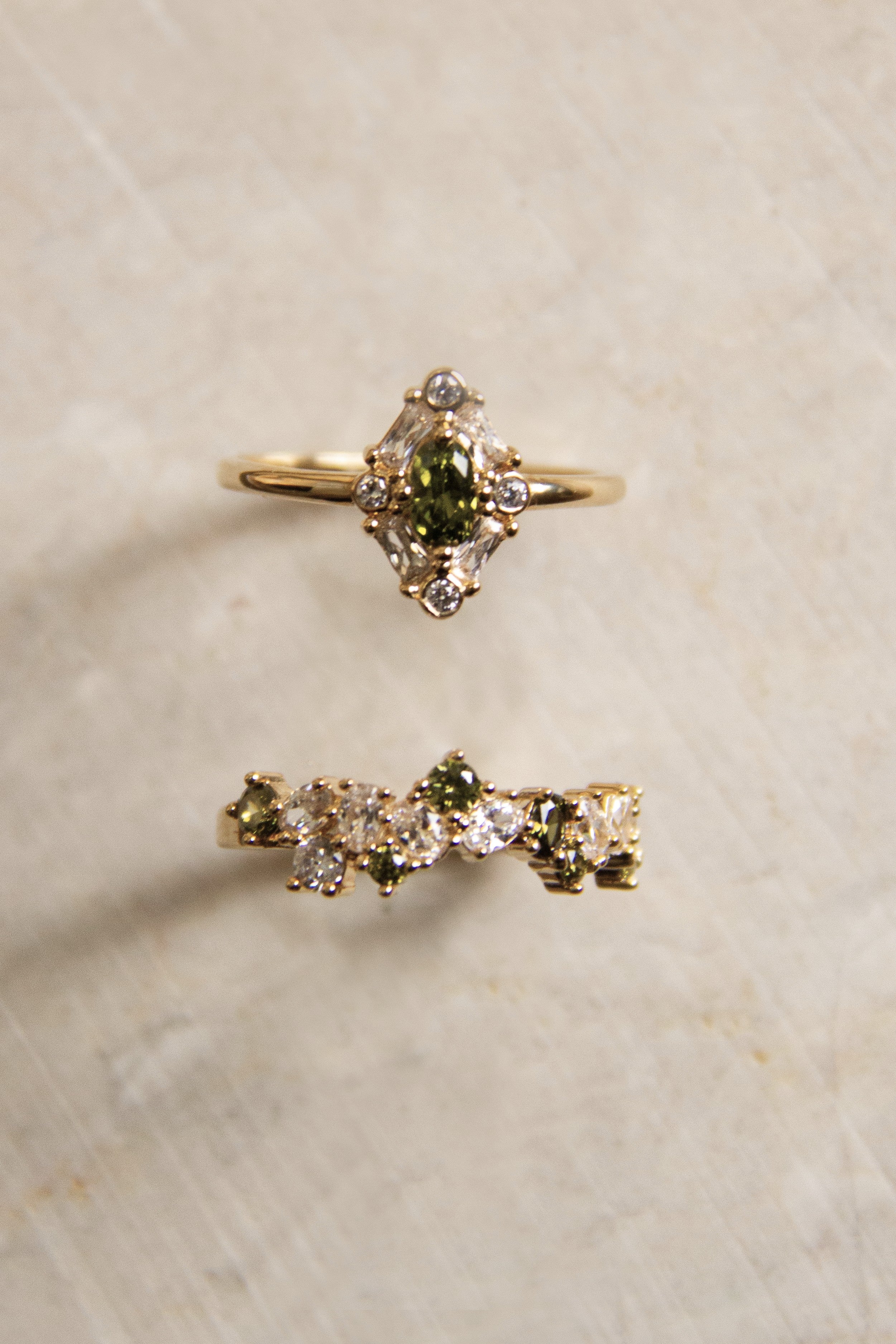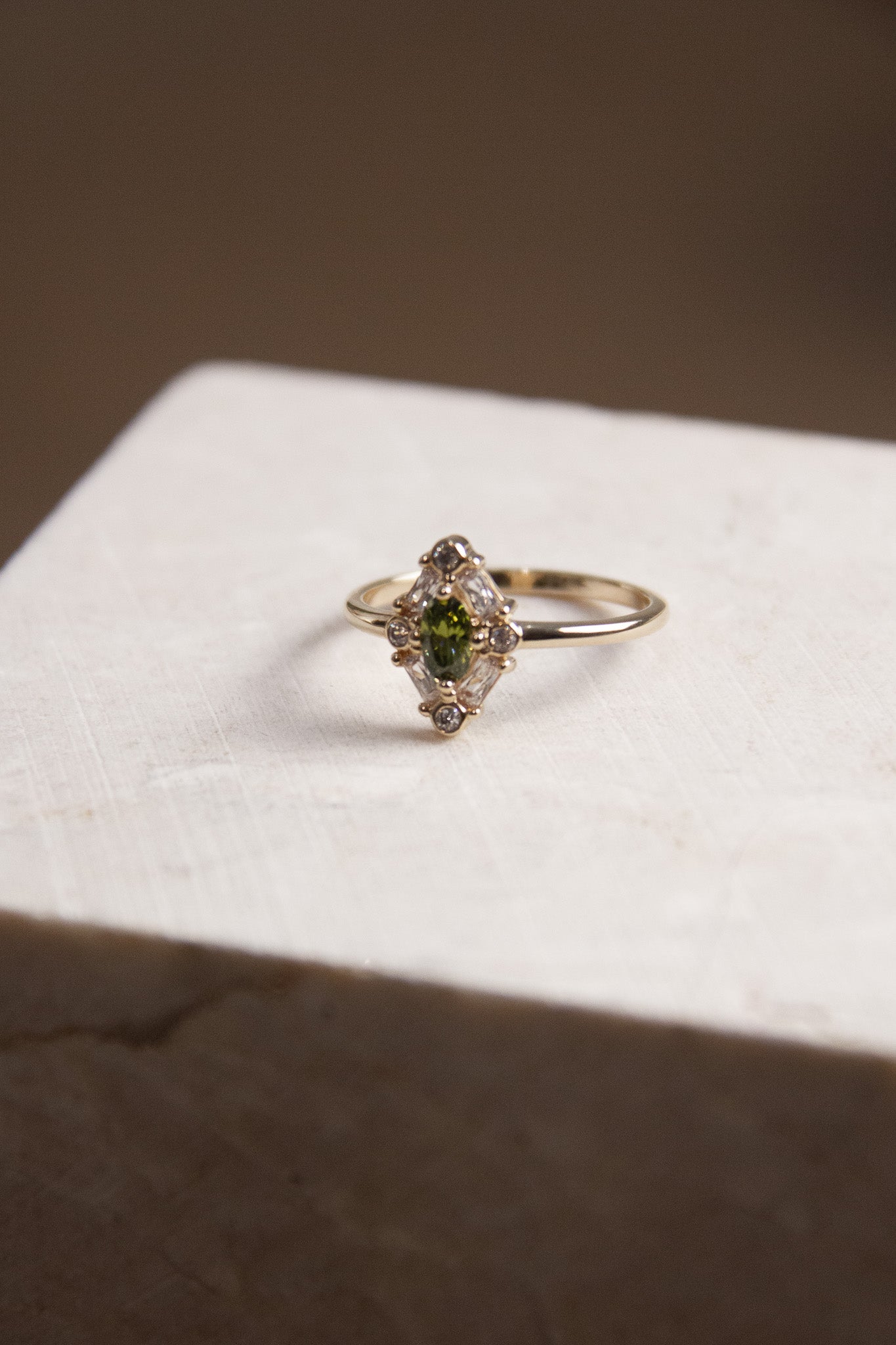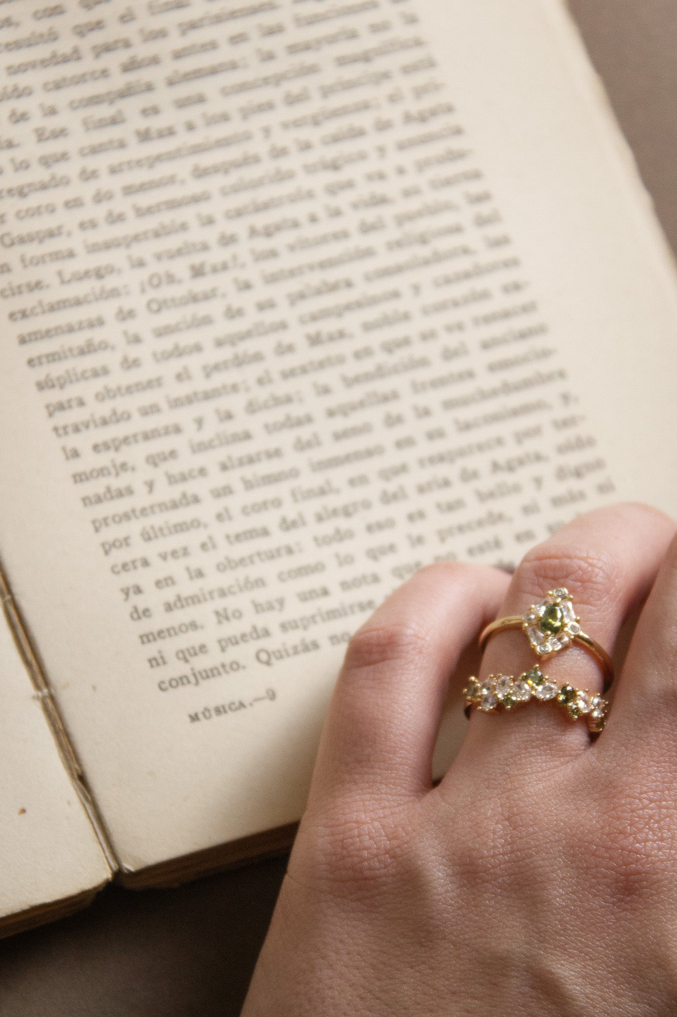 Anillo chapado en oro de 18K con tres micras, adornado con circonita central y piedra verde. Su diseño sobrio y luminoso lo convierte en una pieza versátil, ideal para elevar cualquier look con sutileza. Combínalo con nuestro anillo Annelise.