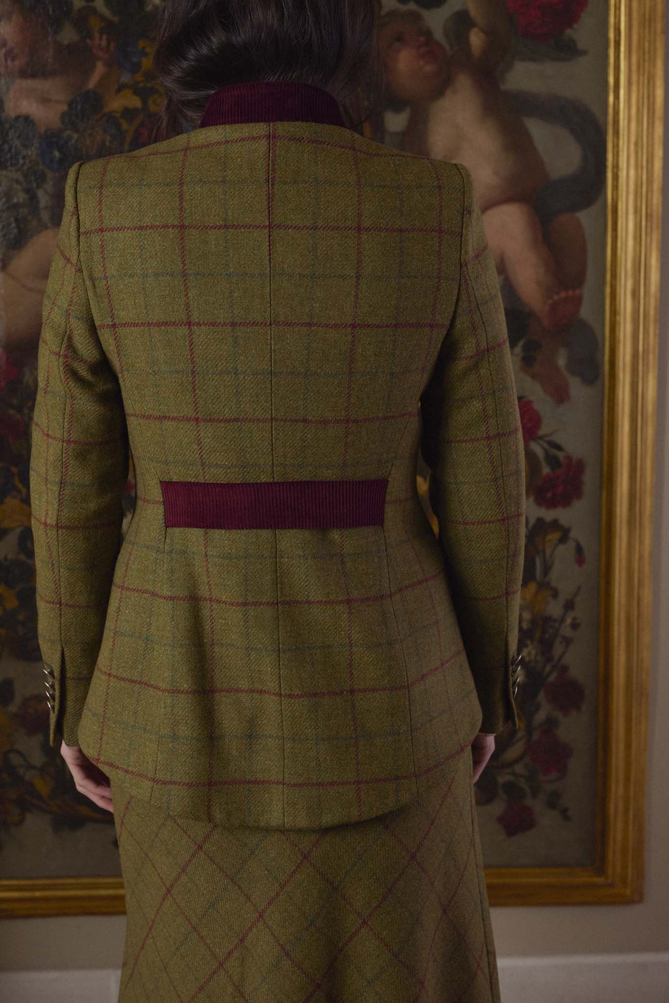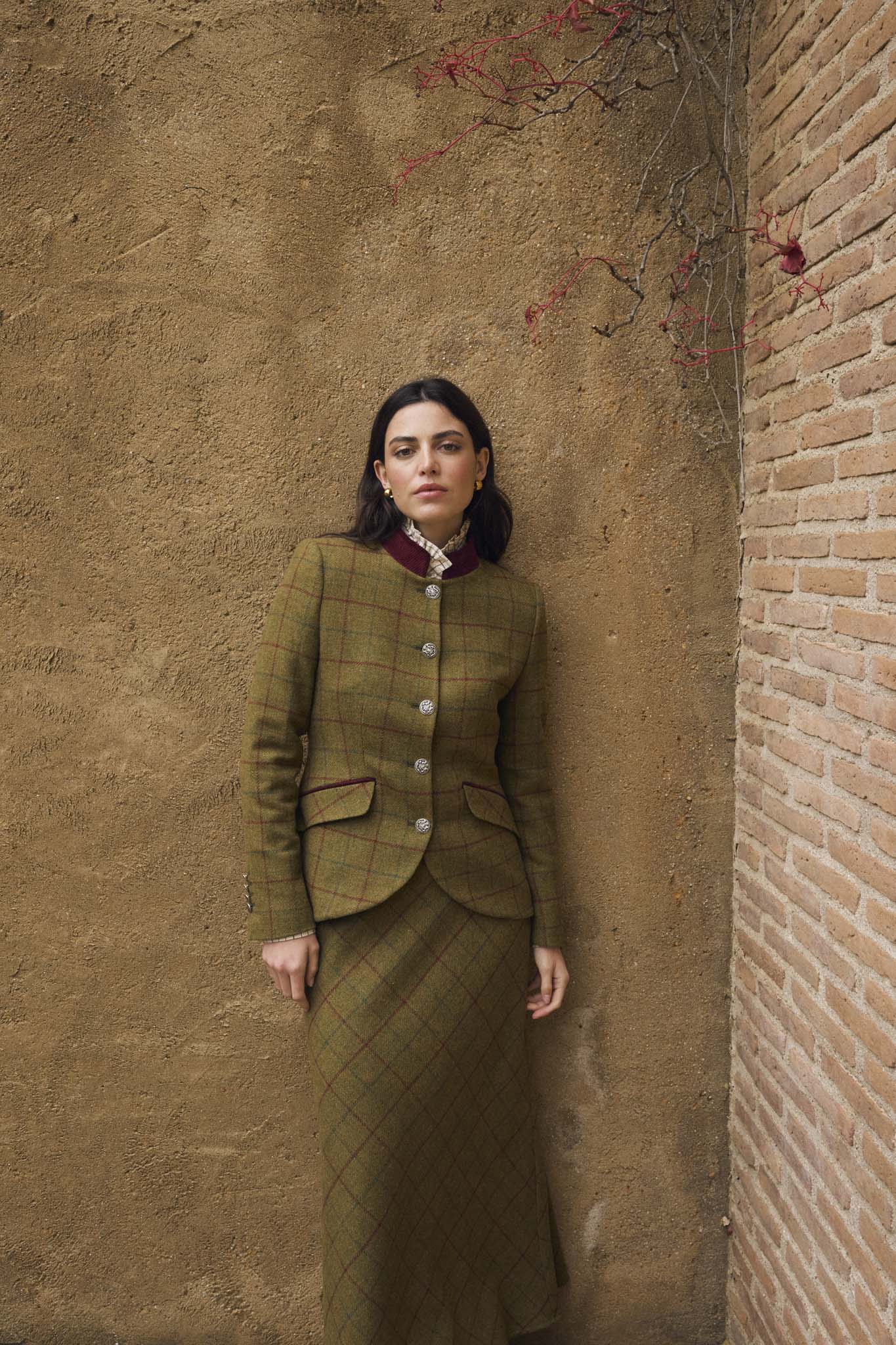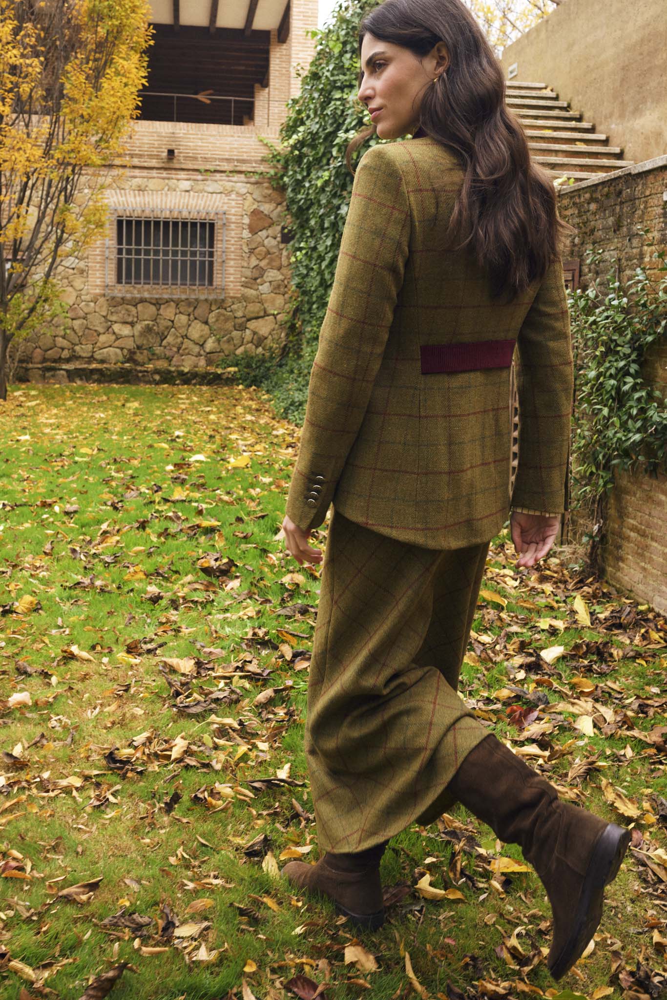 Chaqueta de 100% lana, tejida en Salamanca. De confección artesanal en España. Diseño entallado con cuello mao a contraste en pana. Bolsillo laterales en diagonal siguiendo la línea redondeada del bajo. Botones austriacos y cinta de pana burdeos en la espalda.