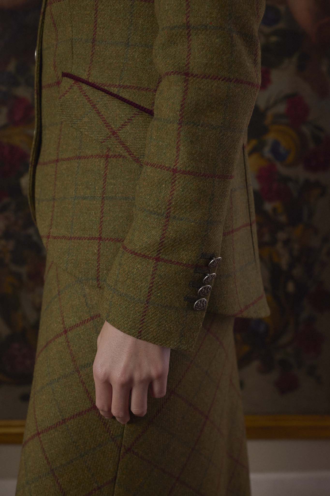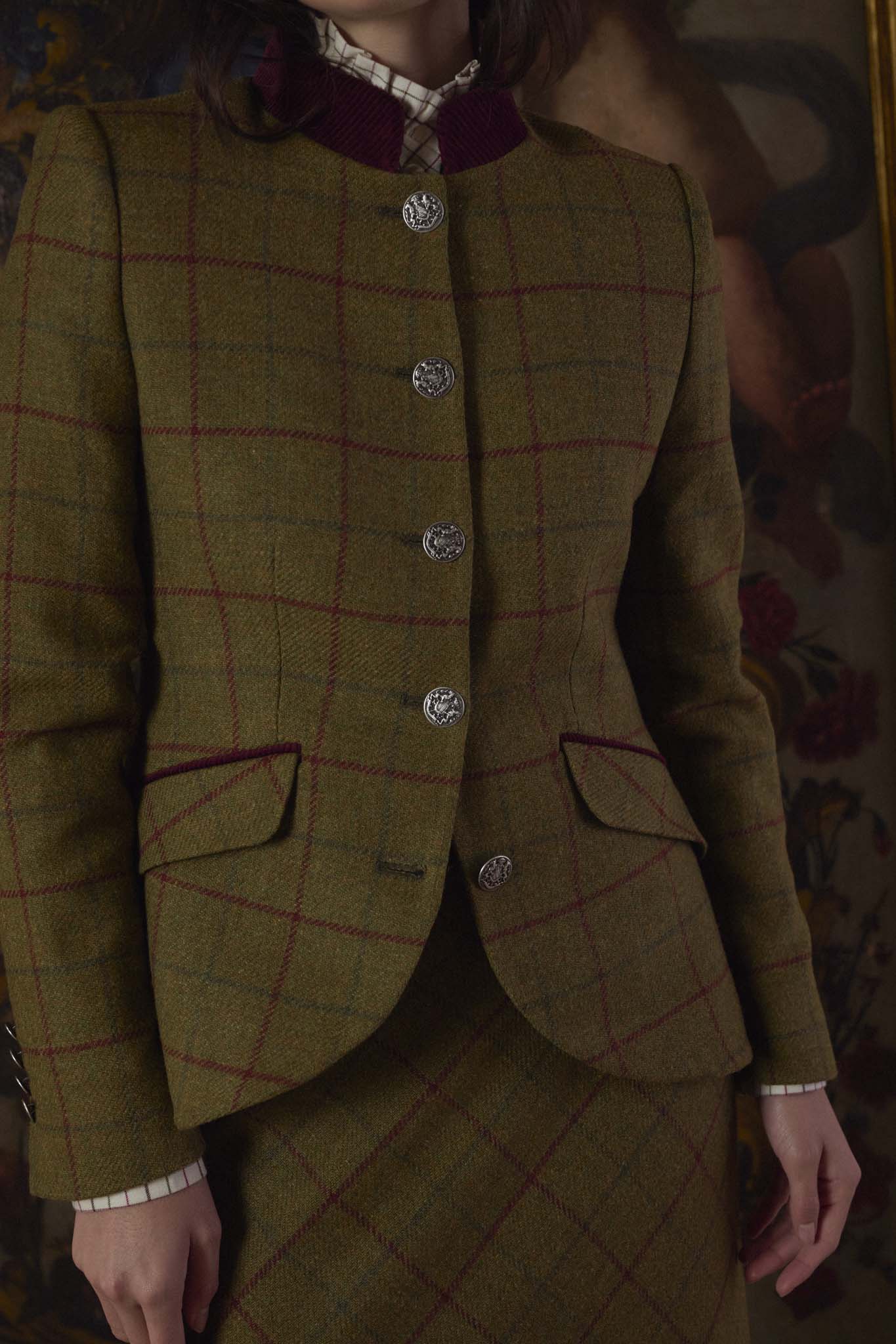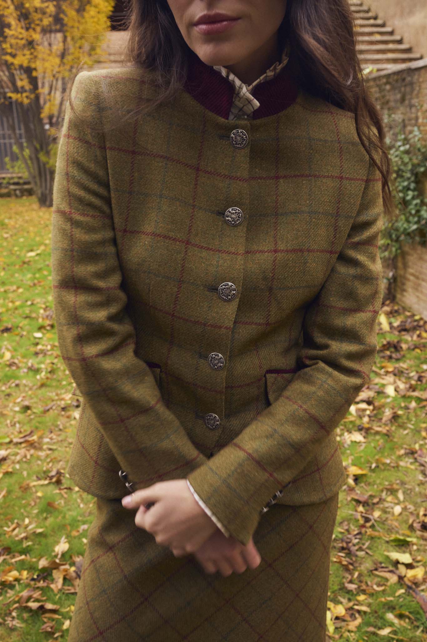 Chaqueta de 100% lana, tejida en Salamanca. De confección artesanal en España. Diseño entallado con cuello mao a contraste en pana. Bolsillo laterales en diagonal siguiendo la línea redondeada del bajo. Botones austriacos y cinta de pana burdeos en la espalda.