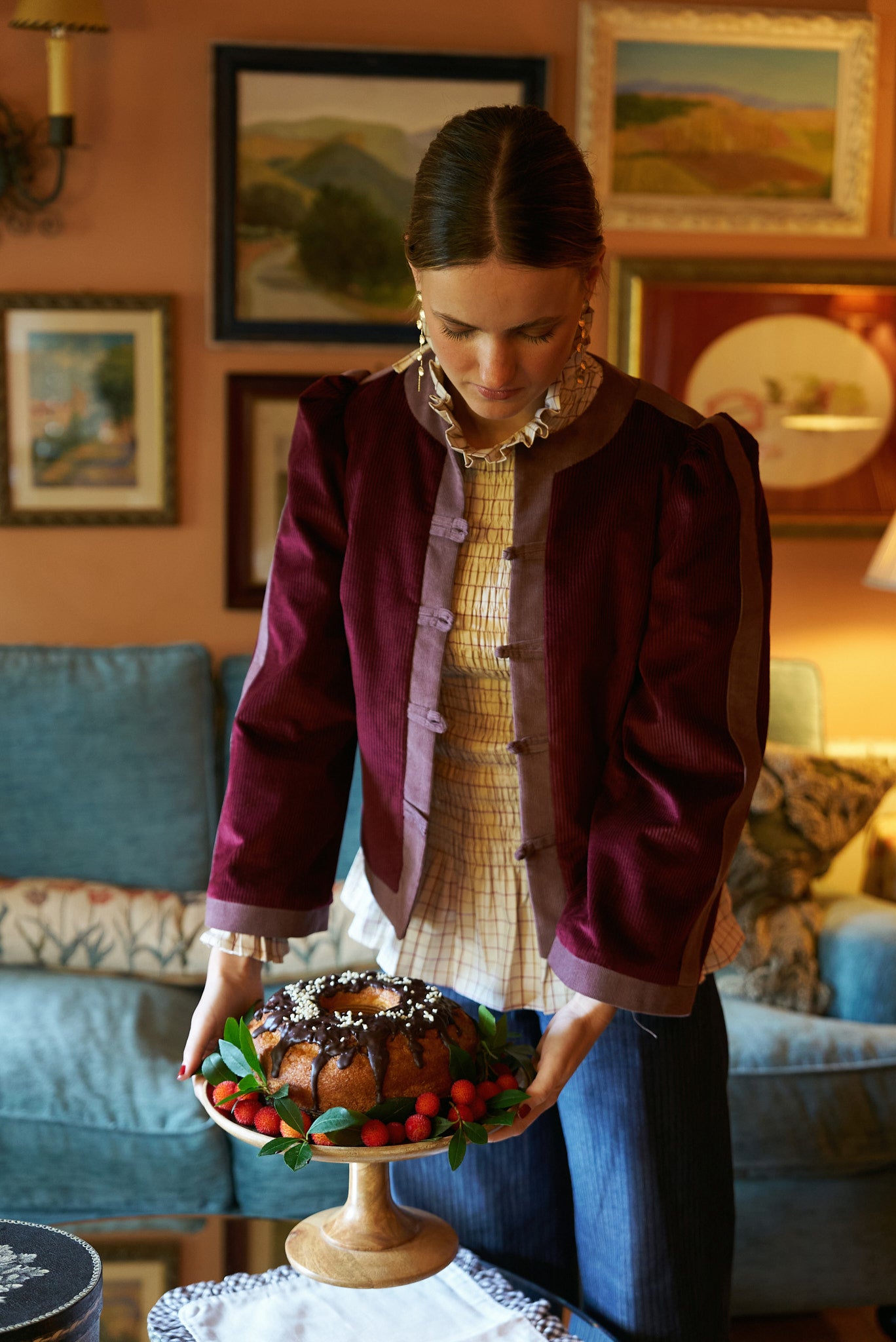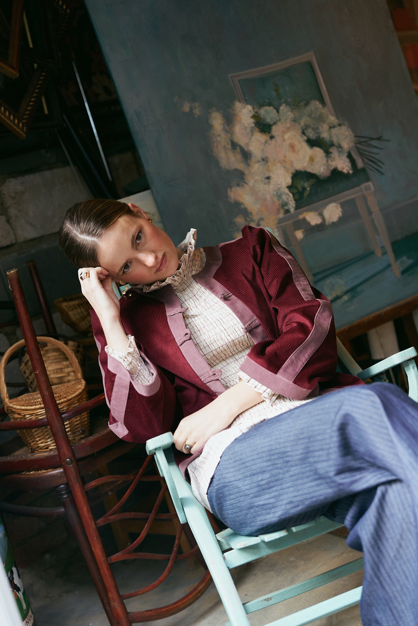 Chaqueta de pana con diseño a contraste, adornada con ribetes laterales y delanteros que realzan su silueta estructurada. Presenta un cierre frontal con botones decorativos y un cuello redondo sin solapas, que aporta un aire elegante y contemporáneo. De corte recto y manga larga.