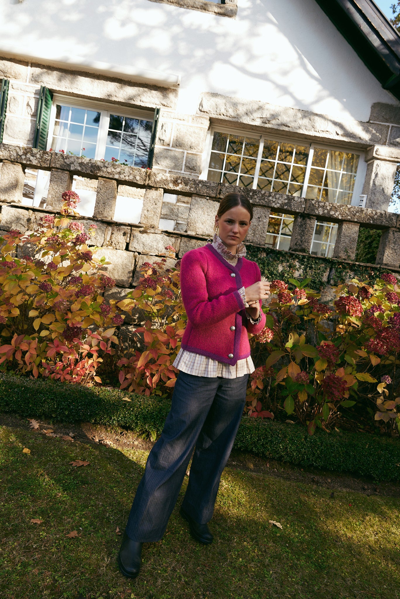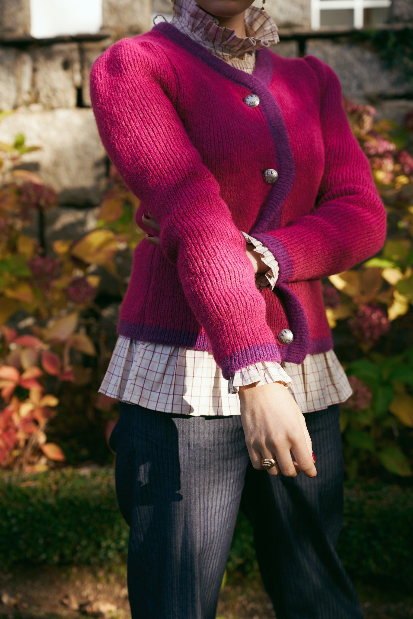 Chaqueta de punto de inspiración austríaca, con silueta estructurada y ligeramente entallada que realza la figura. Presenta hombros marcados y mangas largas, rematada con ribetes en contraste en cuello, puños y bajo. El escote en pico y el cierre frontal con botones decorativos aportan un toque clásico y elegante, ideal para un look atemporal y sofisticado.