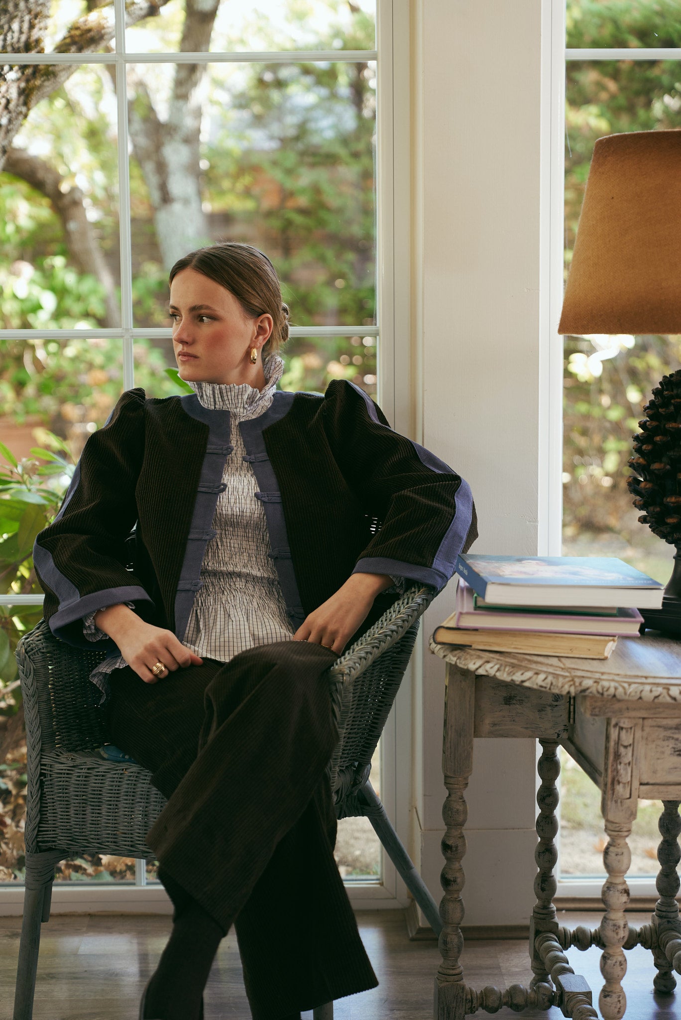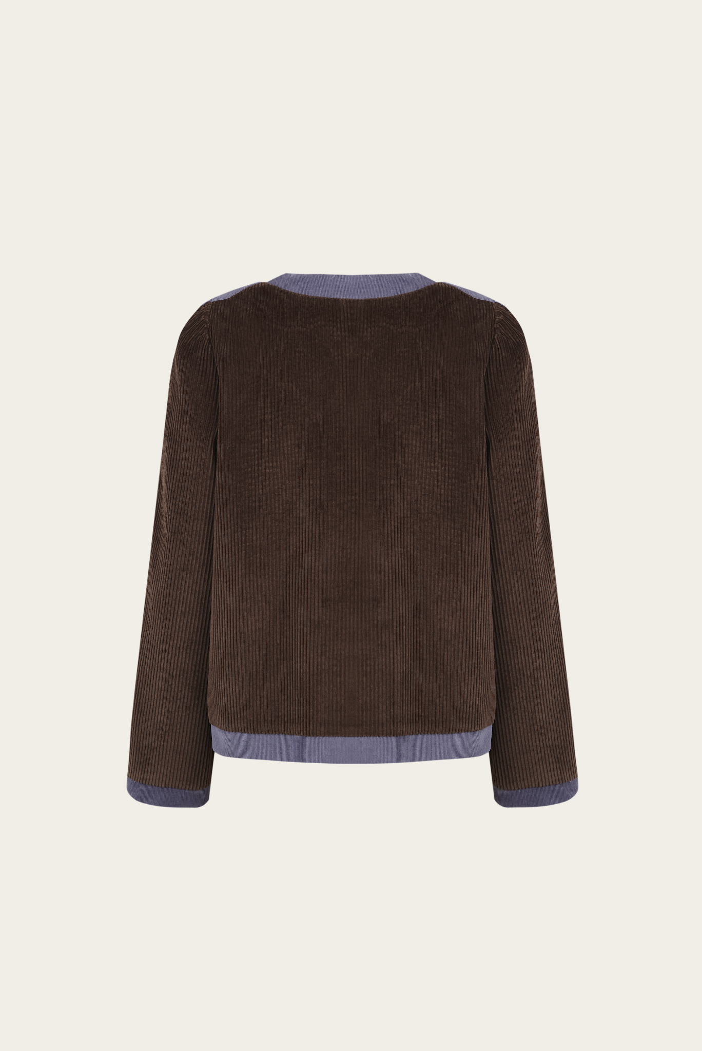 Chaqueta de pana con diseño a contraste, adornada con ribetes laterales y delanteros que realzan su silueta estructurada. Presenta un cierre frontal con botones decorativos y un cuello redondo sin solapas, que aporta un aire elegante y contemporáneo. De corte recto y manga larga.