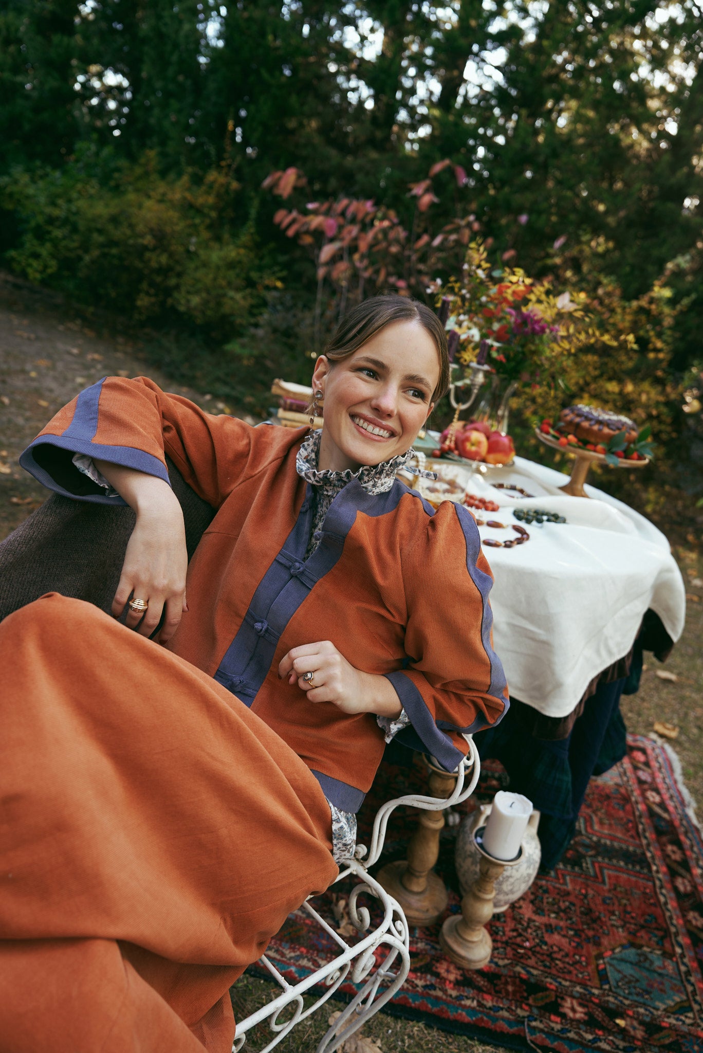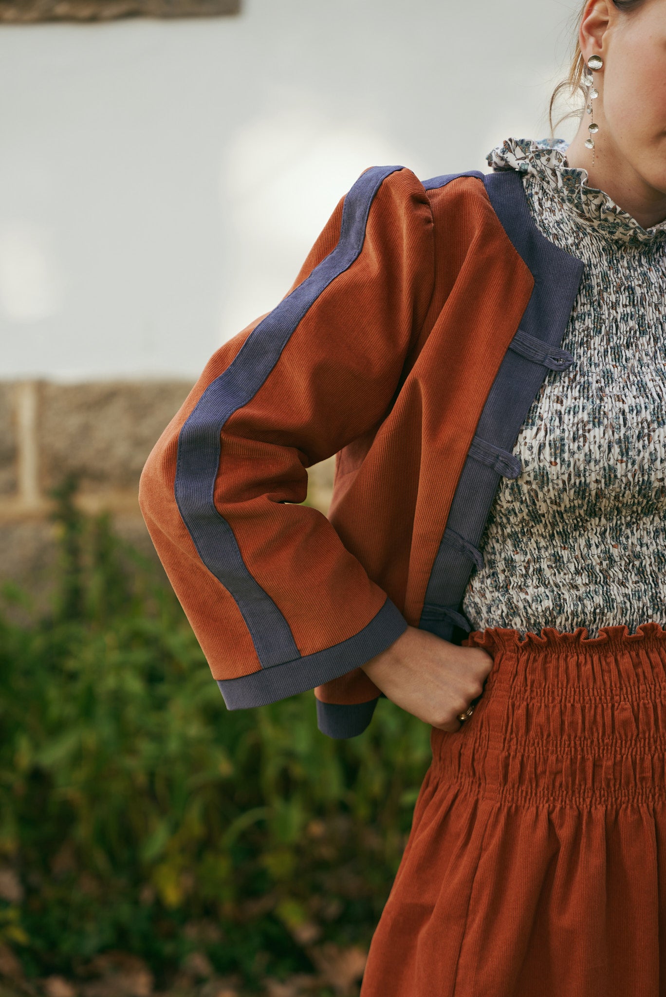 Chaqueta de pana con diseño a contraste, adornada con ribetes laterales y delanteros que realzan su silueta estructurada. Presenta un cierre frontal con botones decorativos y un cuello redondo sin solapas, que aporta un aire elegante y contemporáneo. De corte recto y manga larga.