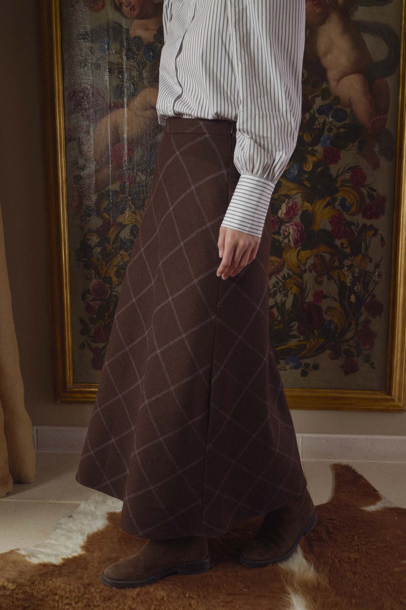 Falda de corte clásico que combina la suavidad y la calidad de la lana 100%, tejida en Salamanca, con un diseño que fluye naturalmente. Confeccionada en nuestros talleres de Madrid, el corte al bies ofrece un diseño único, especialmente favorecedor y de caida impecable. Se adapta al cuerpo con elegancia y comodidad. Su cinturilla y cremallera lateral aseguran un ajuste impecable, ideal para quienes buscan una pieza que brille tanto en eventos especiales como en momentos cotidianos cargados de estilo. Al tratarse de productos fabricados a mano pueden presentar pequeñas diferencias respecto a las fotografías.