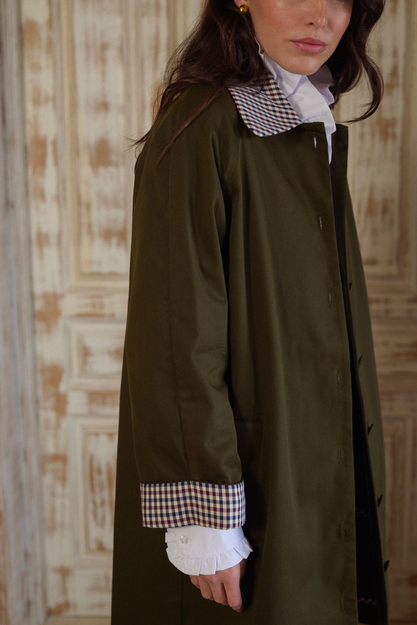 Gabardina de corte amplio con manga ranglán, confeccionada en tejido resistente. Presenta cuello y puños en contraste con estampado de cuadros de algodón, que aportan un toque distintivo y elegante. Incluye botones forrados en el mismo tono del tejido principal y bolsillos laterales inclinados, combinando funcionalidad y estilo clásico.