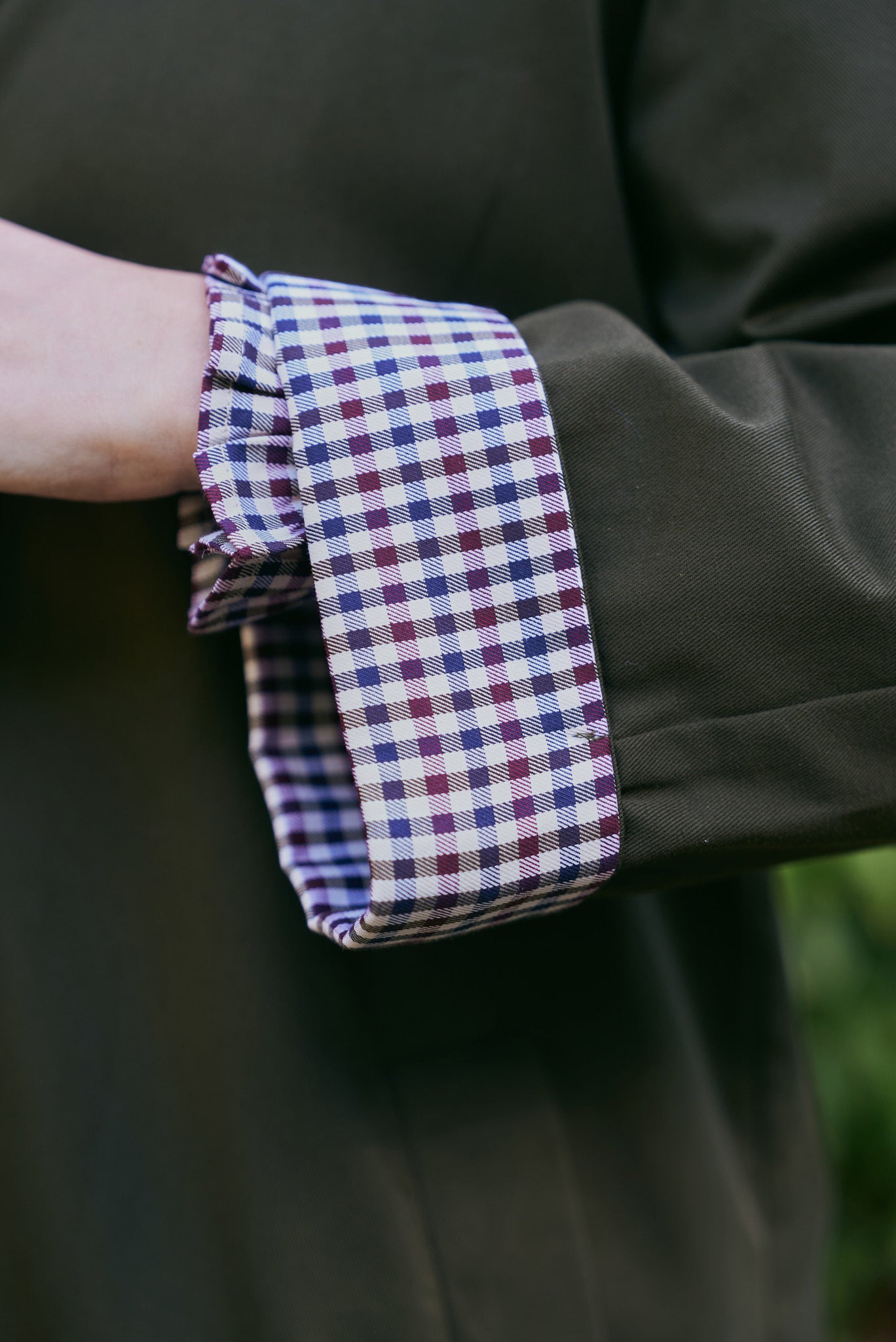 Gabardina de corte amplio con manga ranglán, confeccionada en tejido resistente y fluido. Presenta cuello y puños en contraste con estampado de cuadros de algodón, que aportan un toque distintivo y elegante. Incluye botones forrados en el mismo tono del tejido principal y bolsillos laterales inclinados, combinando funcionalidad y estilo clásico.