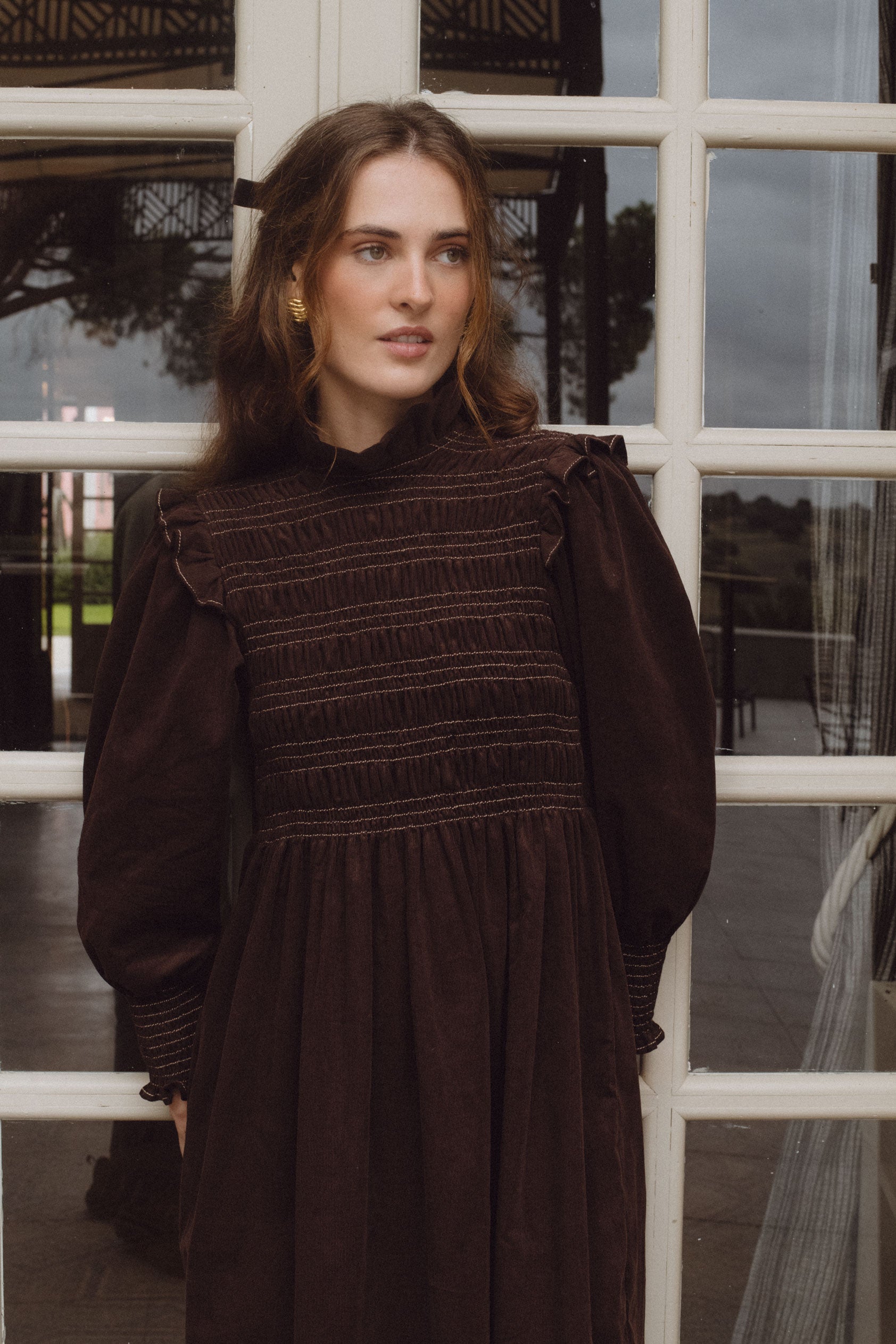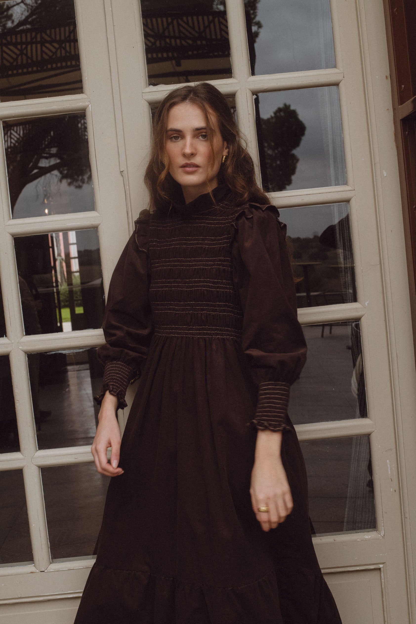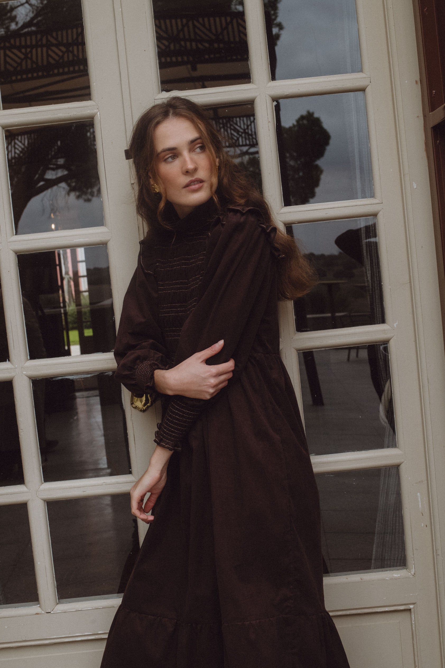 Nuestro vestido Meryl nos transporta a los origenes de nuestra inspiración con esos toques campestres que encontramos en esos tonos marrones tan elegantes.
