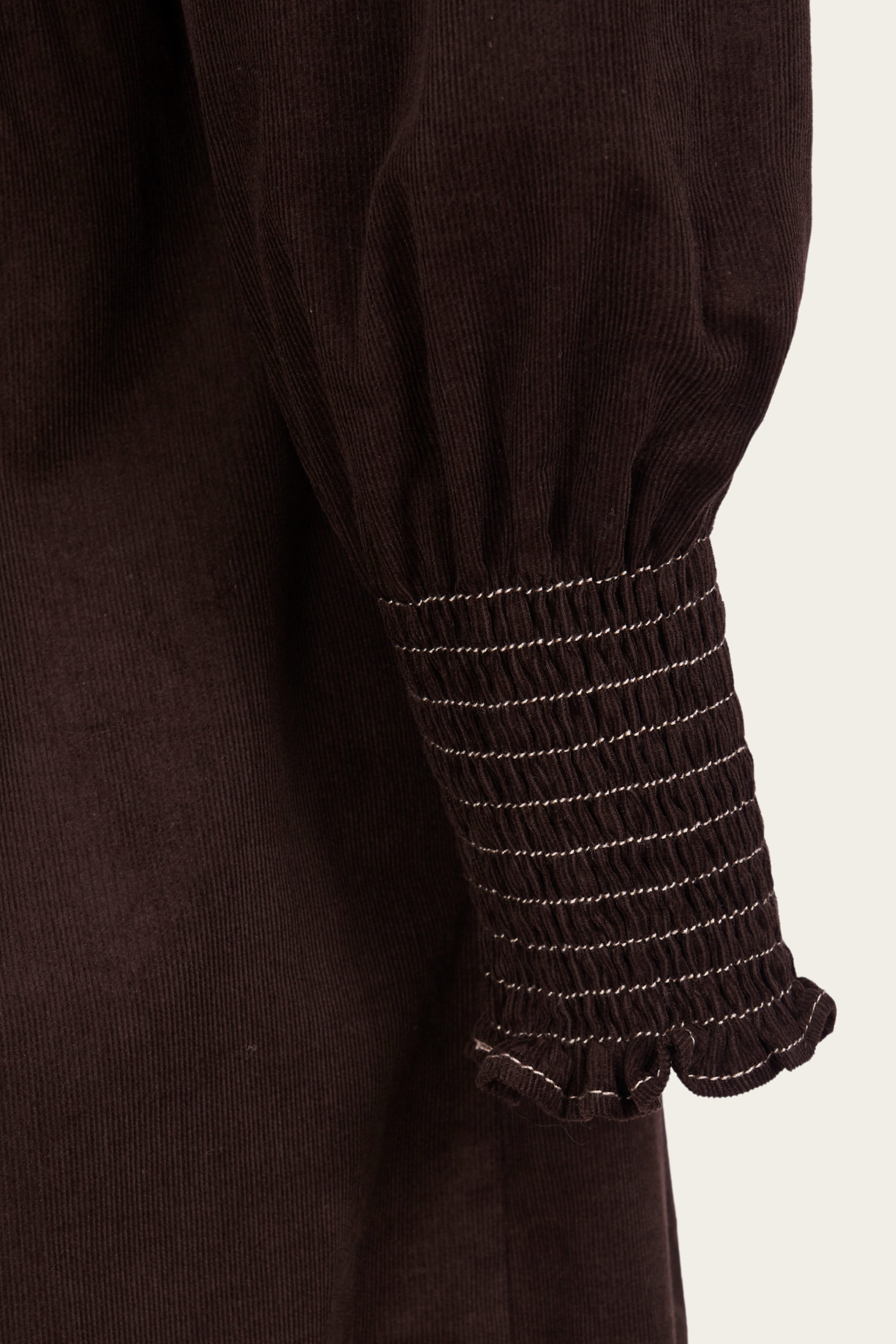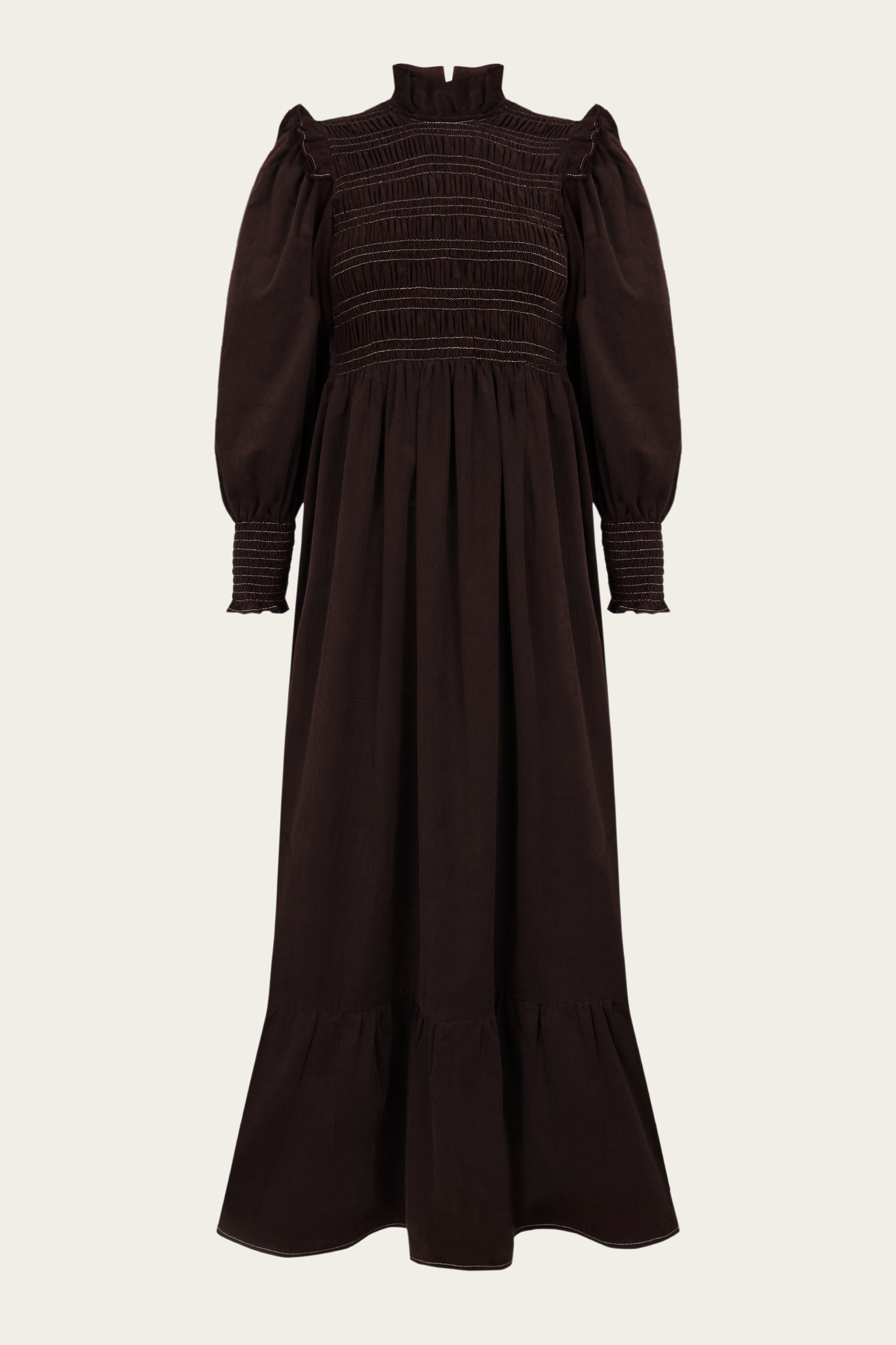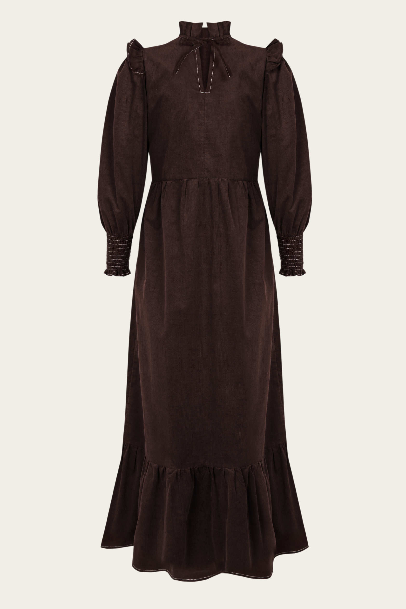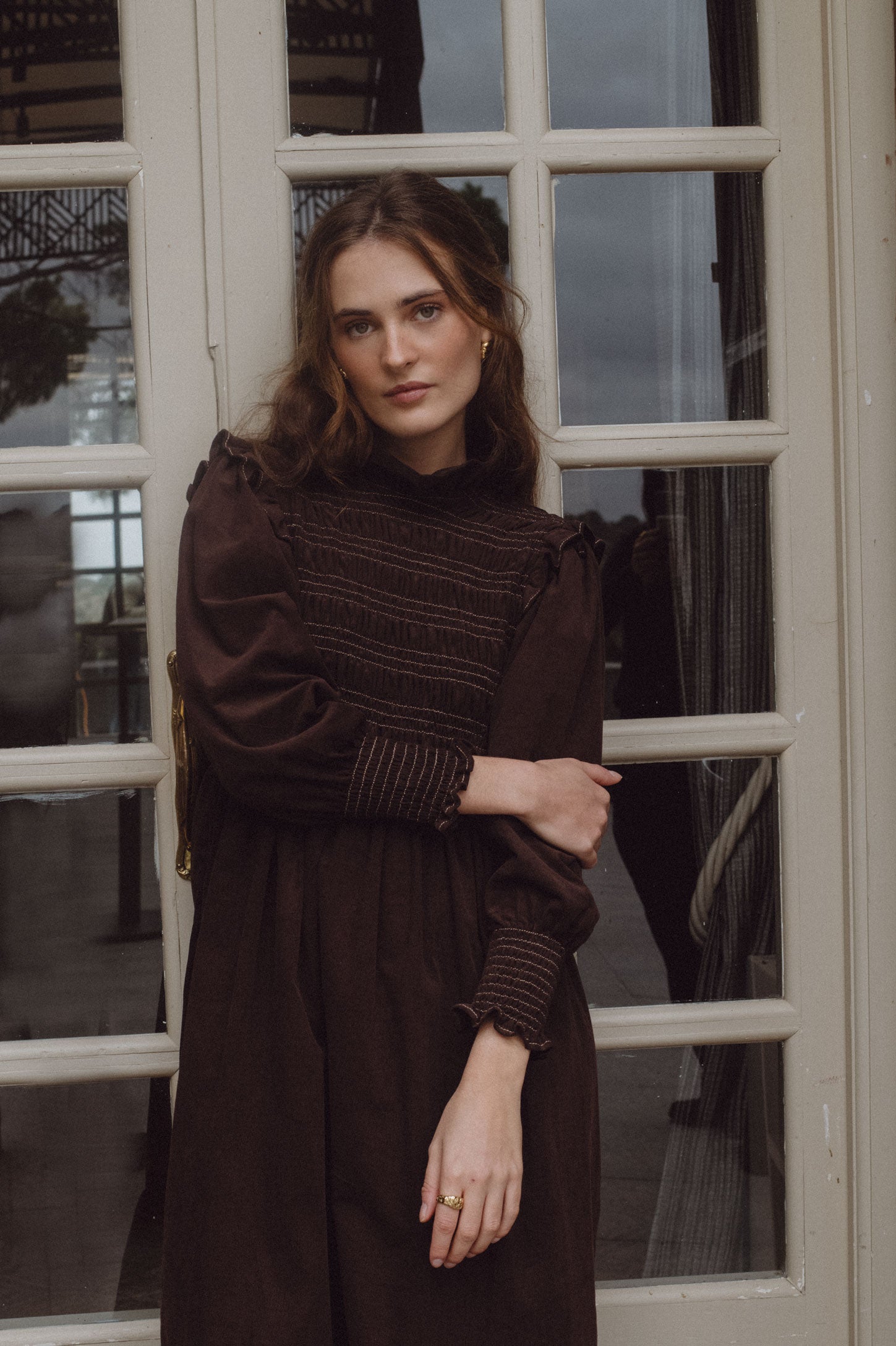 Nuestro vestido Meryl nos transporta a los origenes de nuestra inspiración con esos toques campestres que encontramos en esos tonos marrones tan elegantes.